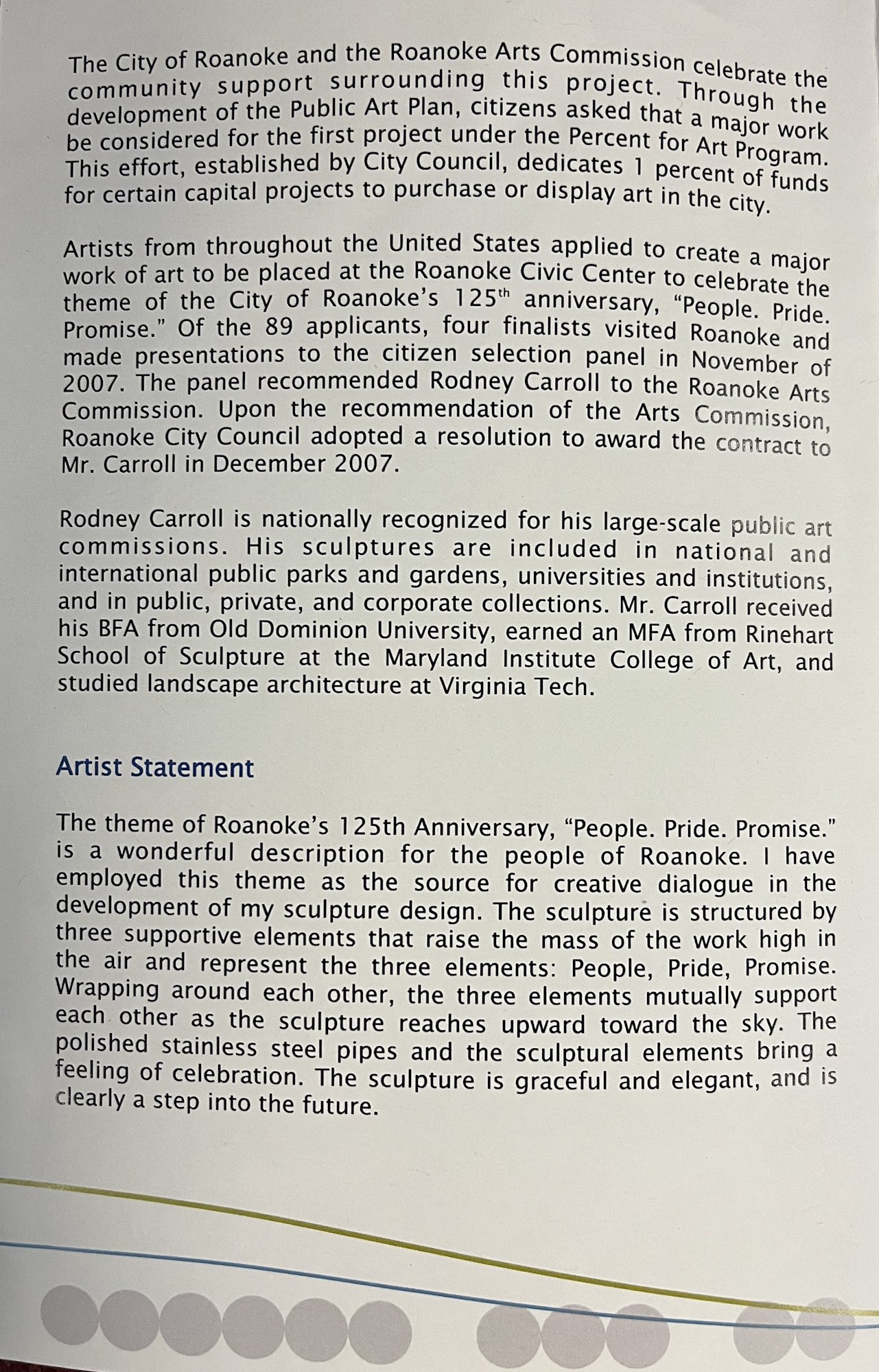 The sculpture entitled 'In My Hands' is a public art sculpture by artist Carroll Rodney who originally crafted this piece to celebrate the city's 125th anniversary and its theme of People, Pride, and Promise. This sculpture was the first project under the Percent for Art Program. Artists from across the United States applied to create a major work of art to be placed at the Roanoke Civic Center to celebrate the theme and out of 89 applicants, artist Rodney Carroll was chosen. Rodney described this stainless steel sculpture as welcoming. As he stated in the dedication pamphlet of "In My Hands," “the sculpture is structured by three supportive elements that raise the mass of the work high in the air and represent the three elements: People, Pride Promise, wrapping around each other, the three elements mutually support each other as the sculpture reaches upward toward the sky. The polished stainless steel pipes and the sculptural elements bring a feeling of celebration.” "In My Hands" is located at the entrance of The Berglund Center.