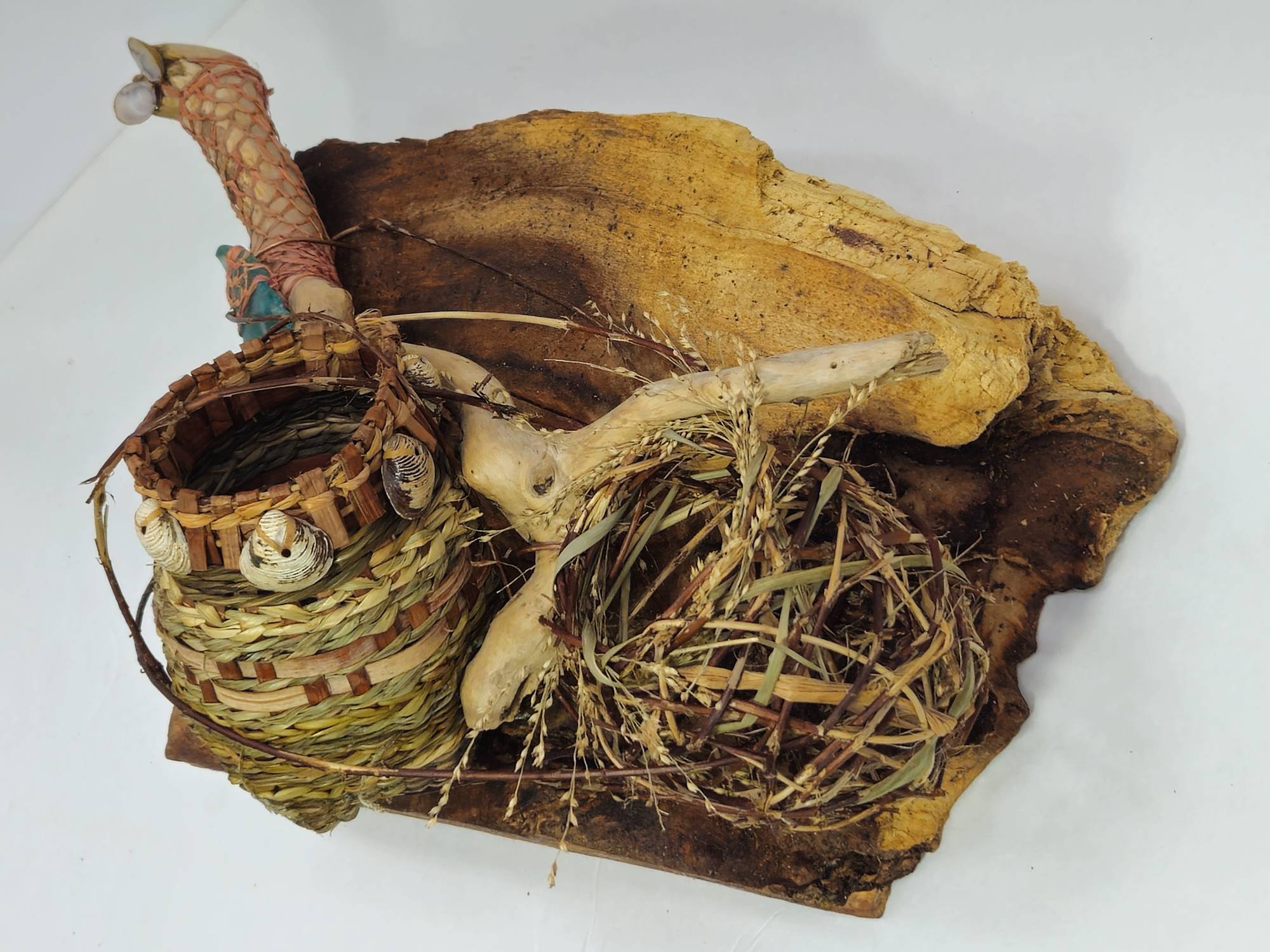 Plants gathered from Tinker Creek are thoughtfully woven amid found objects, intertwining both native and invasive species. “The basket on the left is largely made of native materials, with lespedeza and honeysuckle infiltrating the basket. The basket on the right is largely honeysuckle, with native grasses and pokeweed-dyed raffia infiltrating it.” Burnham explores the blurry lines between ecological disruption, adaptation and resistance to change. “As a native plant gardener, I was horrified by the rampant growth of invasive plants; as a basketmaker, I gathered these same plants to consider using in my creation. I spent a fair amount of time contemplating this dissonance.”