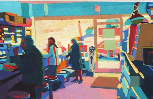 The oil painting entitled 'Lipes' is a public art piece by artist Ann Glover. This colorful piece depicts an inside view of a convenient store. 'Lipes' can be found in the Economic Development Office located in Downtown Roanoke.