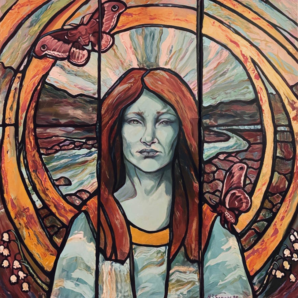 A mournful, saintlike figure haloed by the gold of sycamore bark confronts the viewer as a solemn reminder of “the inevitability of sorrow and pain as part of the human condition.” Accompanying prometheus moths symbolize fragility and suffering, echoing a story from Pilgrim at Tinker Creek. A newly hatched moth is permanently disfigured “due to human interference,” its chrysalis having been placed in a jar by the teacher of the curious children who found it, “a cruelty inflicted by an impartial God.” Religious themes and questions of divine benevolence feature heavily throughout the book, which Scripps also illustrates with lily of the valley, symbols in some Christian traditions of the Virgin Mary’s tears at the foot of the cross.