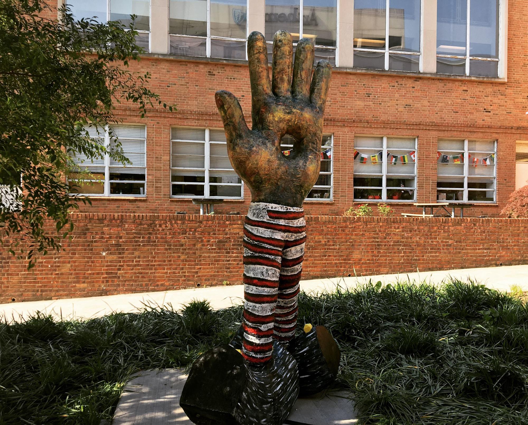 As stated in the "City in Motion- Elmwood Art Walk" webpage, the sculpture weighs 300 lbs. and is made of foam, steel, concrete, fiberglass and paint and resembles a large hand raised in greeting. According to the artist "This piece works primarily with contrasting scale, conveying an ambiguity between materials and subject matter." Mr. Respess has an MFA from Virginia Commonwealth University Department of Sculpture and Extended Media and has been working for many years at the McGuffey Art Center in Charlottesville, as well as teaching in a number of different venues. His work has been displayed in galleries and outdoor locations up and down the East Coast.
