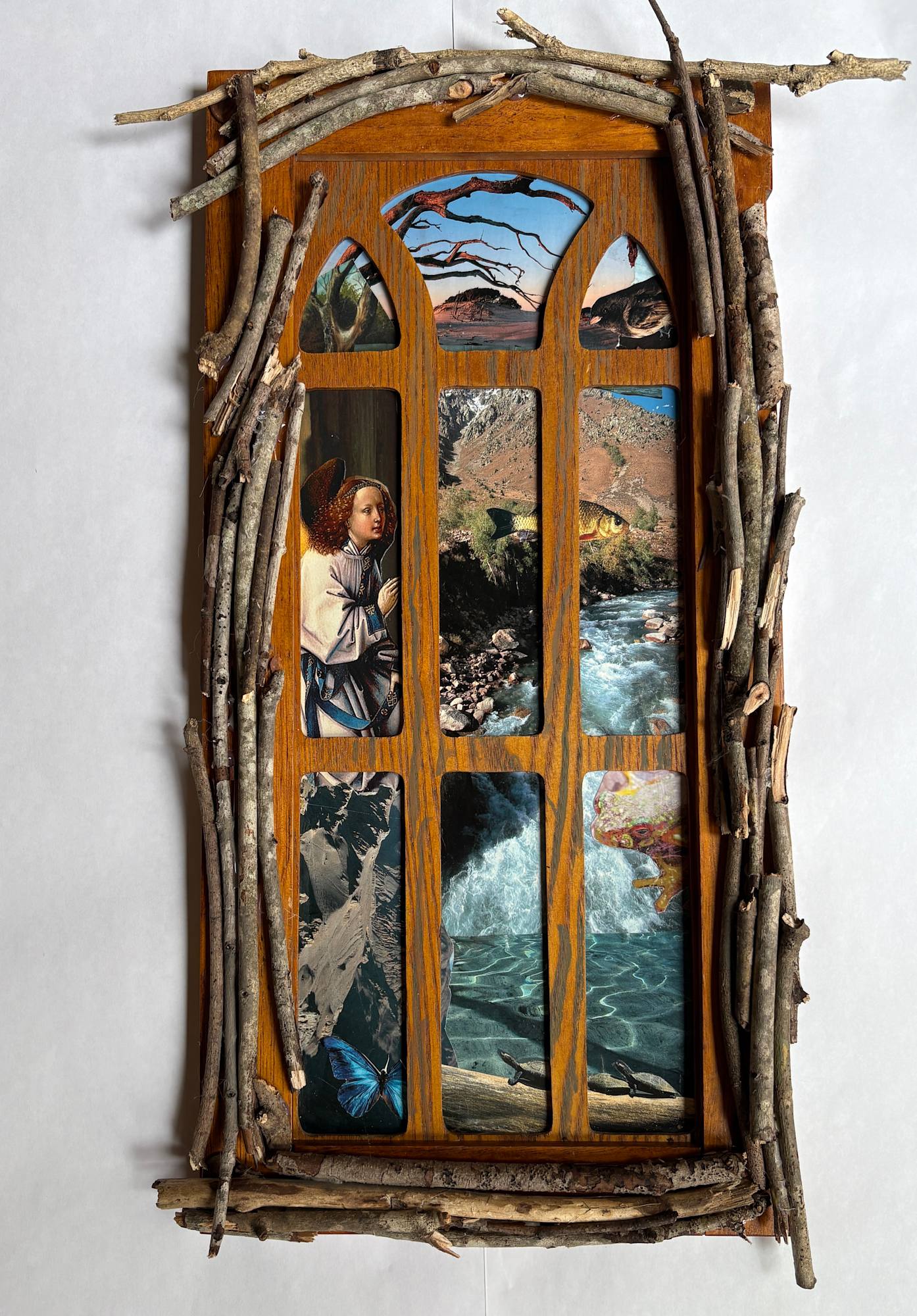 The artist writes, “Inside the rough-hewn frame is a collage of hidden objects – a penny, a frog, some turtles, a bird, a fish, a butterfly. This represents my appreciation for Dillard’s essay, ‘Seeing’. The altar-like format of the piece and the angel represent Dillard’s reverence for nature, and the hidden objects are a testament to Dillard’s attention to the minuscule world around her.”