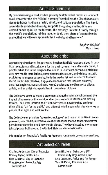 Tucson-based visual artist Stephen Fairfield created 'Global Harmony' for the city's Gateway Park as the result of a national call to mark the 10th anniversary of Roanoke's public art program. Fairfield designed the monumental sculpture with the intention of "expressing Roanoke's valuing of diversity and its importance to the local community, the city, and ultimately on a global basis."