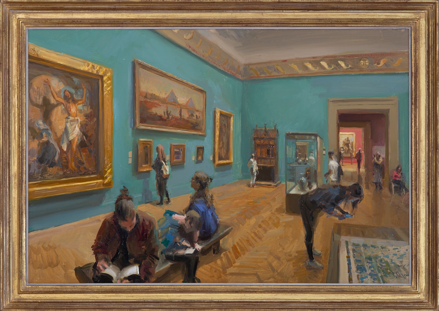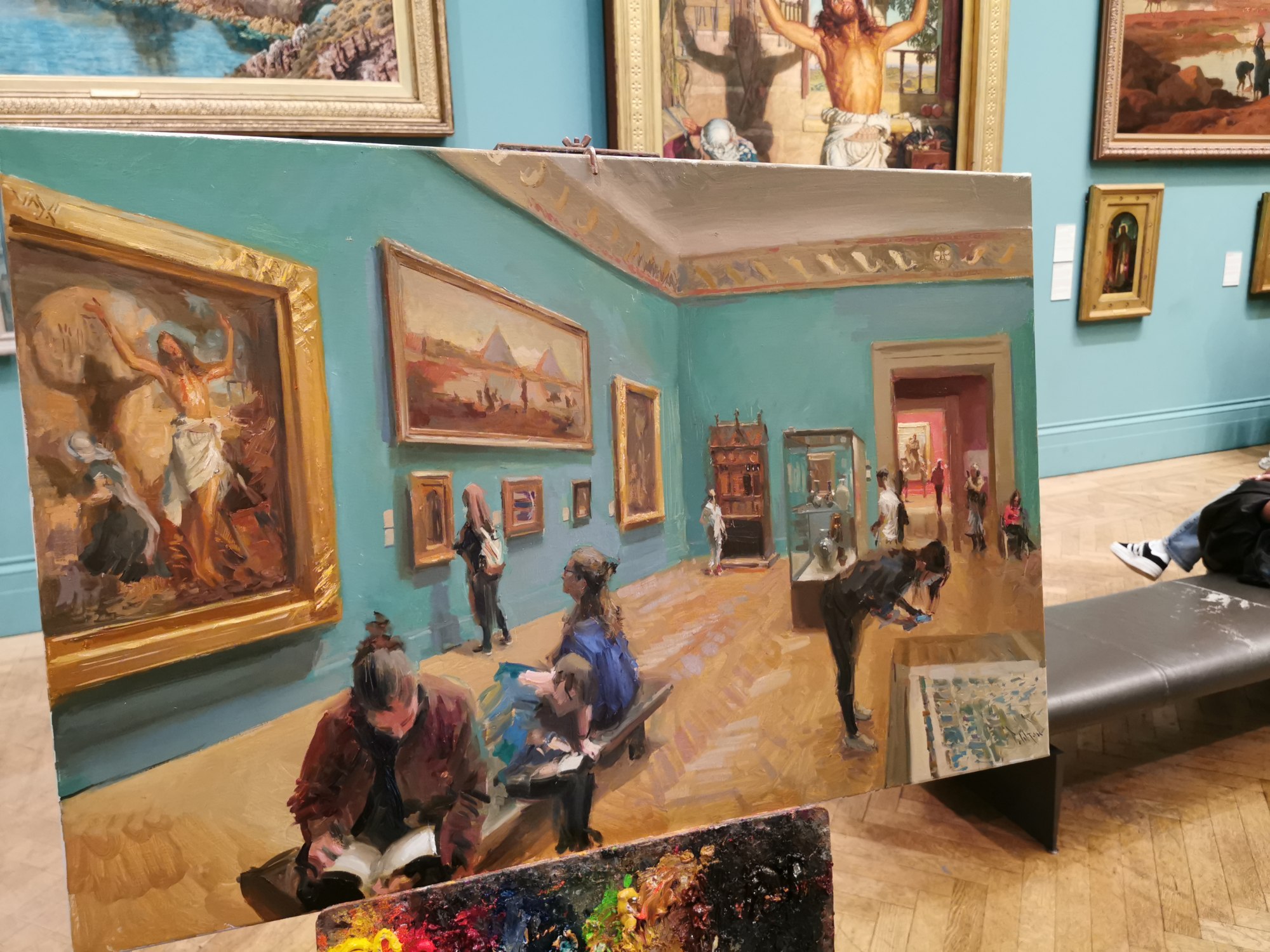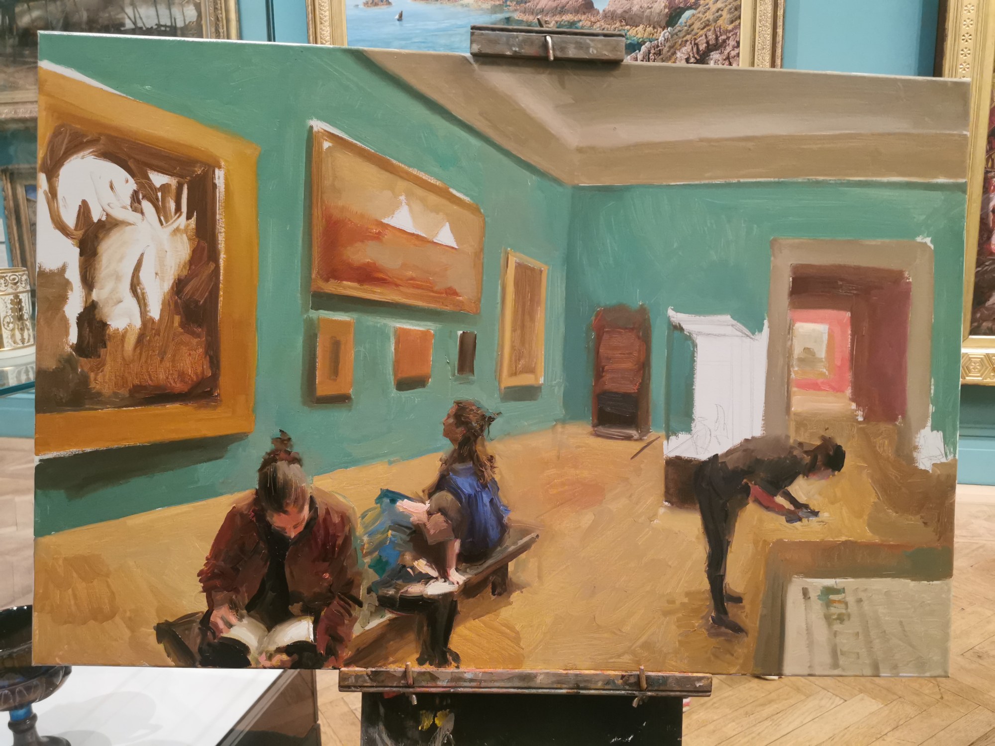 I really enjoy the contrasting wall colours they use in Manchester Art Gallery, the initial draw to paint this scene was the pull through from the cool teal room to the warm red gallery in the distance. I have titled it 'Place of Worship', the religious iconography is obvious within the scene, but primarily because these public art galleries have a sacred quality for me; Art has become my religion, my life's dedication. These hushed spaces, where money and value are removed, become pure spaces of learning and contemplation.