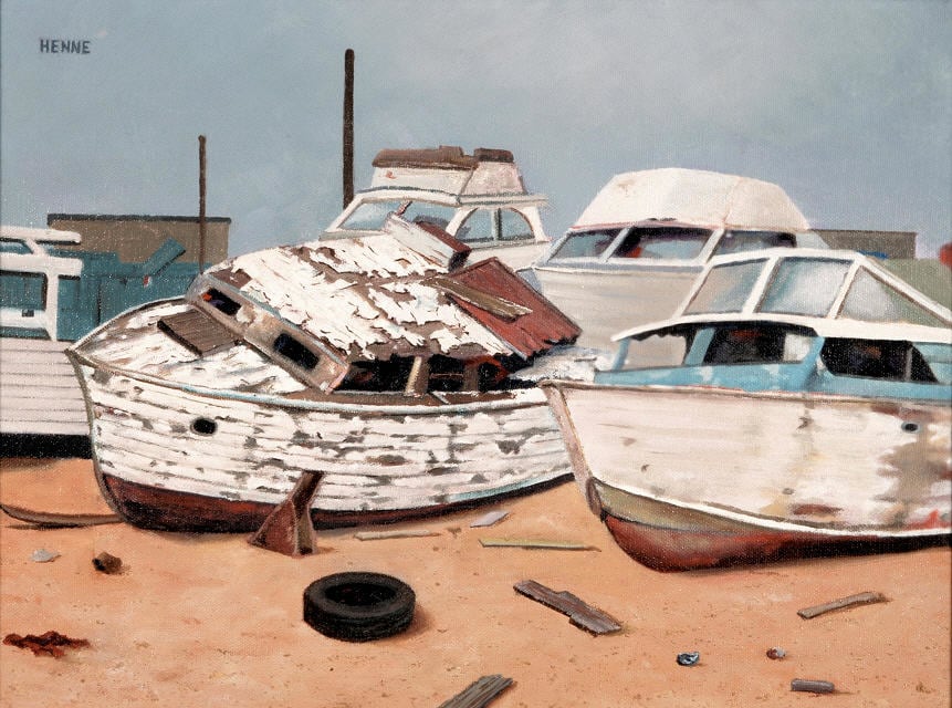 Like two old friends, these old wooden boats are aging gracefully together. Despite the faded paint and broken sections, there is still a beauty and dignity about them.