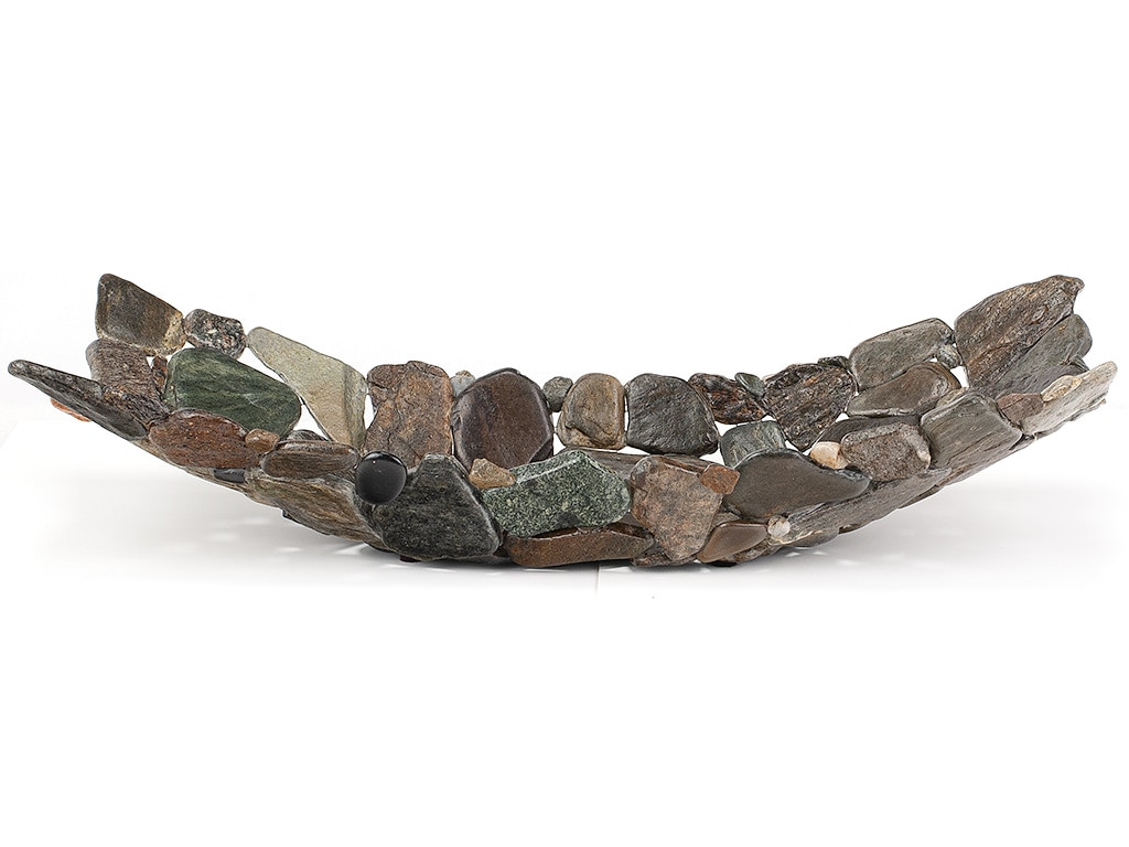 This decorative and functional centerpiece bowl is unique in its' display of the textures and colors of New England beachstone. Created from hand picked beach stone, and coated with a "soft touch" matte sealer, each individual stone looks and feels like it just came out of the surf.
