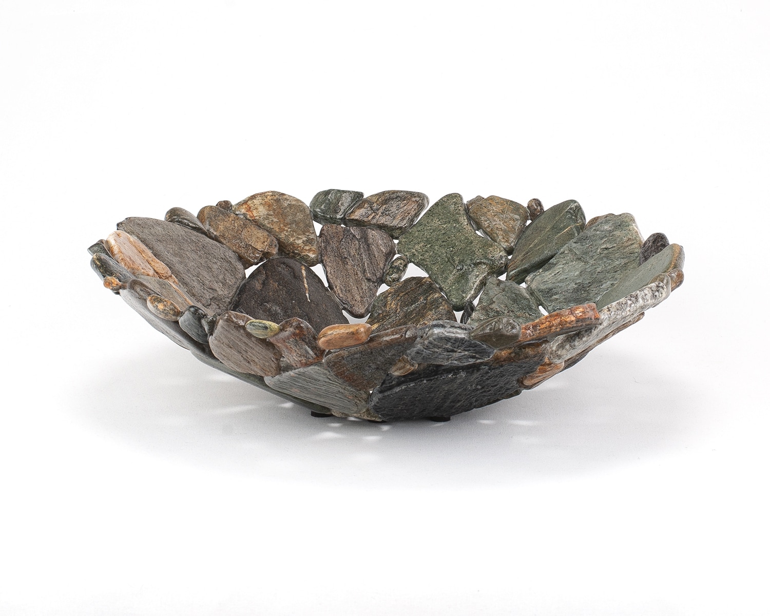 This decorative and functional centerpiece bowl is unique in its' display of the textures and colors of New England beachstone. Created from hand picked beach stone, and coated with a "soft touch" matte sealer, each individual stone looks and feels like it just came out of the surf.