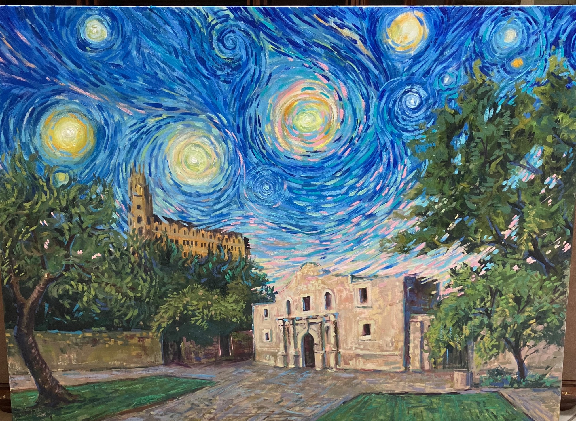 Created at a Live Painting event, The Alamo in the style of Vincent Van Gogh. Done with oil paint sticks.