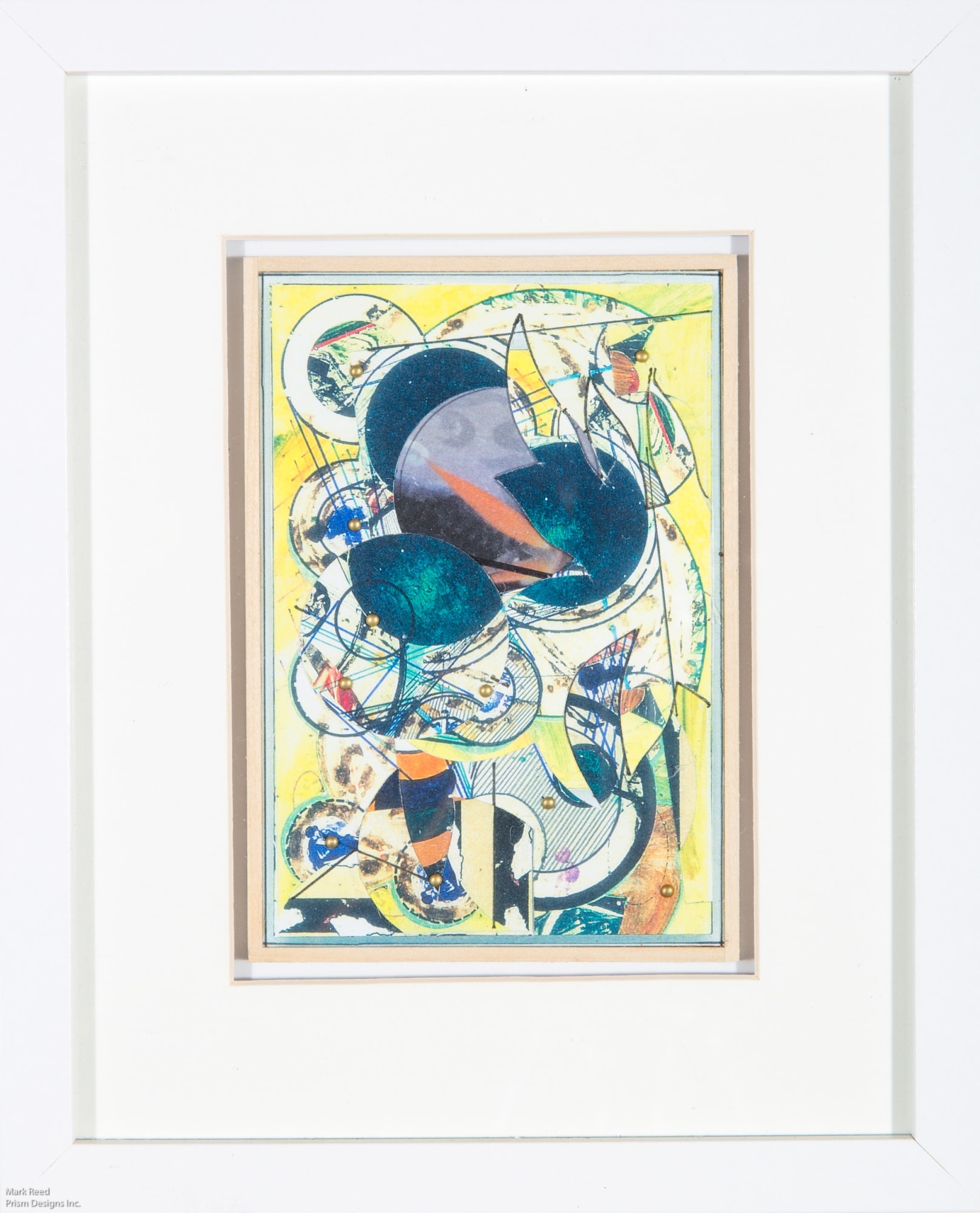Collage - paper, ink, electrostatic printing, metal fasteners, wood frame, glass
