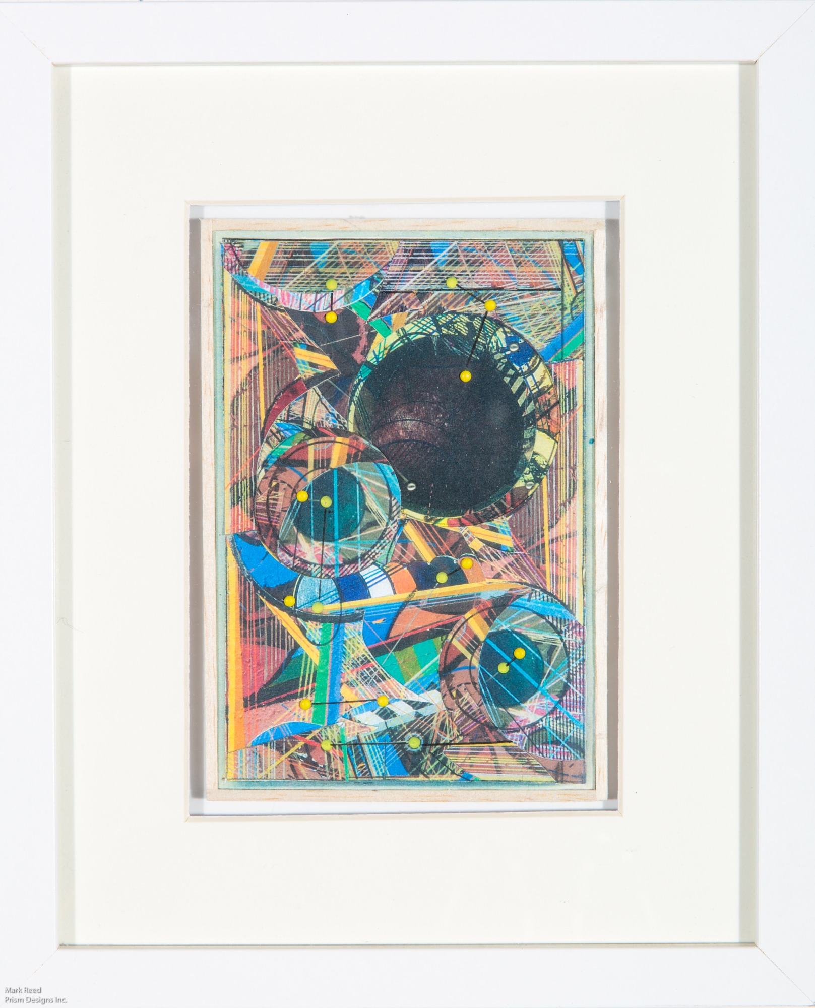 Collage - paper, ink, electrostatic printing, metal fasteners, wood frame, glass