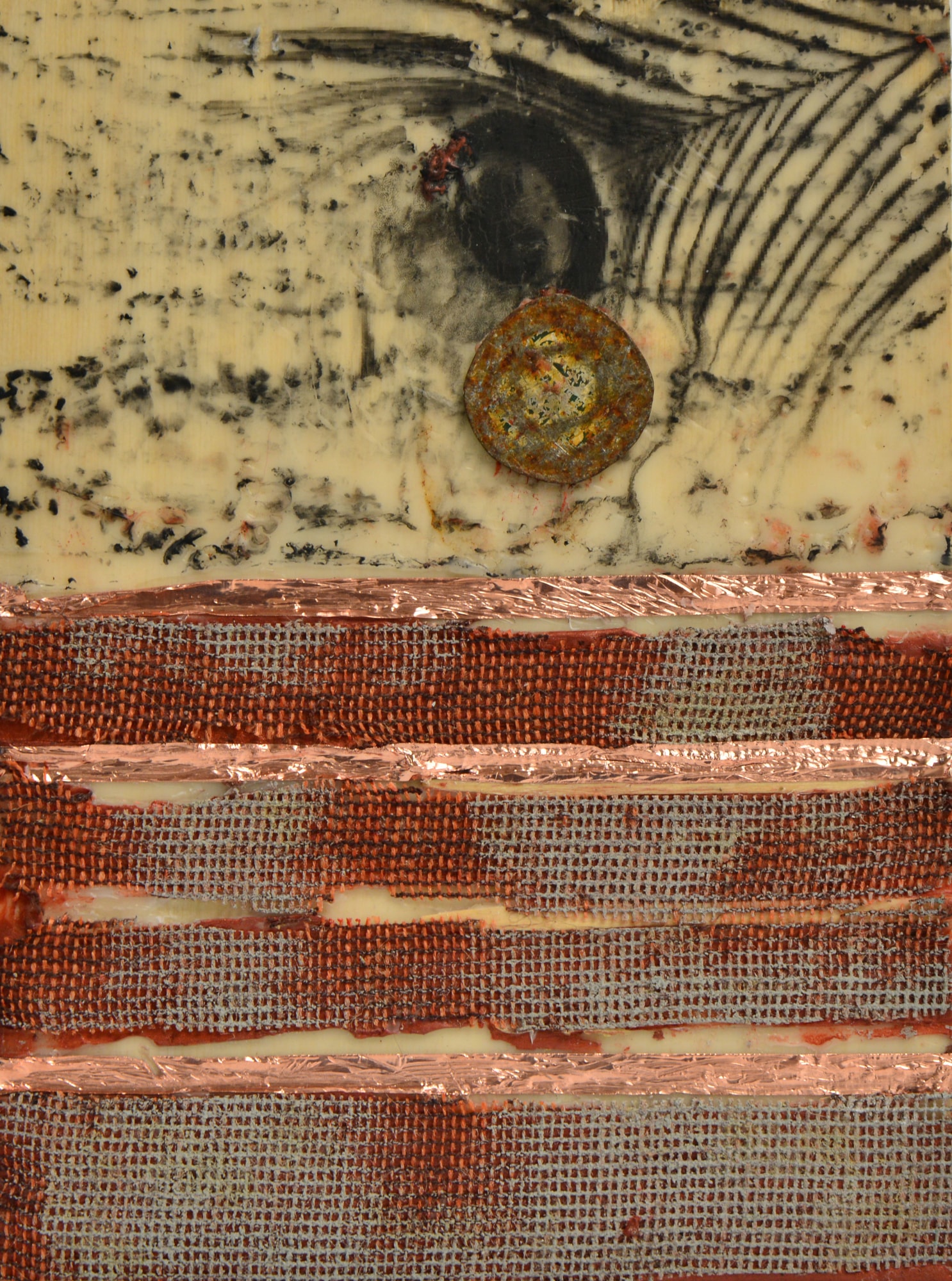 Encaustic Wax, Cement, Metal, Fabric, Image Transfer on Birchwood Board