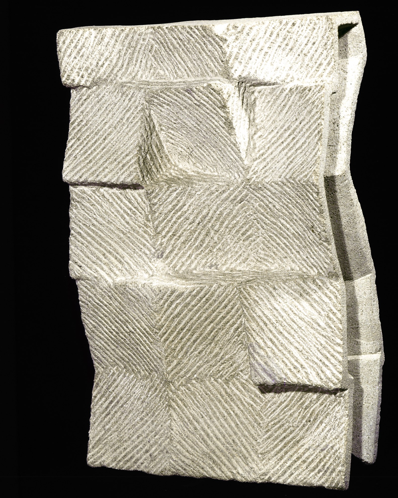 These wall-like works transform repetition into excitement. Tension is created by the interlocking of forms from the front to the back, creating conflicts from the overlapping effect. Texture versus form, soft versus hard. Movement, energy, conflict. Like the patterns of society. Each form fights for its own individuality, as in life itself. Created in 1981. Carved out of limestone. Dimensions: 18"h X 12"w X 4"d. On a pedestal 42"h. Please feel free to reach out and email me at [email protected] to discuss installation and display or any other concerns you might have.