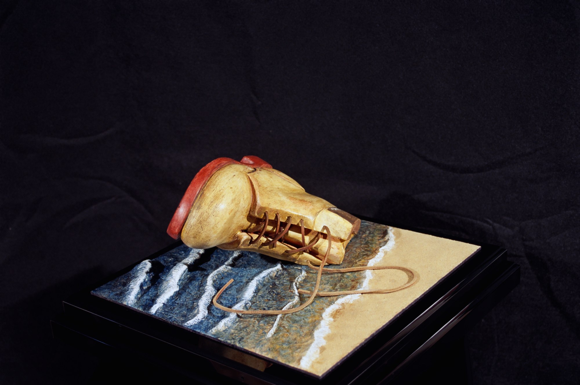 Sand-colored Israeli Limestone. Created in 1999. While participating in an archaeological dig with my family, I came across this unusual piece of unattached limestone which I took as a souvenir (with permission, of course.) The boot, which is a recurring theme in my work, represents an ordinary person who makes his mark in this world. In this case, what came to me is a boot washed up on the shore; the contrast between an active and passive approach to life. Dimensions: 6.5"h X 11.5 X 4.5"d. Please feel free to reach out and email me at [email protected] to discuss installation and display or any other concerns you might have.