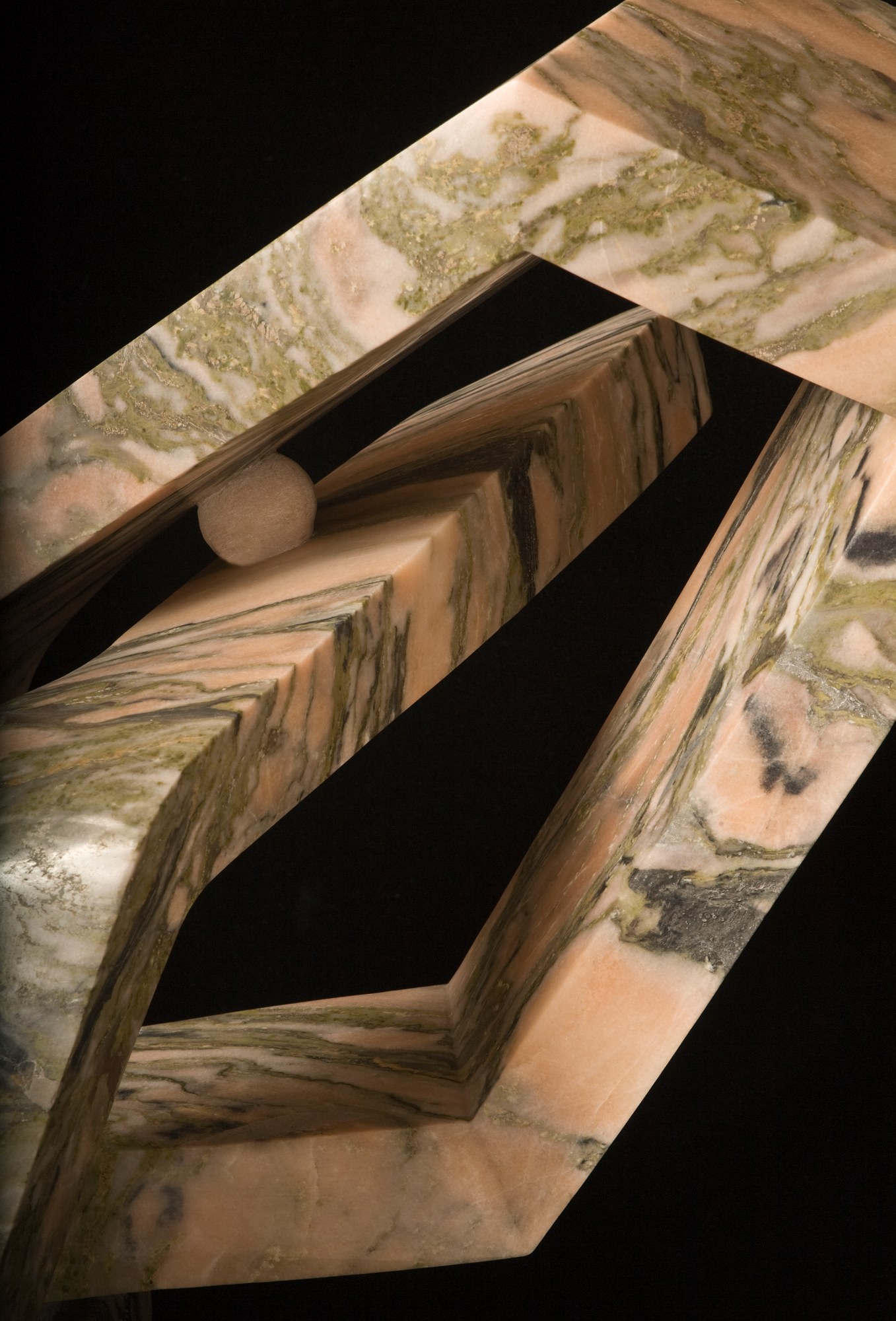 Stone Knots: the anxieties and difficulties of raising children. THE STORY BEHIND THE D KNOTS My youngest son was struggling with drug addiction so I decided to make three knots in his honor, to represent my frustration: D Knot #1, D Knot #2 and D Knot #3. Just like my son, this work of art is a study in contradictions: a hard, heavy stone that appears to be pliable, graceful and elegant. D Knot # 1 was created in 2010. It is carved from a single piece of Watermelon Marble. Dimensions: 17”h X 40”w X 17”d. This piece is on a pedestal. Please feel free to reach out and email me at [email protected] to discuss installation and display or any other concerns you might