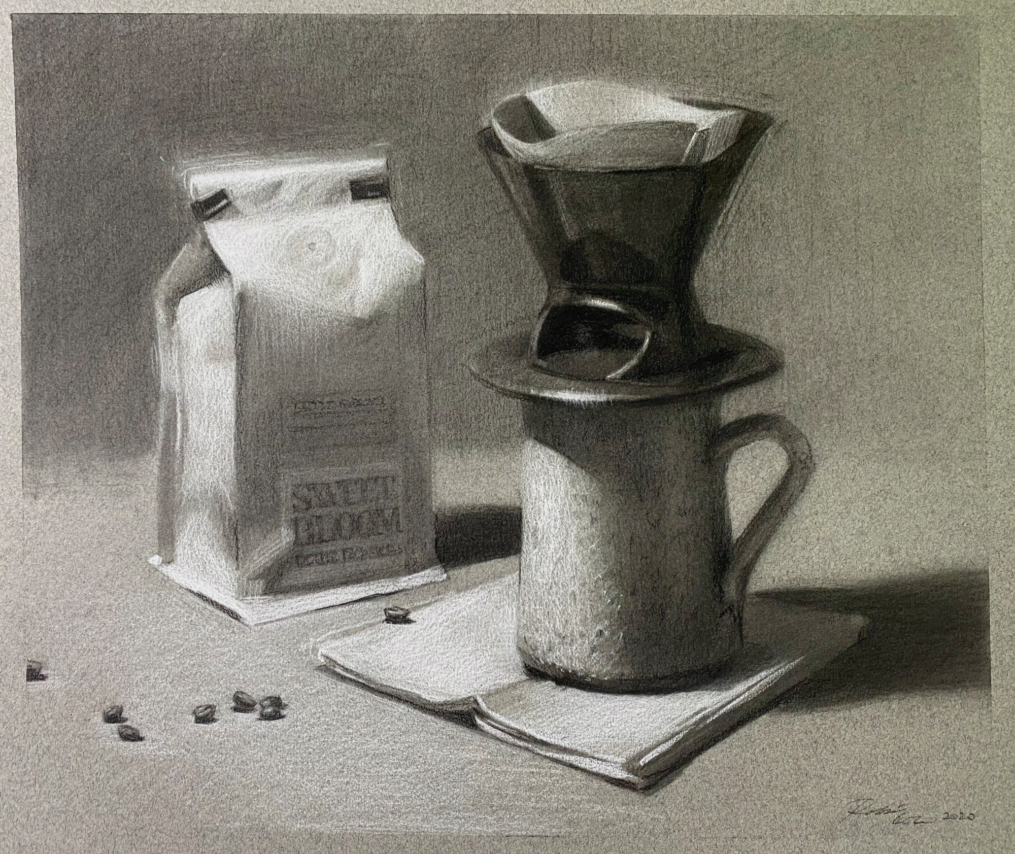 The first in a series of three drawings featuring some of the staples and/or casualties of quarantine, in this case, coffee, without which we never would have survived. And while we've always enjoyed making coffee in the morning from quality, fresh-ground beans, the ritual took on a new significance and level of enjoyment when it became the single source of coffee in our lives with the closure of shops, cancellations of coffee dates with friends, and trepidation around drinking from a to-go cup prepared by someone outside our family. We cut back on our ordering from online companies in favor of supporting local businesses, such as Sweet Bloom.