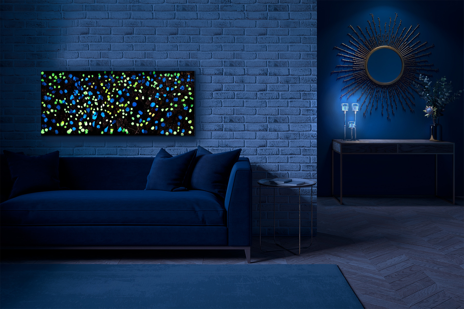 This panoramic, forest inspired piece as part of one of my most favourite series typically the series has been massive but this piece of scale down considerably which has added a density to the foliage and overall impact the colours have used cover the entire spectrum with some classical italics added to the mix! The additional special effect is the UV pigment which has been added to the resin making areas of the background foliage glow in the dark.