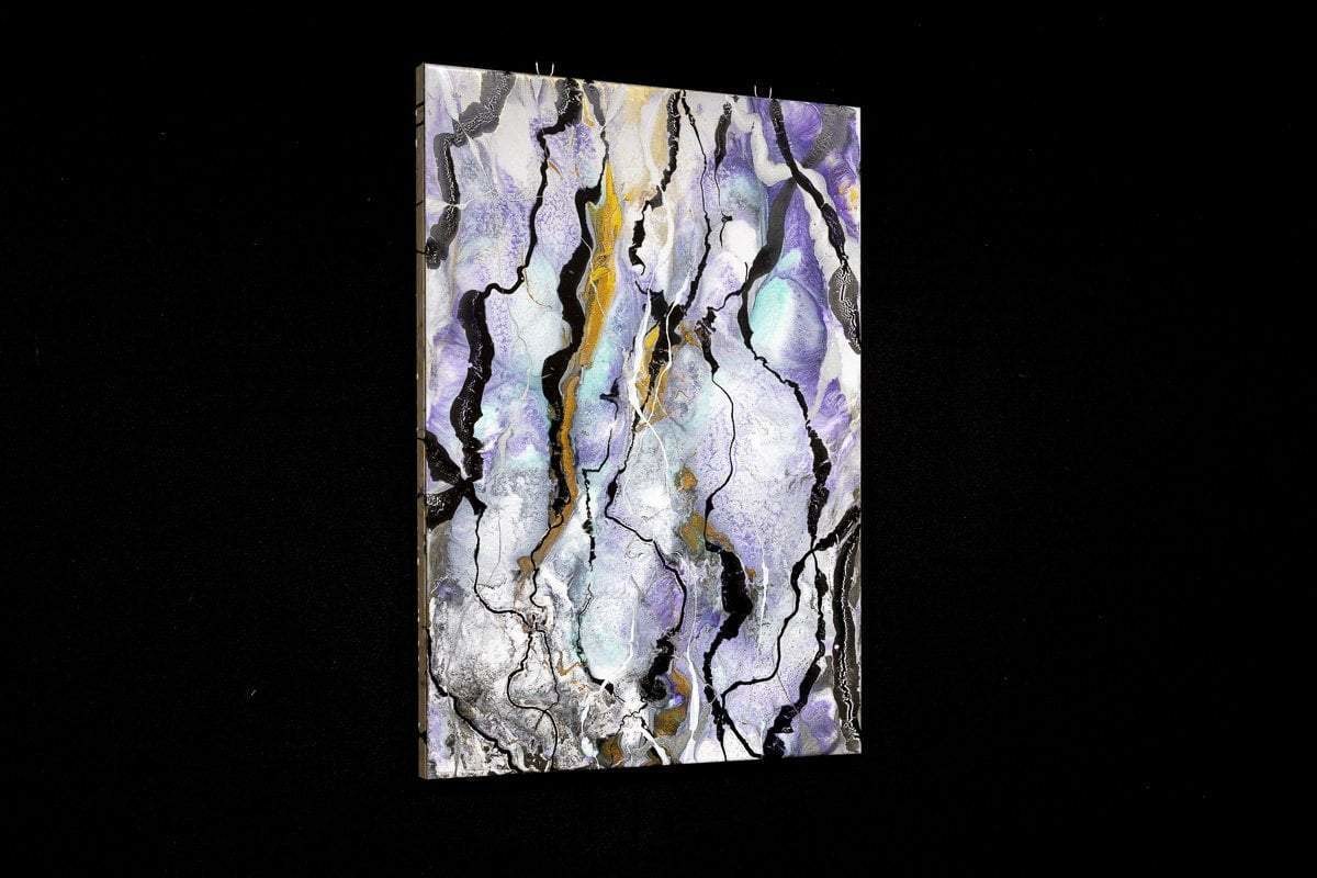 Painted purely with coloured resin I’ve poured the colours into each other and used a tilting process to let them bleed in a fluid fashion. I enjoy the pallet of whites and purples as they are very feminine and the black contrast adds a balance to the composition and movement.