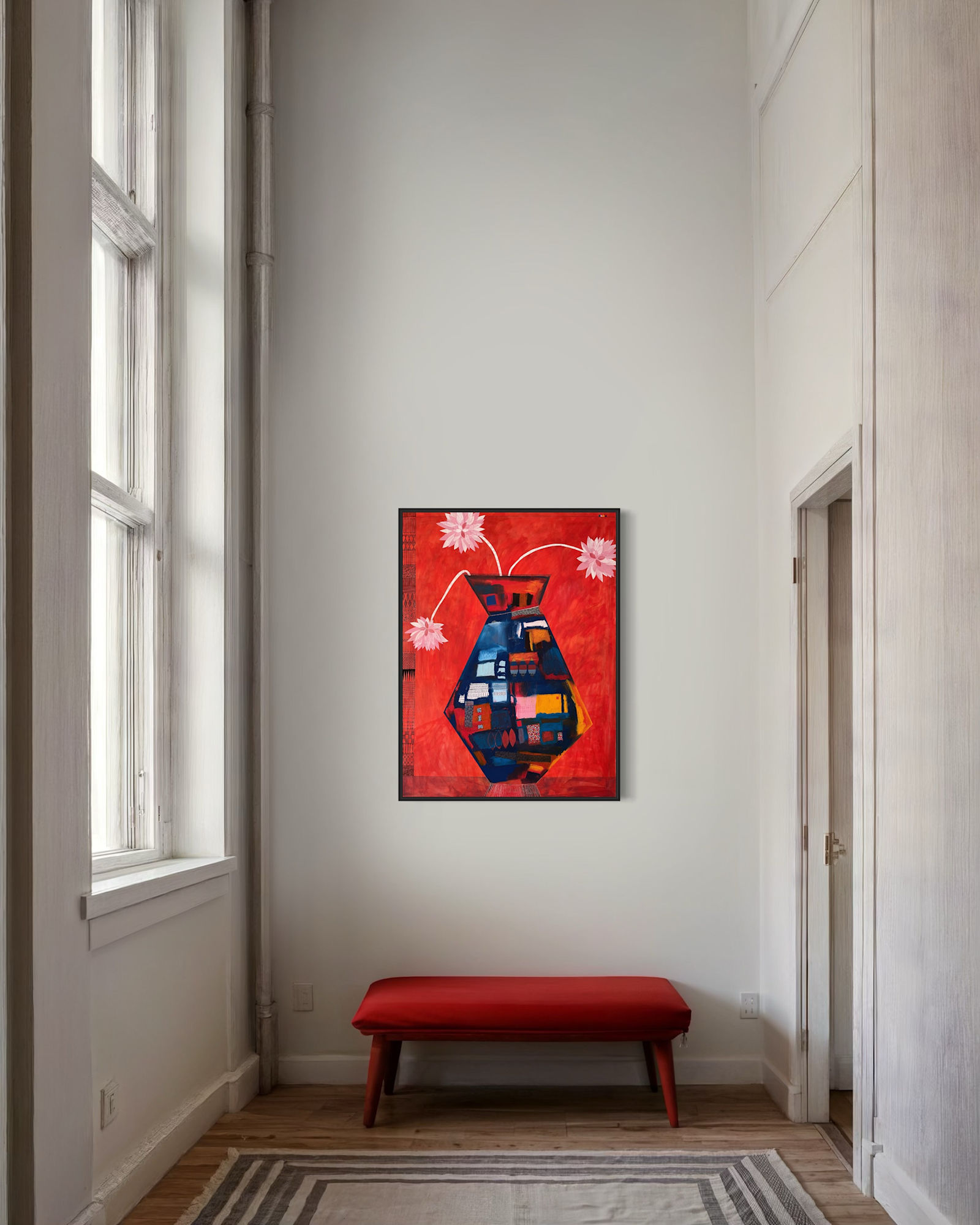 Acrylic paint, ink and wax pencil on panel, black wood floating frame, ready to hang