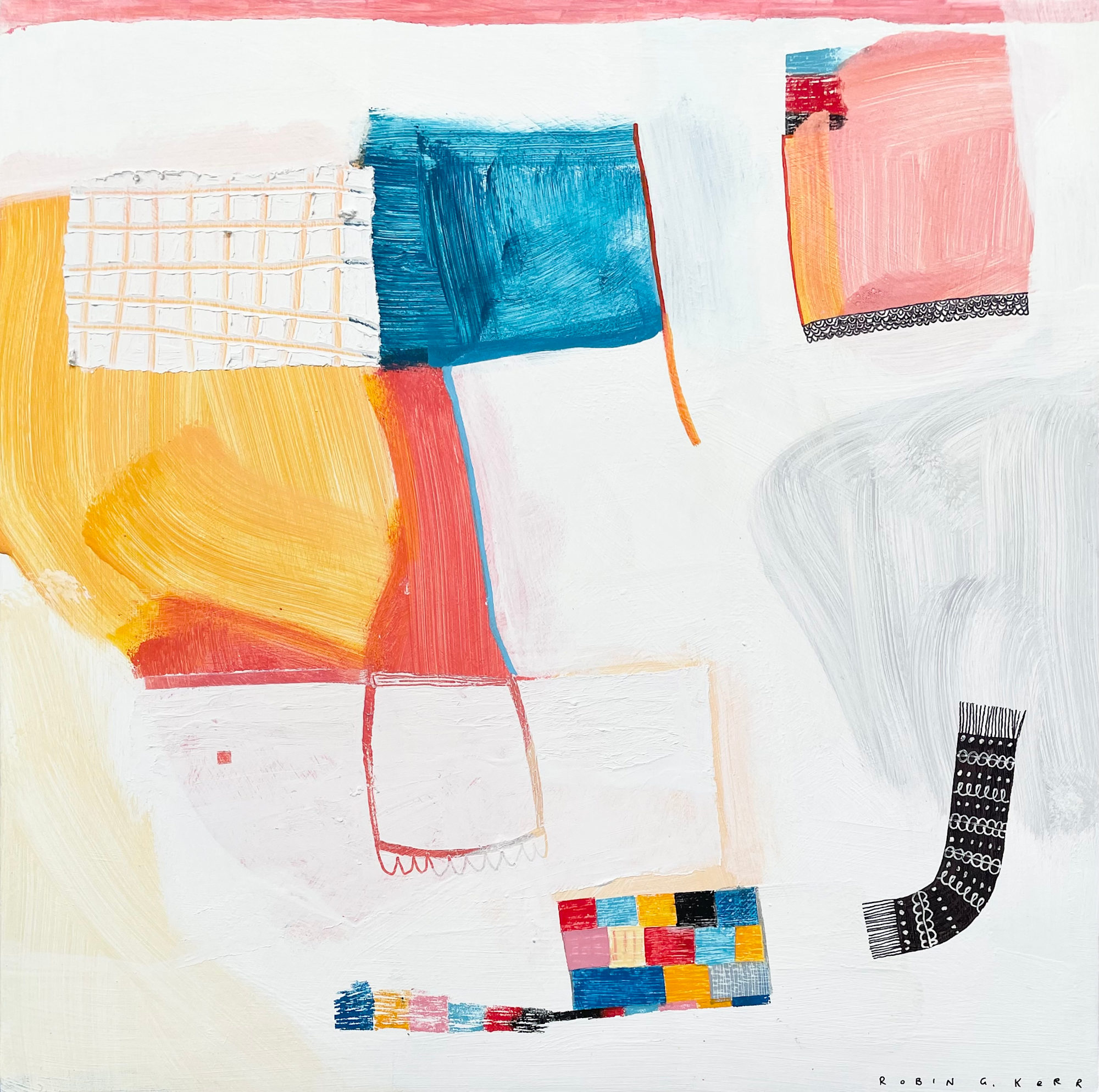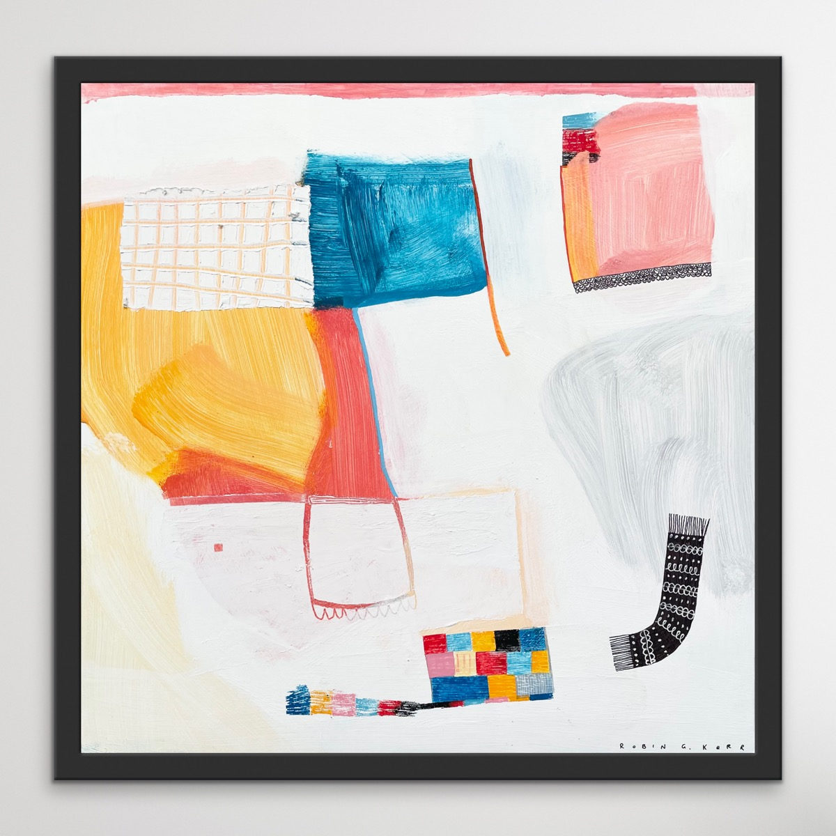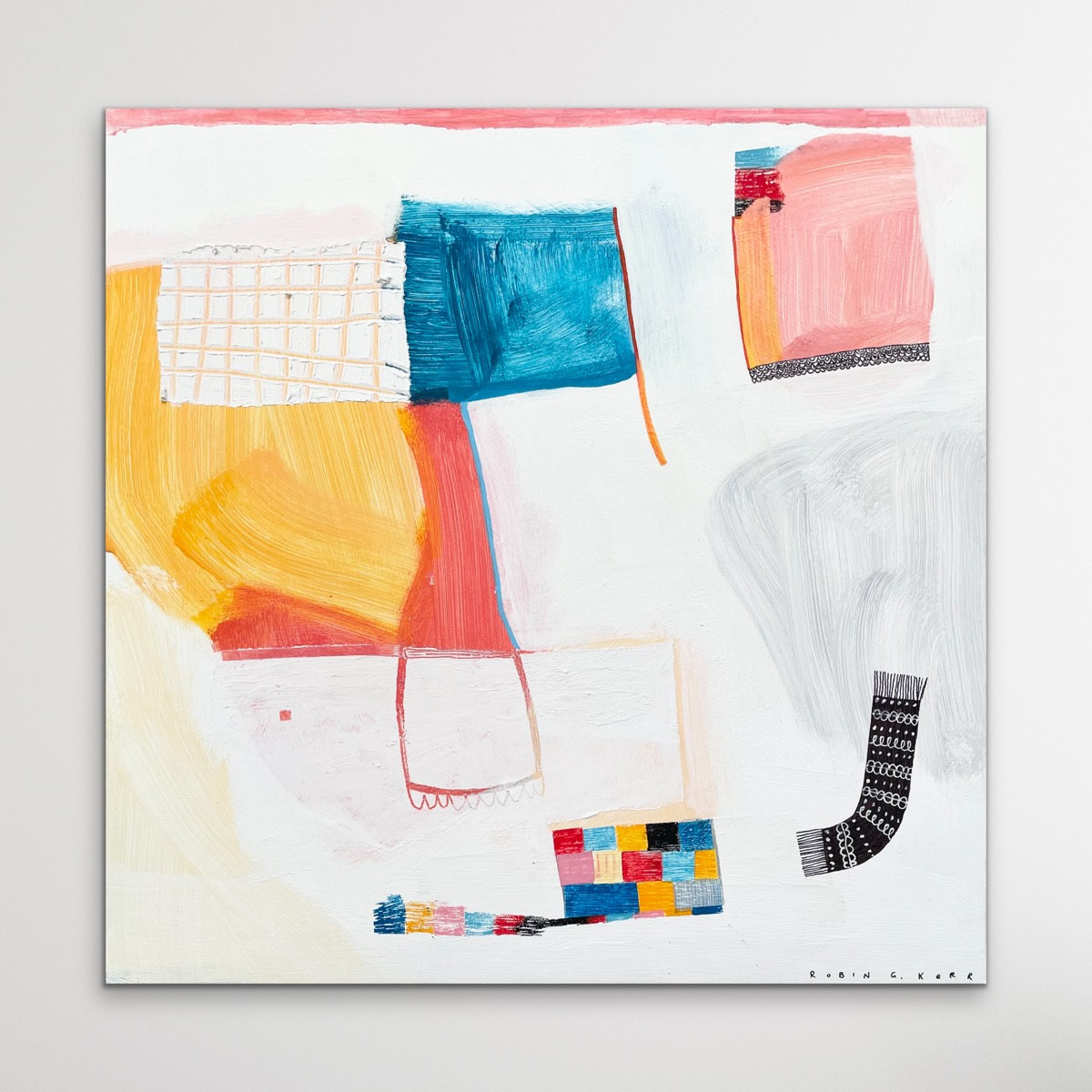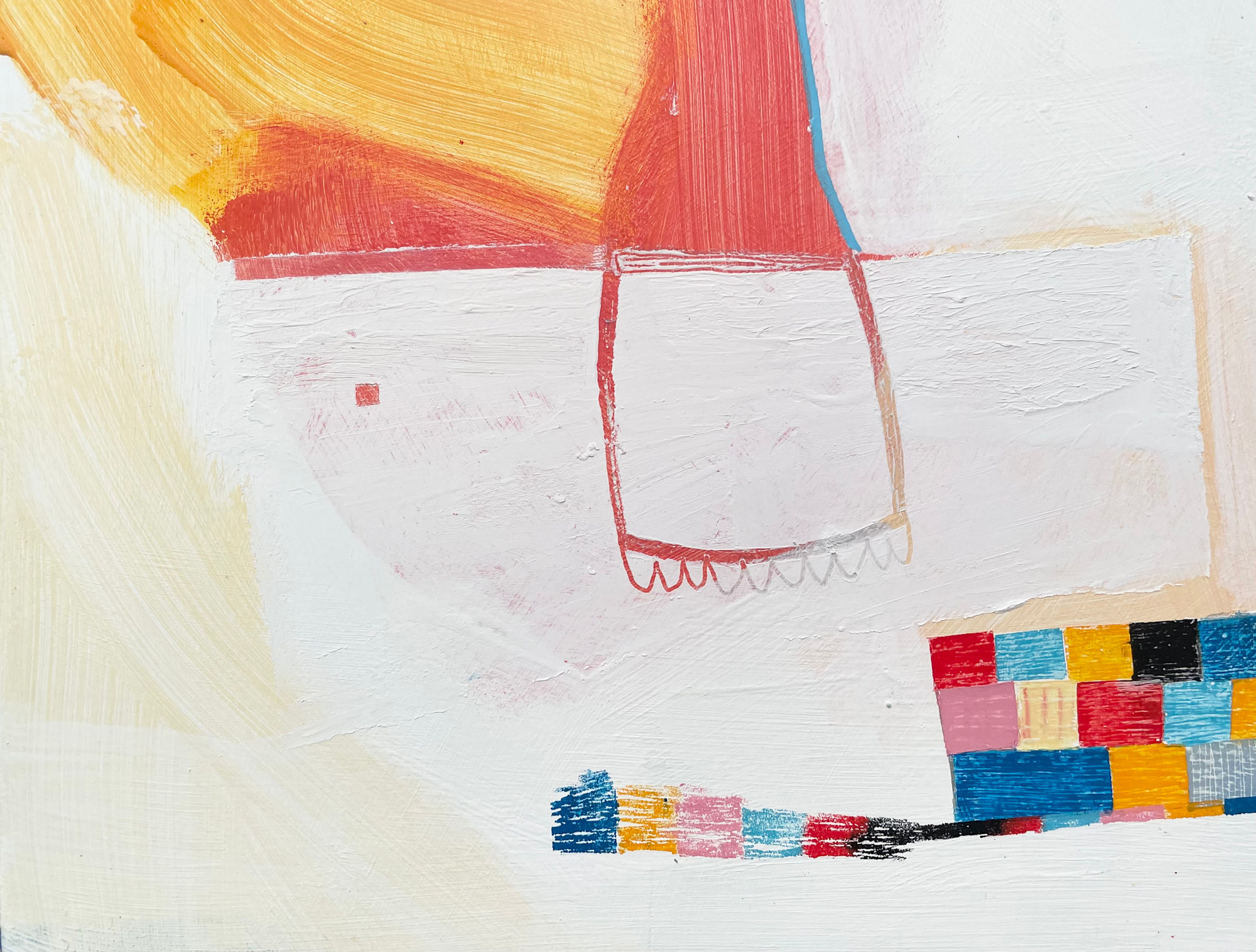 • Acrylic paint, wax pastel, ink, on birch panel, framed