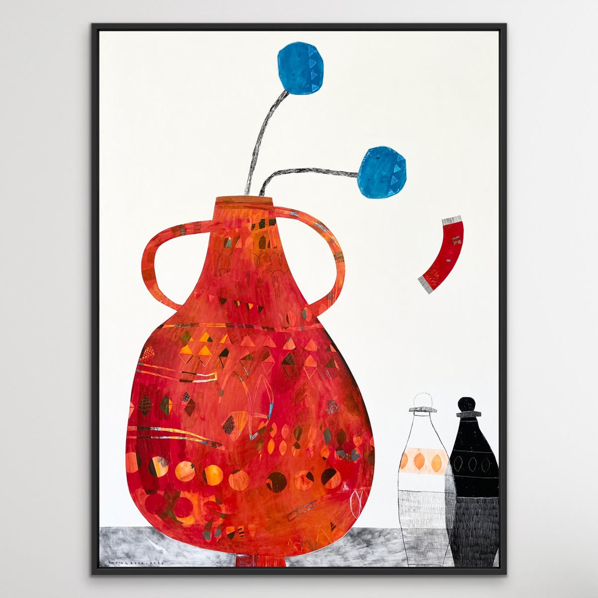 Acrylic paint, ink and wax pencil on panel, black wood floating frame, ready to hang