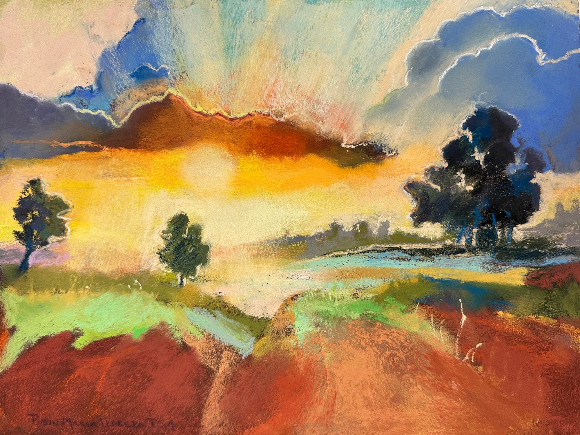 In Sage Advice, warm earth tones meet luminous sky in a vibrant, dreamlike landscape. A radiant sun bursts through moody clouds, casting golden light across a rolling terrain of sienna, sage, and chartreuse. Trees stand as silent sentinels—each one holding its ground as if whispering timeless wisdom through the breeze. With bold color choices and rich texture, this piece invites contemplation and a moment of quiet clarity, like the kind of insight that comes from nature itself.