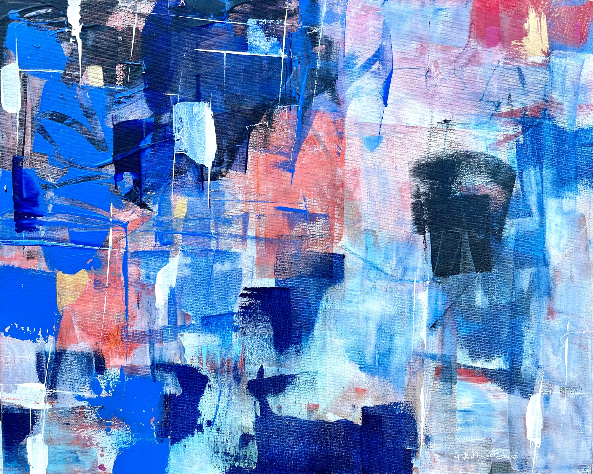 I enjoy how the sun filters through living spaces and casts shadows and reflects warm colors into the spaces and my mind roams and explores both the solids and morphed forms. The blues, pinks, and lights create a scintillating work of art that will bring delight and conversation to a space.