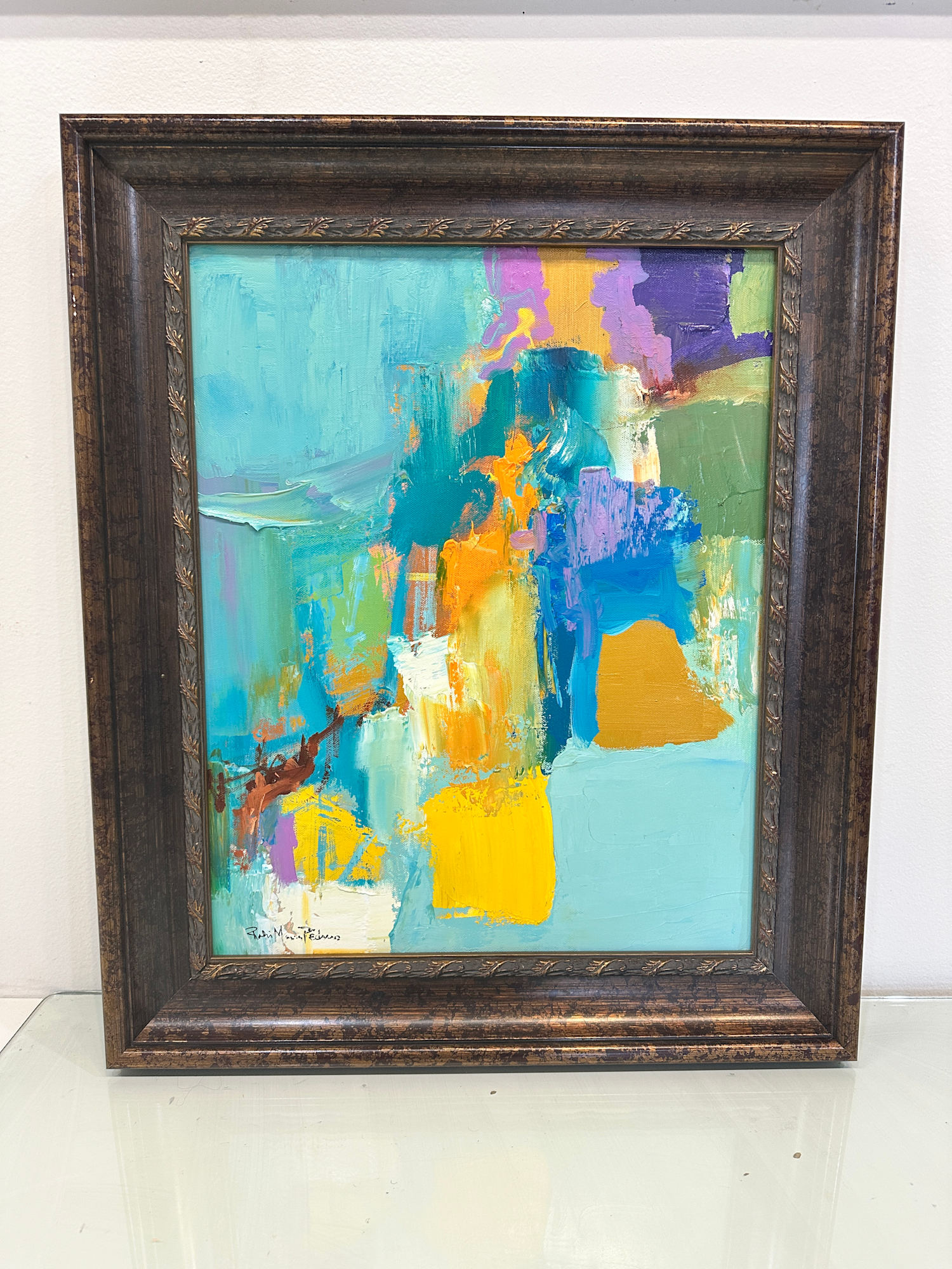 “Tides in Transition” captures the sensation of viewing the shoreline from above as shifting waters meet the land. Layers of turquoise, gold, and deep blue flow together like waves in motion, while touches of orange and violet suggest the warmth of sunlight reflecting on the sea’s surface. The textured brushwork mirrors the rhythm of the tides, ever-changing, fluid, and full of quiet energy. This expressive abstract invites the viewer to pause and feel the pulse of nature’s movement from a serene, elevated perspective.