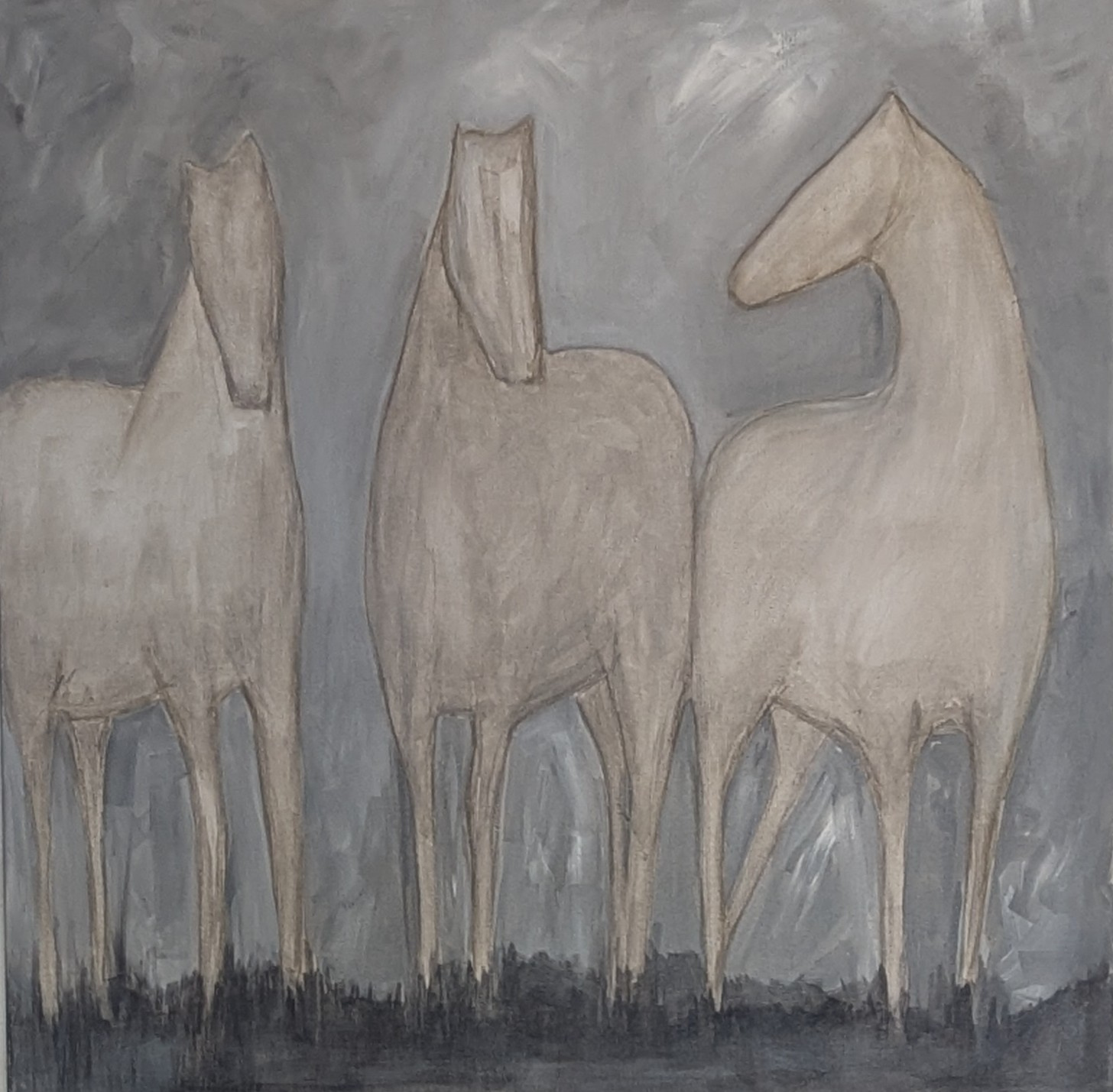 The artwork features three abstract horse figures standing side by side. The forms are simplified, with elongated legs and minimal detailing on the bodies. The horses are painted in muted, neutral tones ranging from light beige to soft gray, blending subtly into the similarly colored, textured background. The overall composition conveys a serene, almost ghostly presence with an emphasis on form and shape rather than realistic depiction. The brushstrokes are soft, creating a smooth, blended appearance throughout the piece.