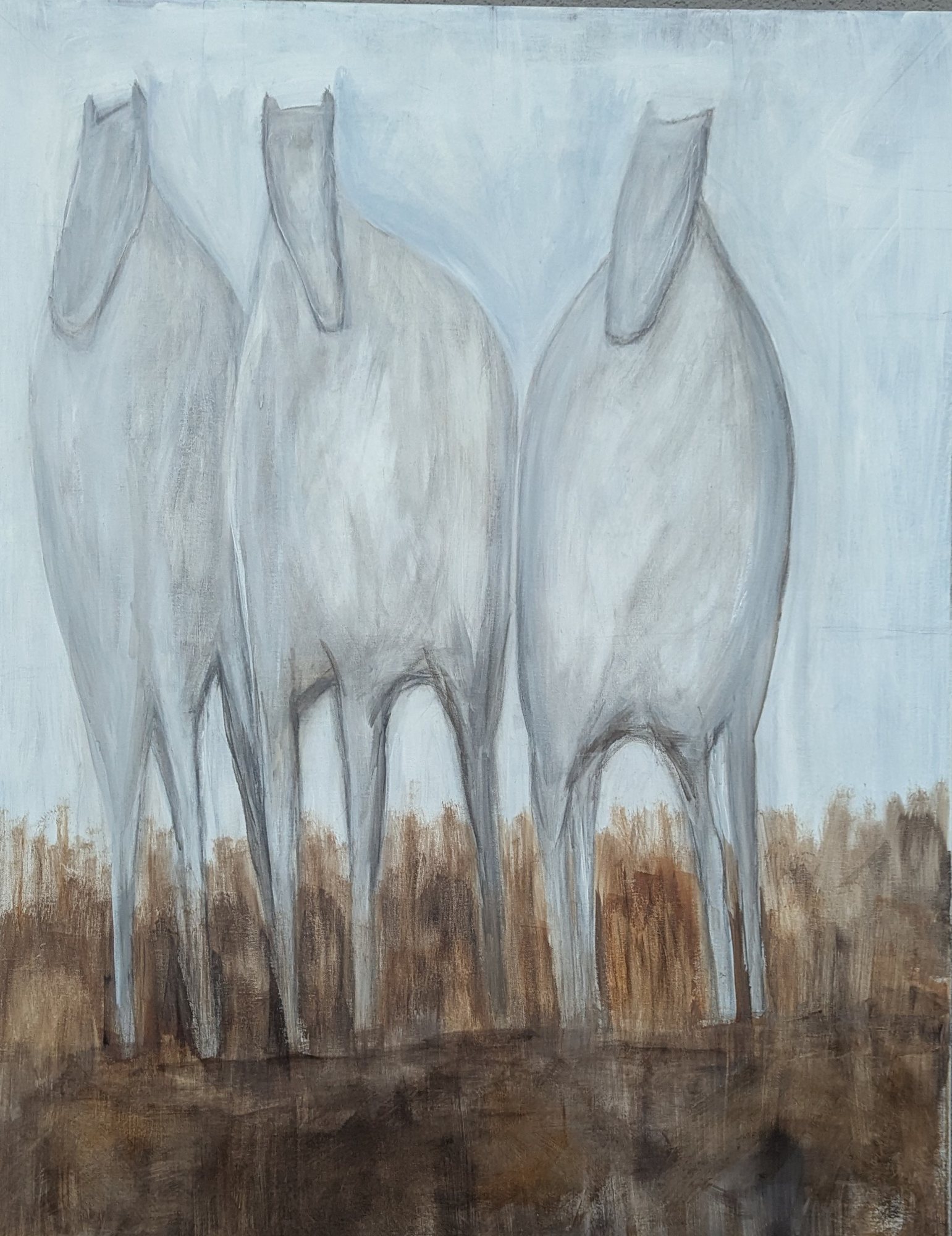The artwork depicts three elongated, ghostly white horses standing closely together. Their forms are simplified and abstract, with minimal details on the faces and bodies, lending a spectral, ethereal quality to the scene. The horses are set against a muted, pale blue background that contrasts with the earthy brown and black ground beneath them. The overall tone is subdued and soft, with gentle shading and blurred edges that create a sense of unity and quiet presence among the horses. The composition focuses on the verticality and slenderness of the horses’ legs, emphasizing their graceful but otherworldly stance.