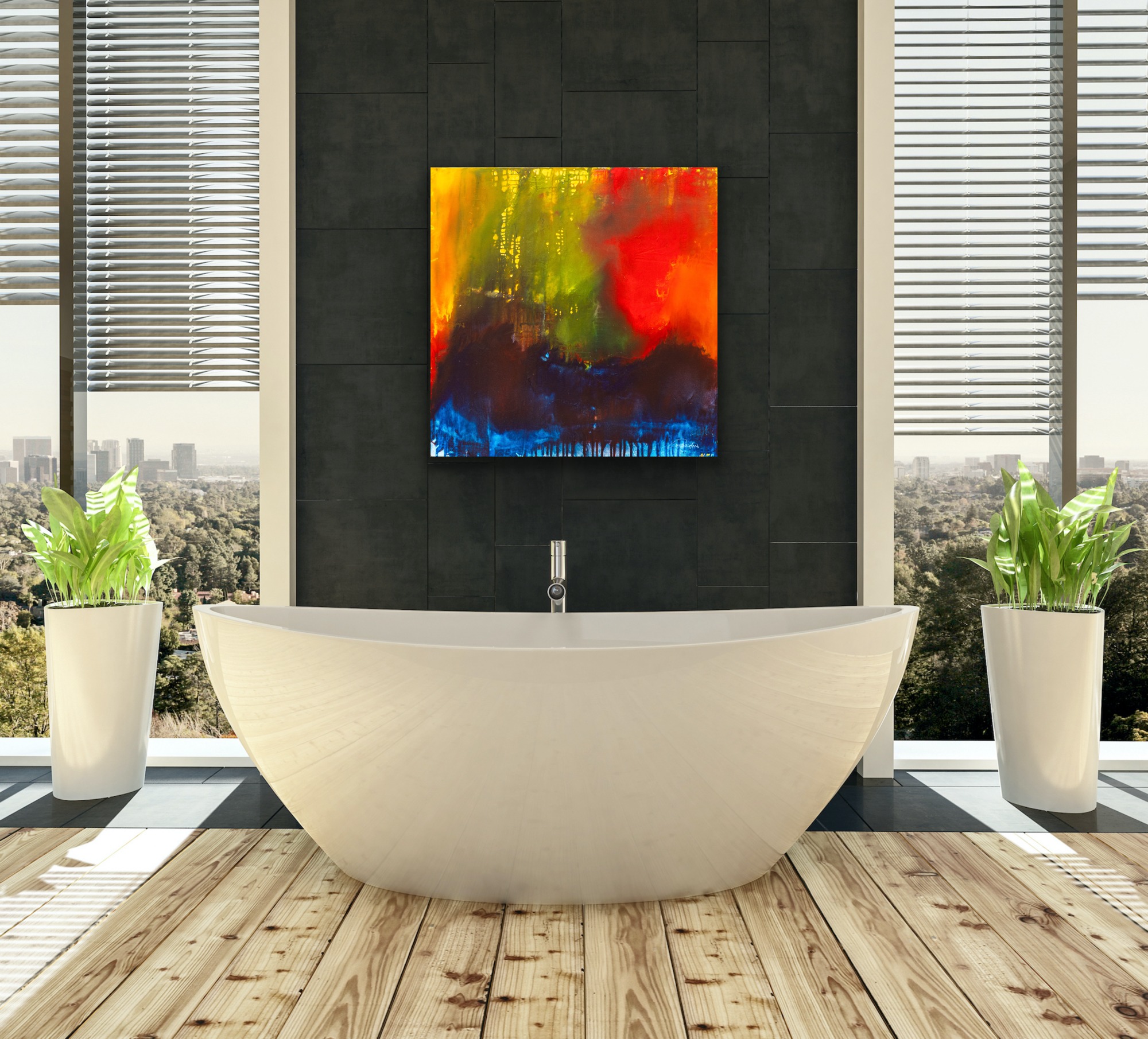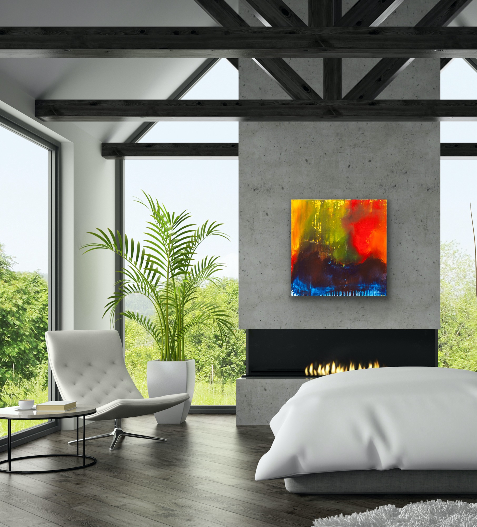 "Afterglow" is a captivating artwork that celebrates the ethereal beauty of nature's most transient scenes. Measuring 36 x 36 inches, this acrylic on canvas piece is a vibrant symphony of colors. Its bold and eye-catching design tells a compelling story through abstract expression, inviting viewers to explore its intricacies.