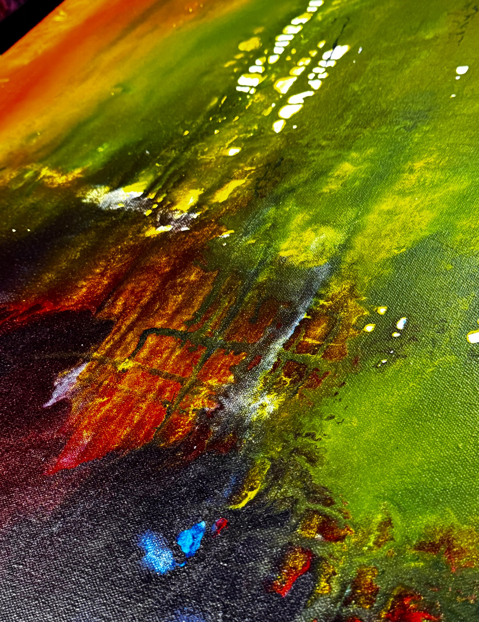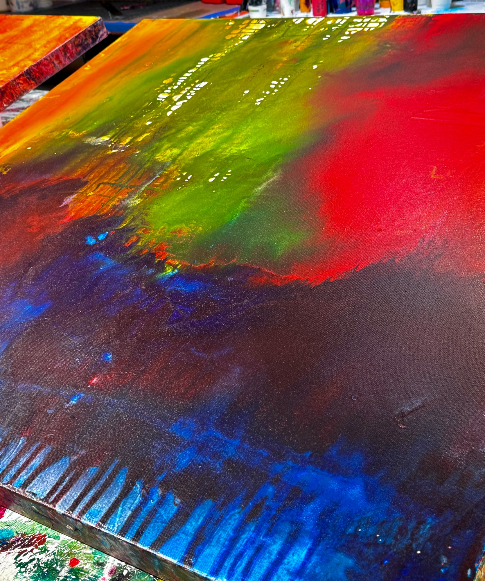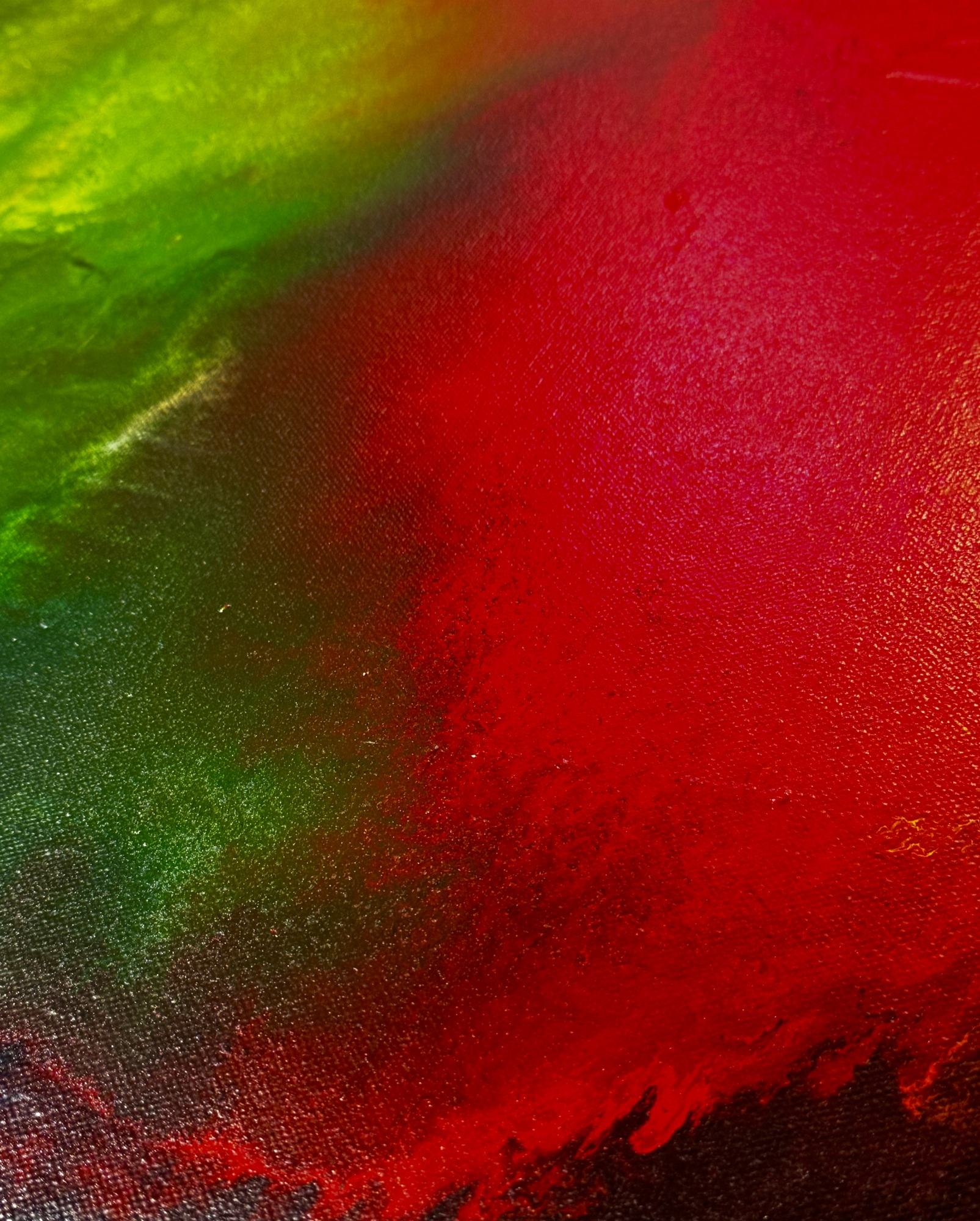 Rich and bold reds and greens dominate the piece, capturing attention and engaging the senses. This striking contrast sets the tone for an emotional exploration, drawing the viewer's eye downward to the mysterious depths of dark blues and blacks. These colors, subtly dripping, create an intriguing texture that adds layers of depth and complexity.