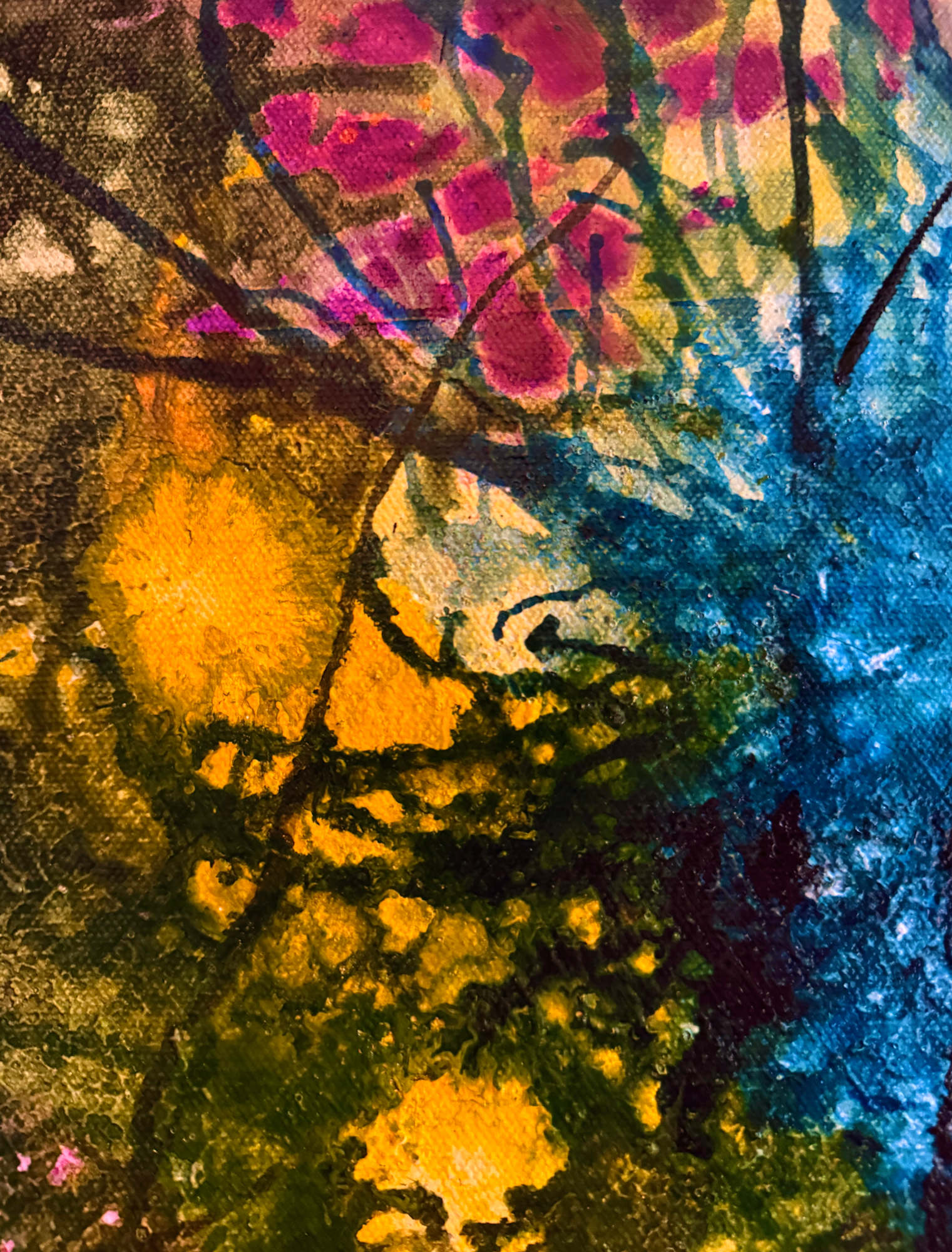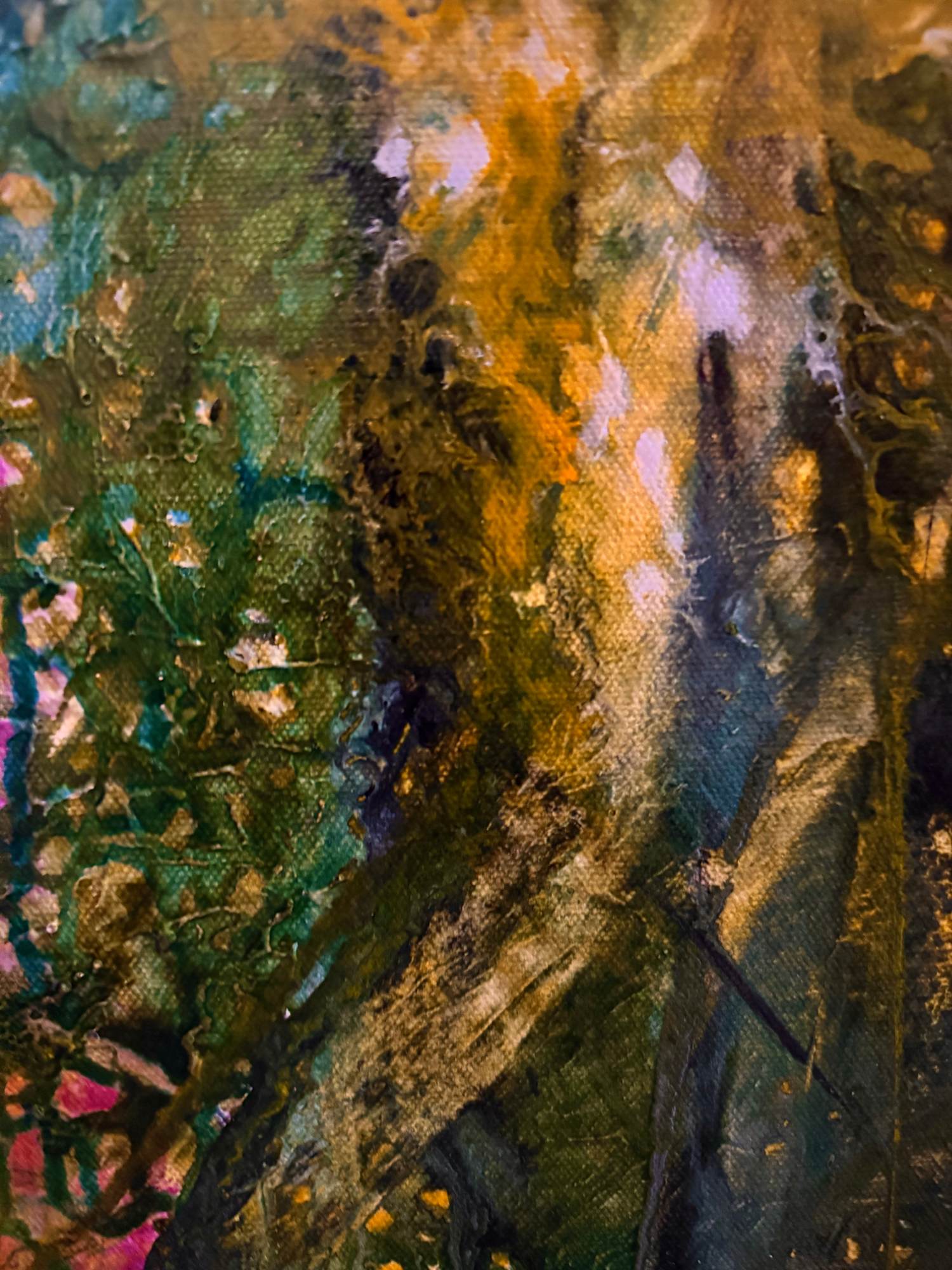 This painting feels like a wild garden blooming at the edge of the universe. Swirls of teal, gold, and deep blue collide like galaxies in motion, while bursts of white and orange resemble stars being born—or wildflowers reaching toward cosmic light. It’s part forest, part nebula, part dream. A place where roots meet stardust and everything is tangled in both earth and sky.