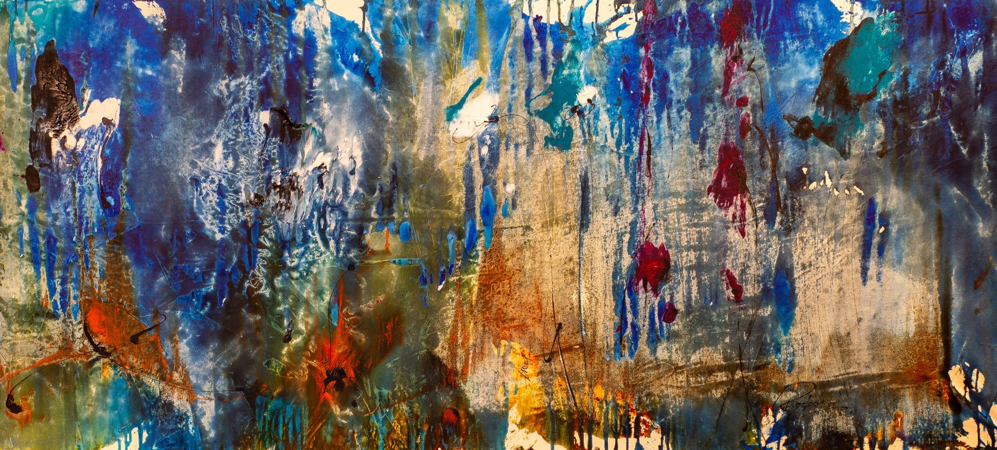 BLUE LAGOON is a luxuriously deep, rich painting with many translucent layers of wet-on-wet applications of Golden liquid and tube acrylic as well as various ink followed with intuitive line work applied with needle-like paint bottles.