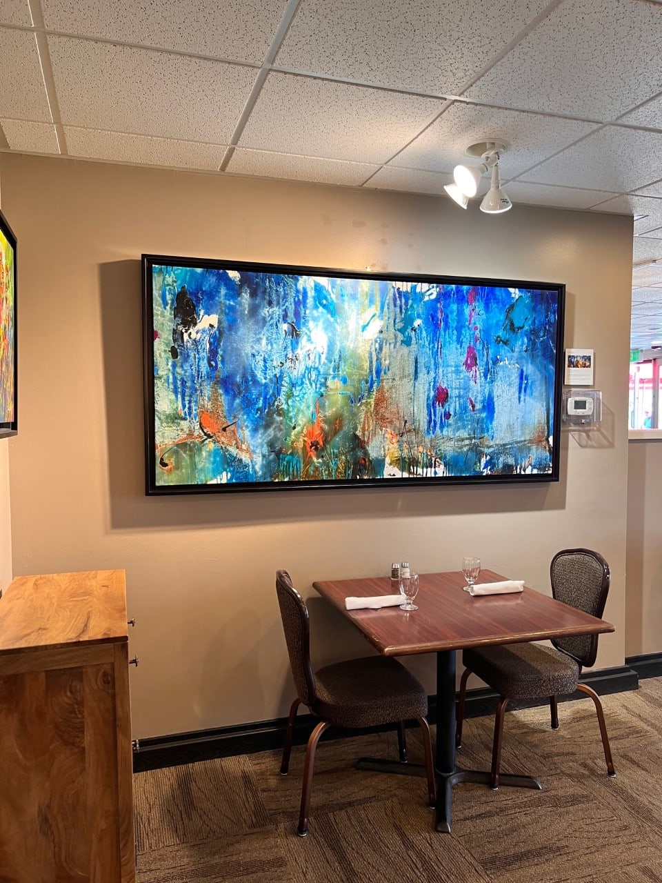 And to make this piece truly unique, a custom frame by Master Craftsman John Henderson, created specifically for this work of art. Notice the wooden inlay, hand-painted to compliment the painting.