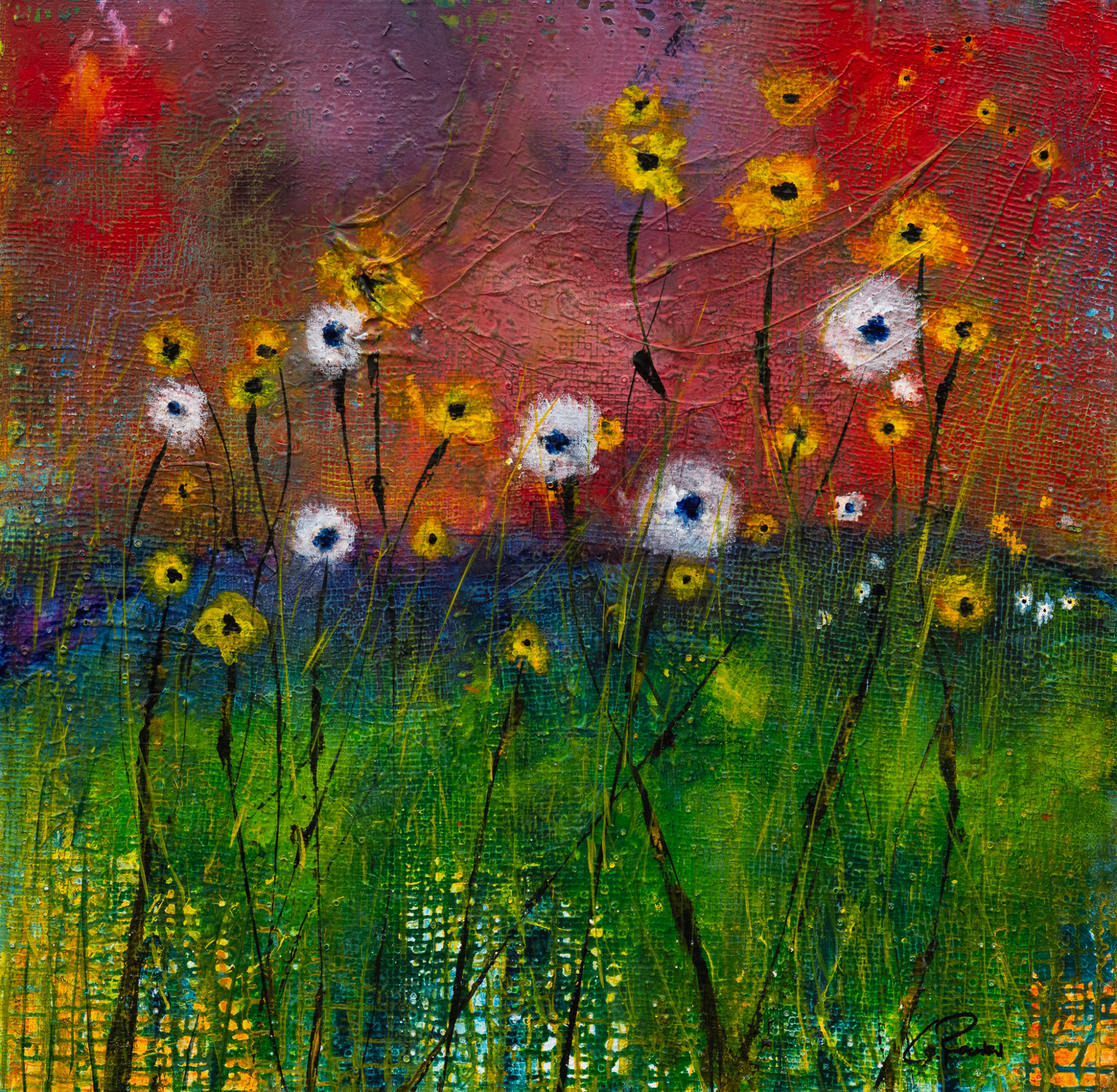 'Bohemian Rhapsody' is a vibrant expressionist painting depicting wildflowers in a meadow. Multiple layers of acrylic and ink washes add to the the overall composition is rich with texture and color contrast, creating a lively, dreamlike landscape.