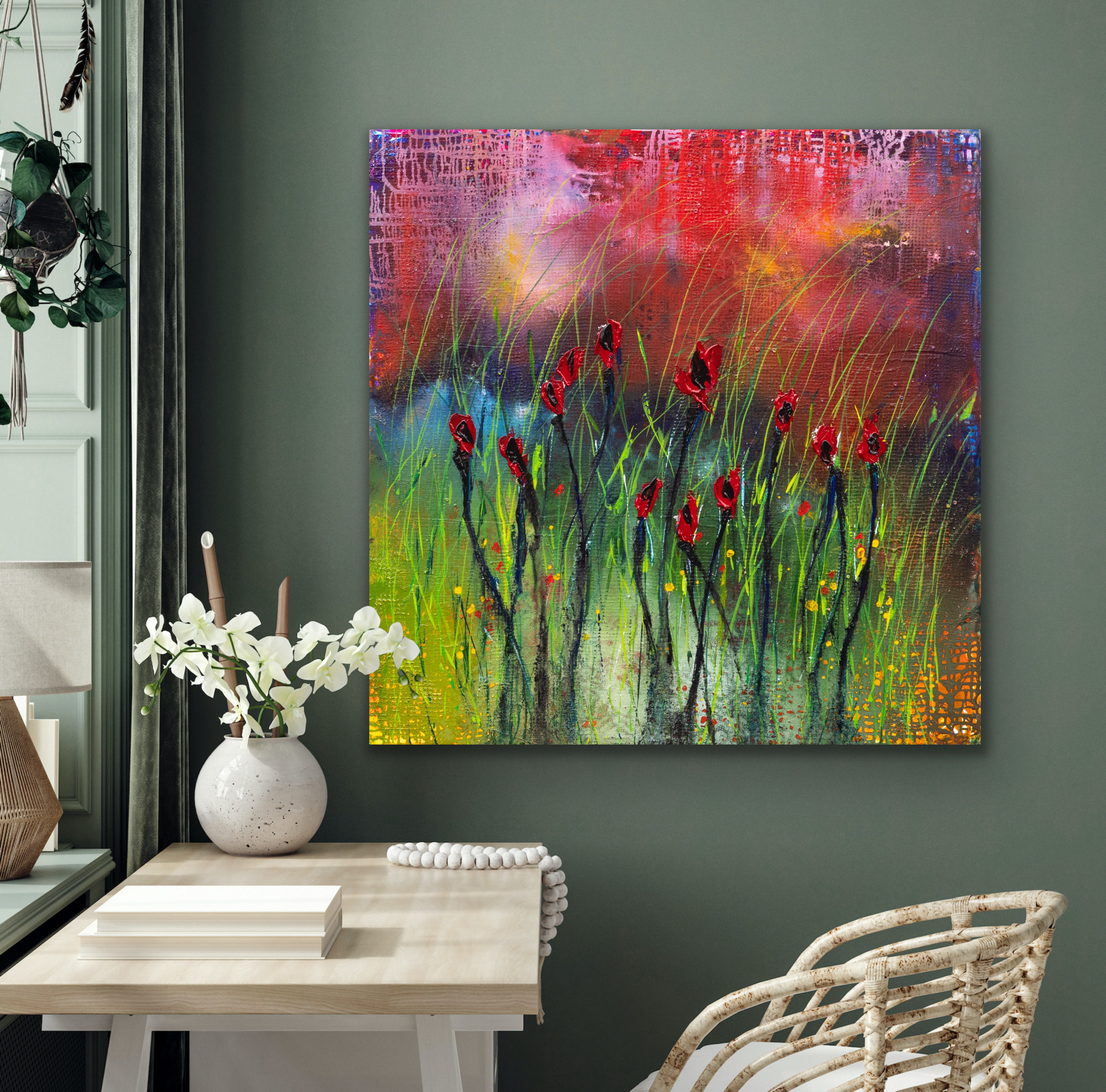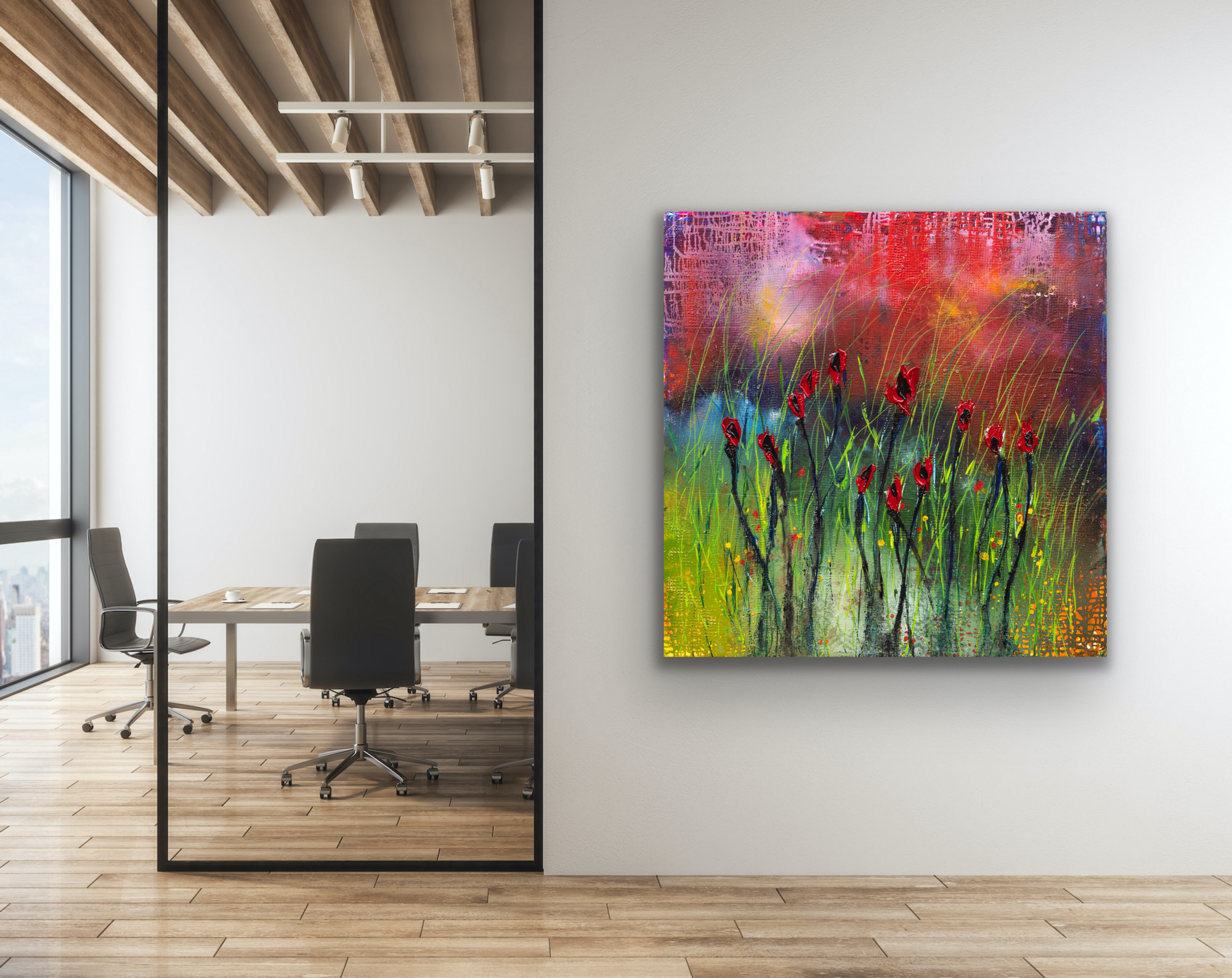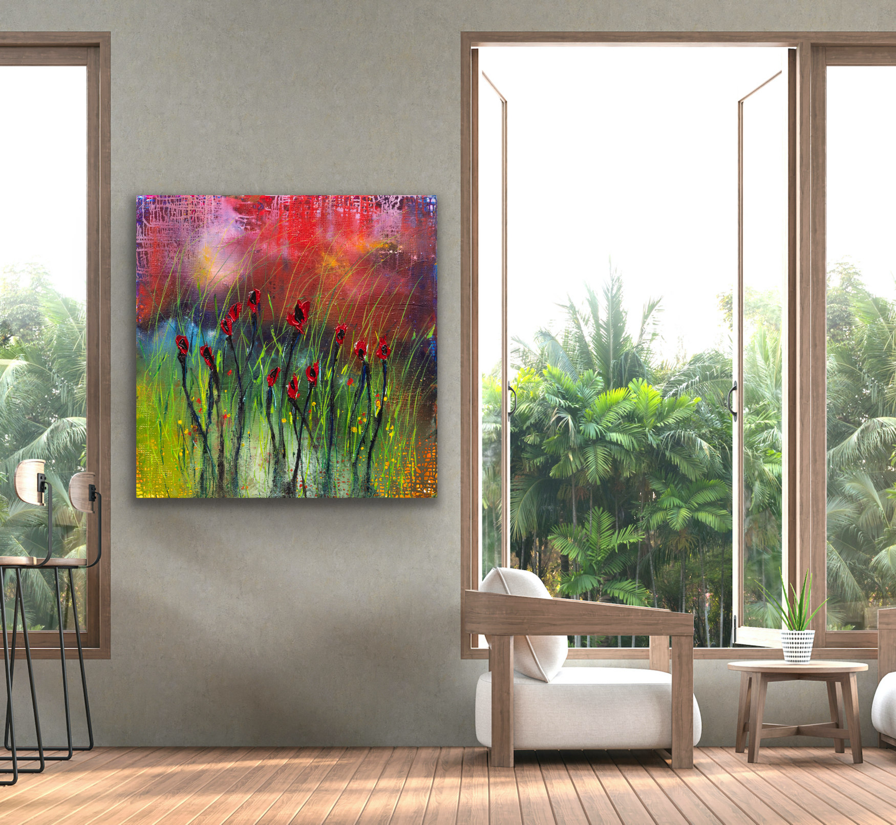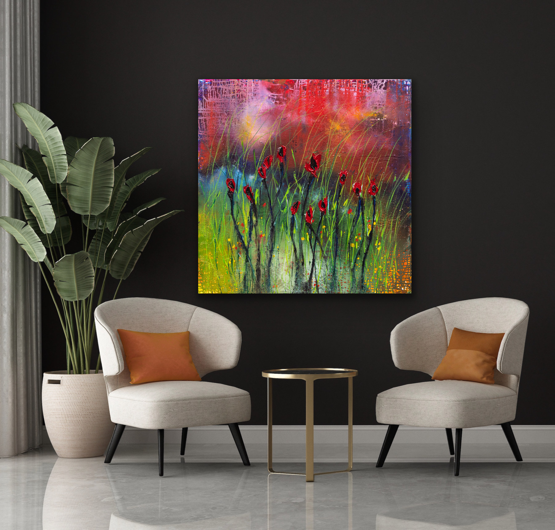 Titled "Enchanted," this captivating piece invites viewers into a mesmerizing abstract garden, alive with color and energy. Measuring 36 x 36 inches, the artwork skillfully utilizes acrylic on canvas to produce a vivid, textured canvas that is both bold and inviting. The heart of the composition is a vibrant display of red flowers, which breathlessly dance across the canvas, their color commanding attention and inspiring awe.