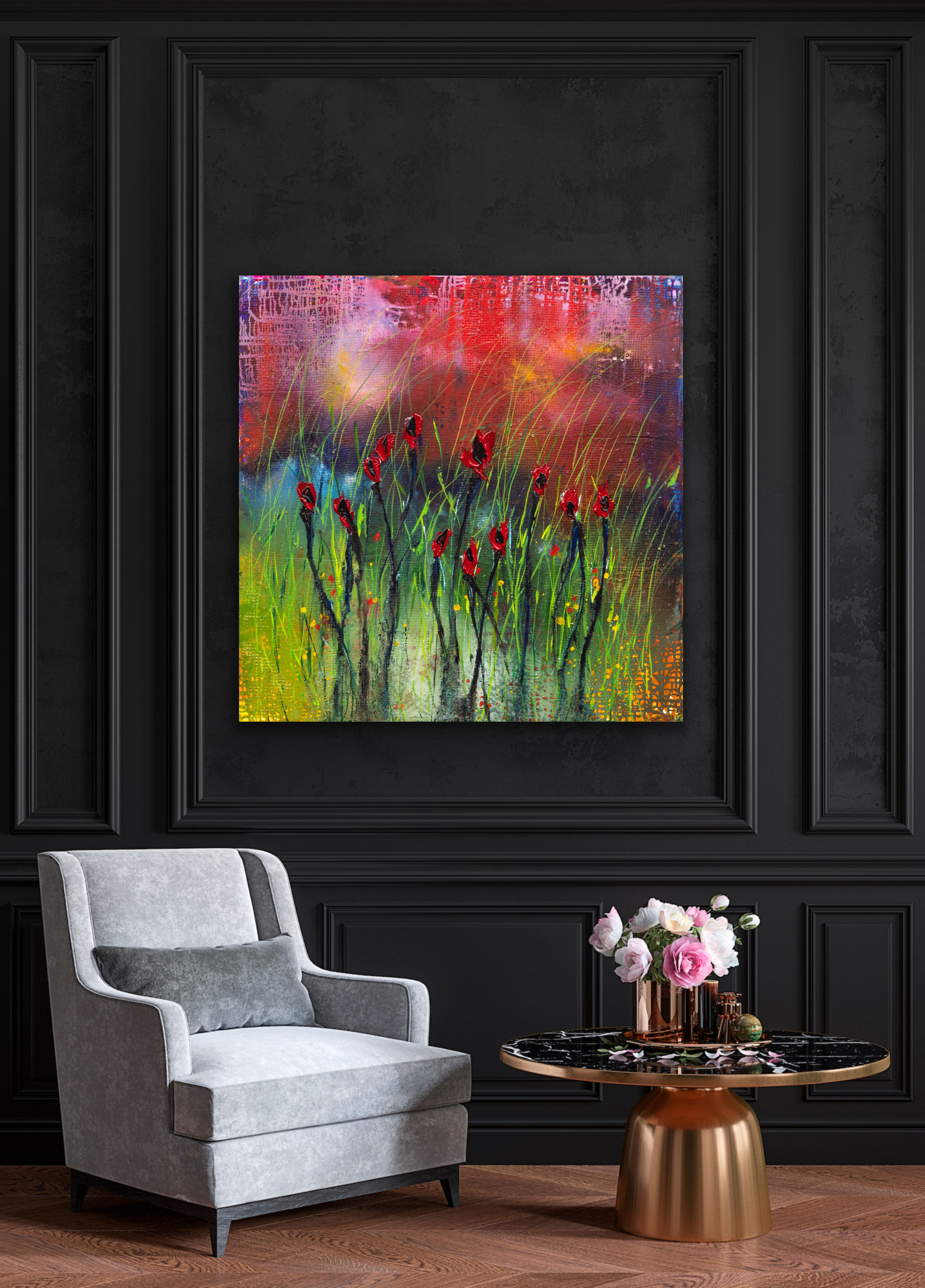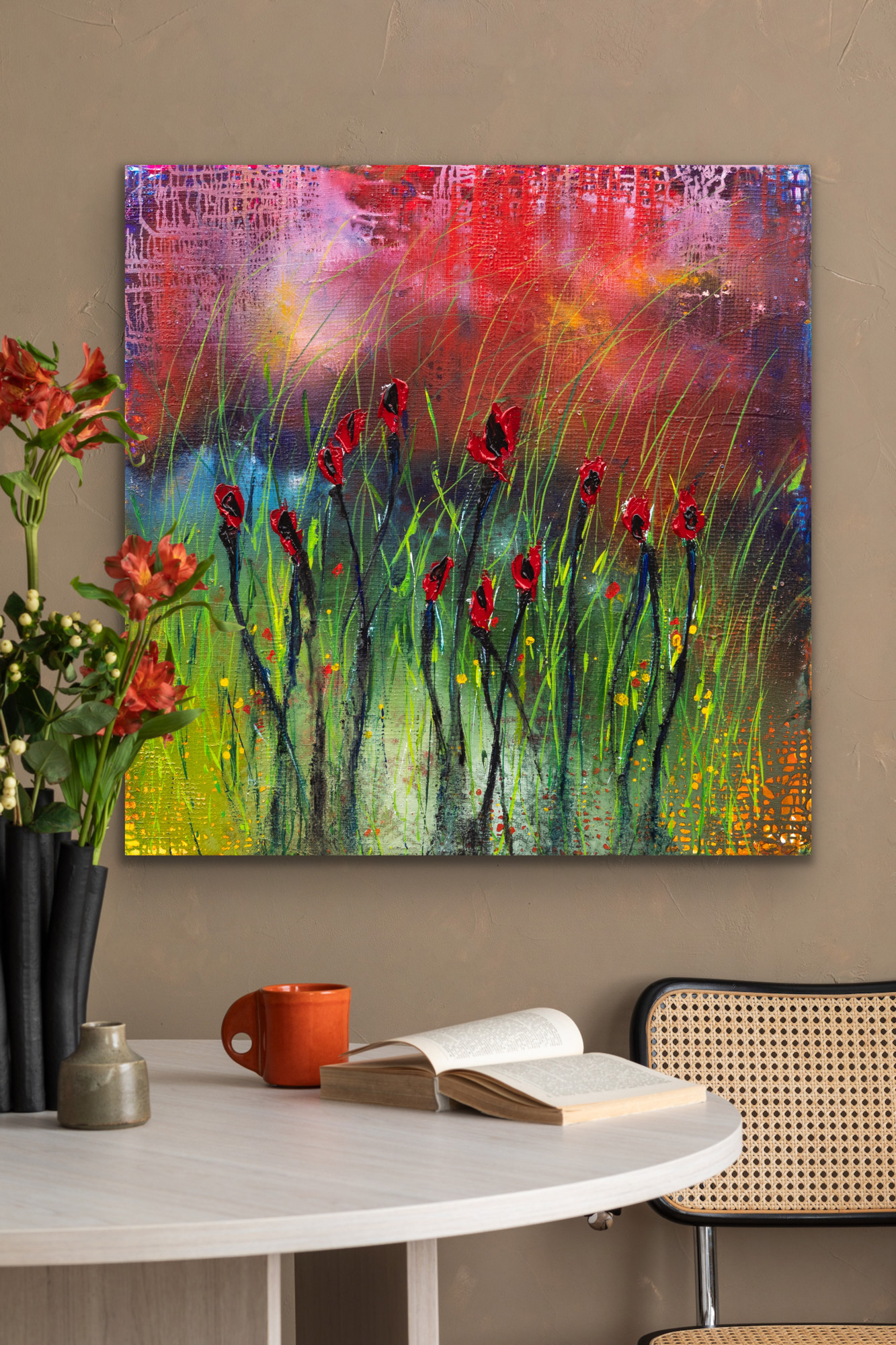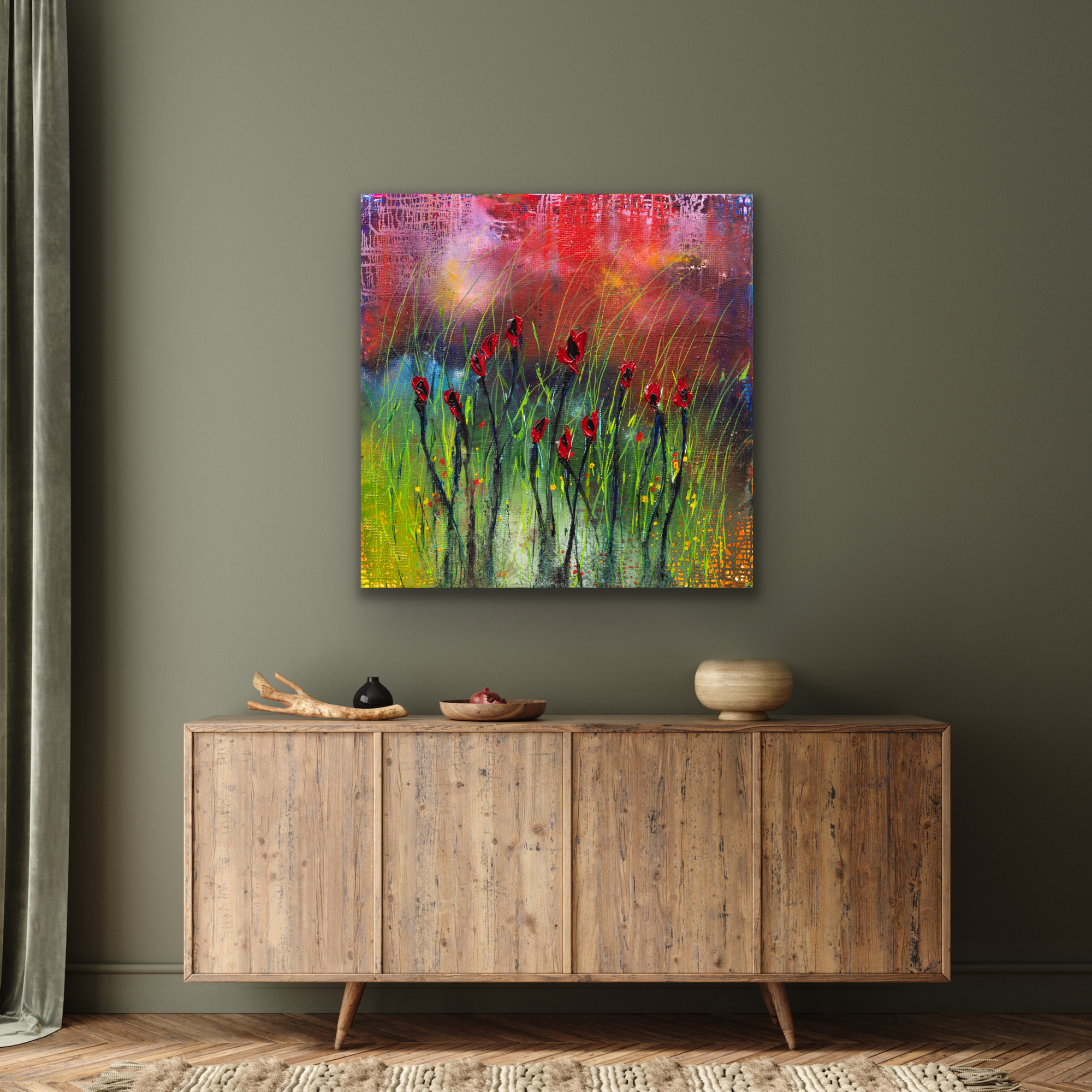 Titled "Enchanted," this captivating piece invites viewers into a mesmerizing abstract garden, alive with color and energy. Measuring 36 x 36 inches, the artwork skillfully utilizes acrylic on canvas to produce a vivid, textured canvas that is both bold and inviting. The heart of the composition is a vibrant display of red flowers, which breathlessly dance across the canvas, their color commanding attention and inspiring awe.