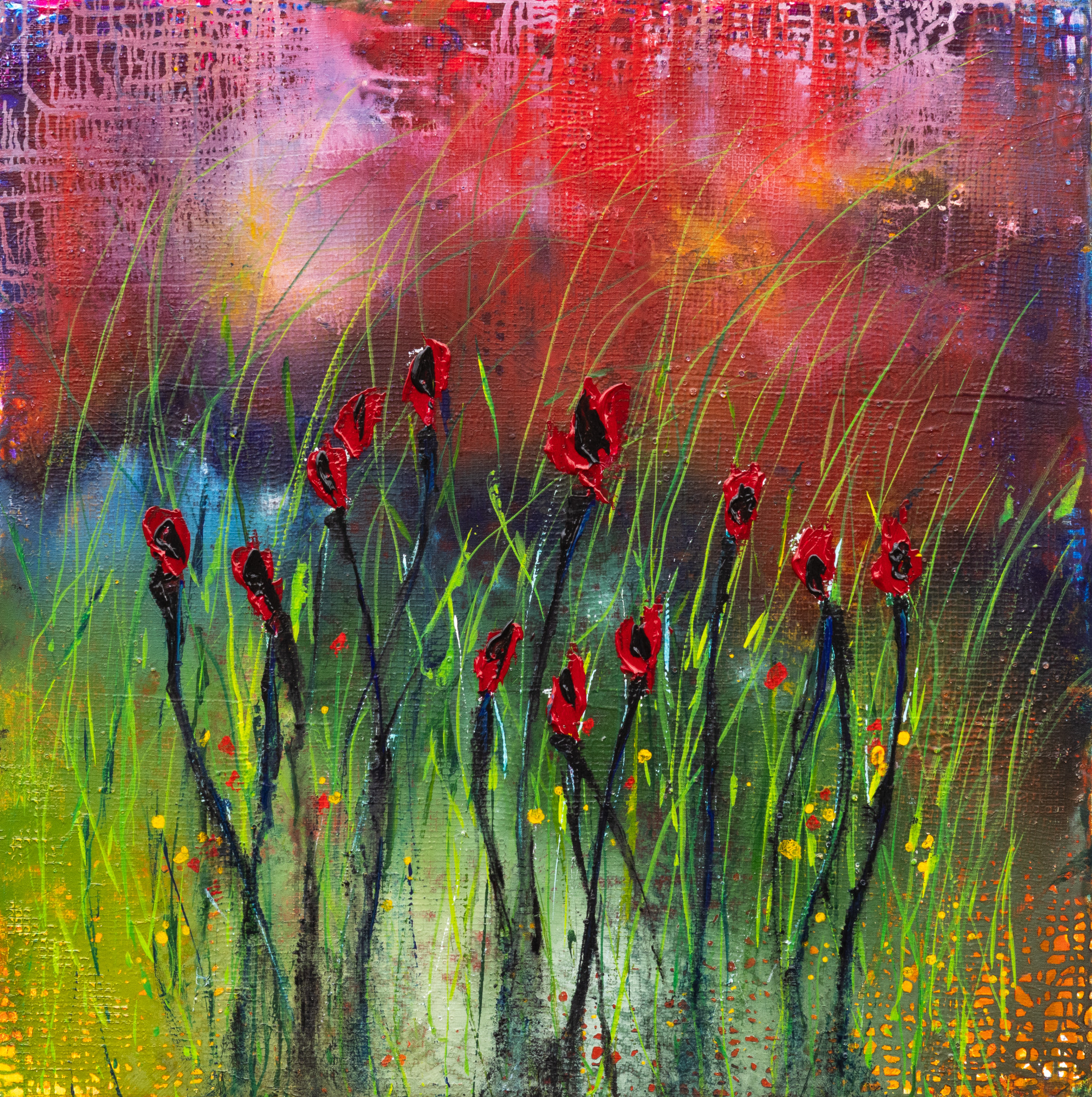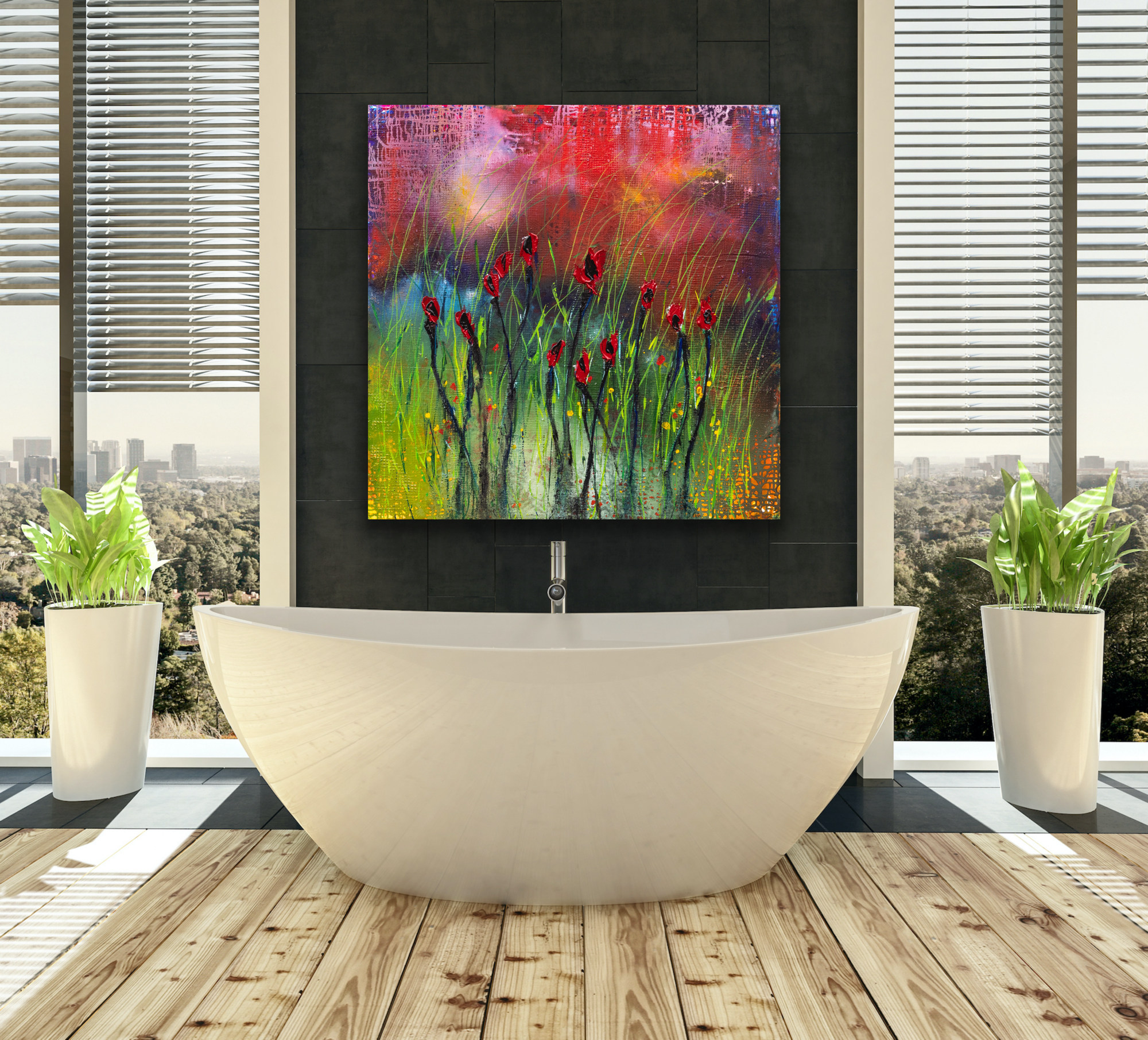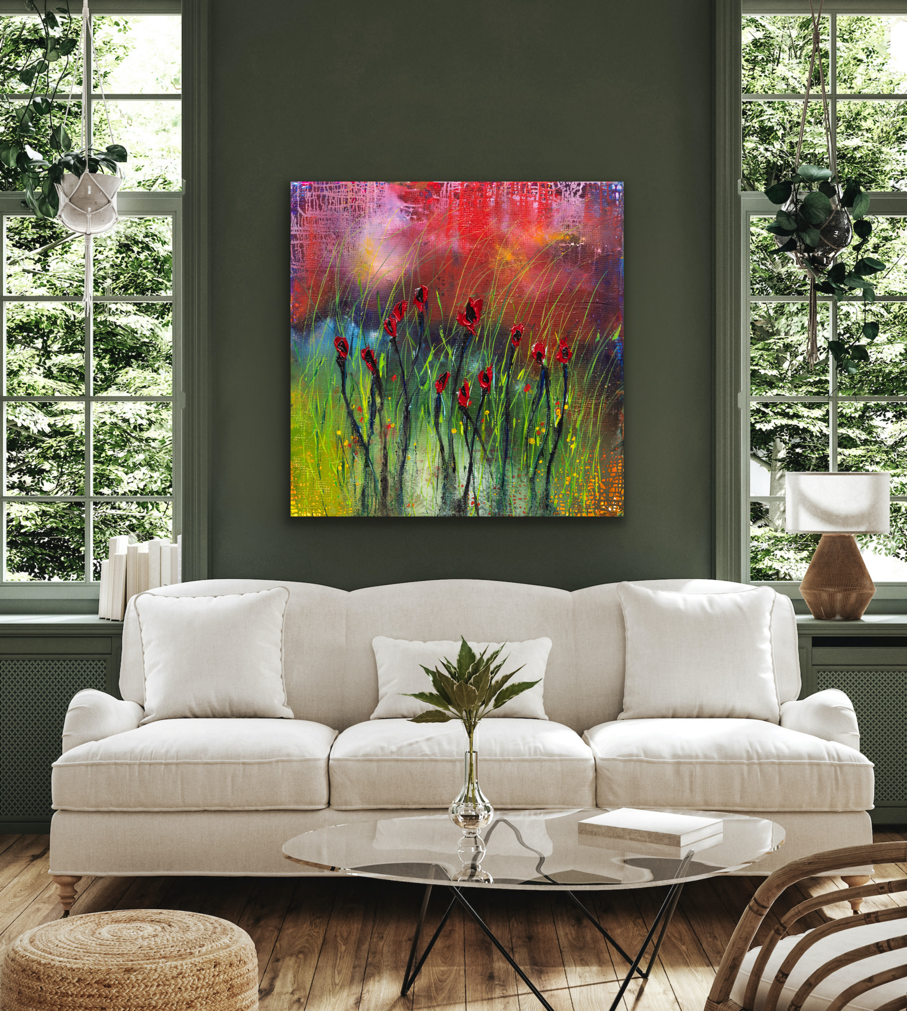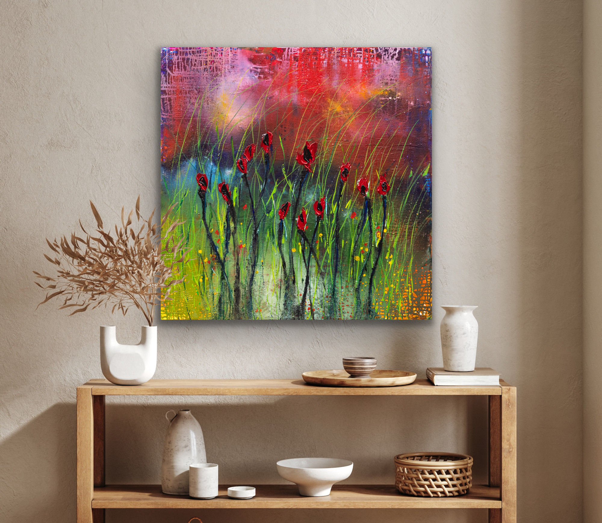 Titled "Enchanted," this captivating piece invites viewers into a mesmerizing abstract garden, alive with color and energy. Measuring 36 x 36 inches, the artwork skillfully utilizes acrylic on canvas to produce a vivid, textured canvas that is both bold and inviting. The heart of the composition is a vibrant display of red flowers, which breathlessly dance across the canvas, their color commanding attention and inspiring awe.