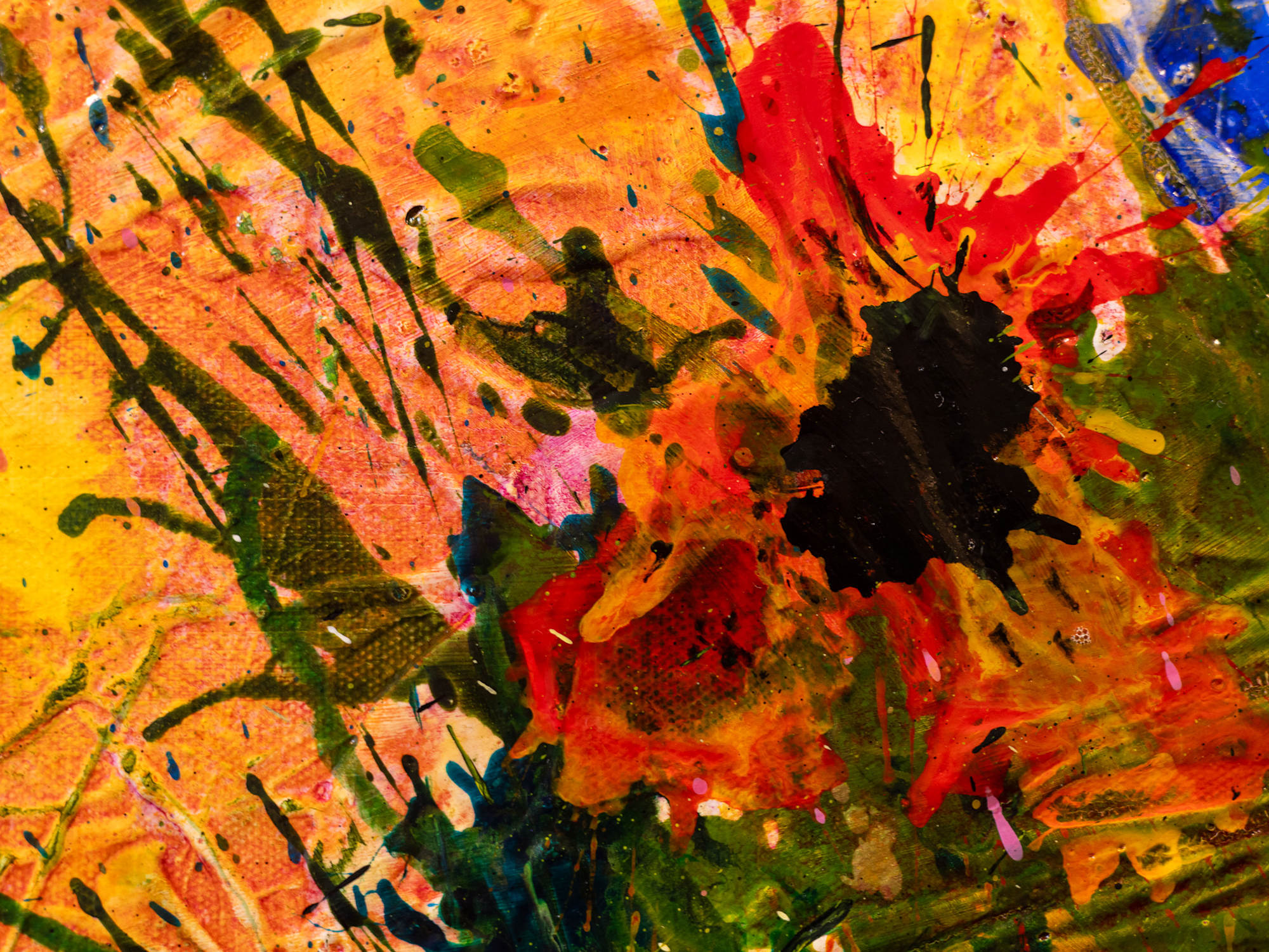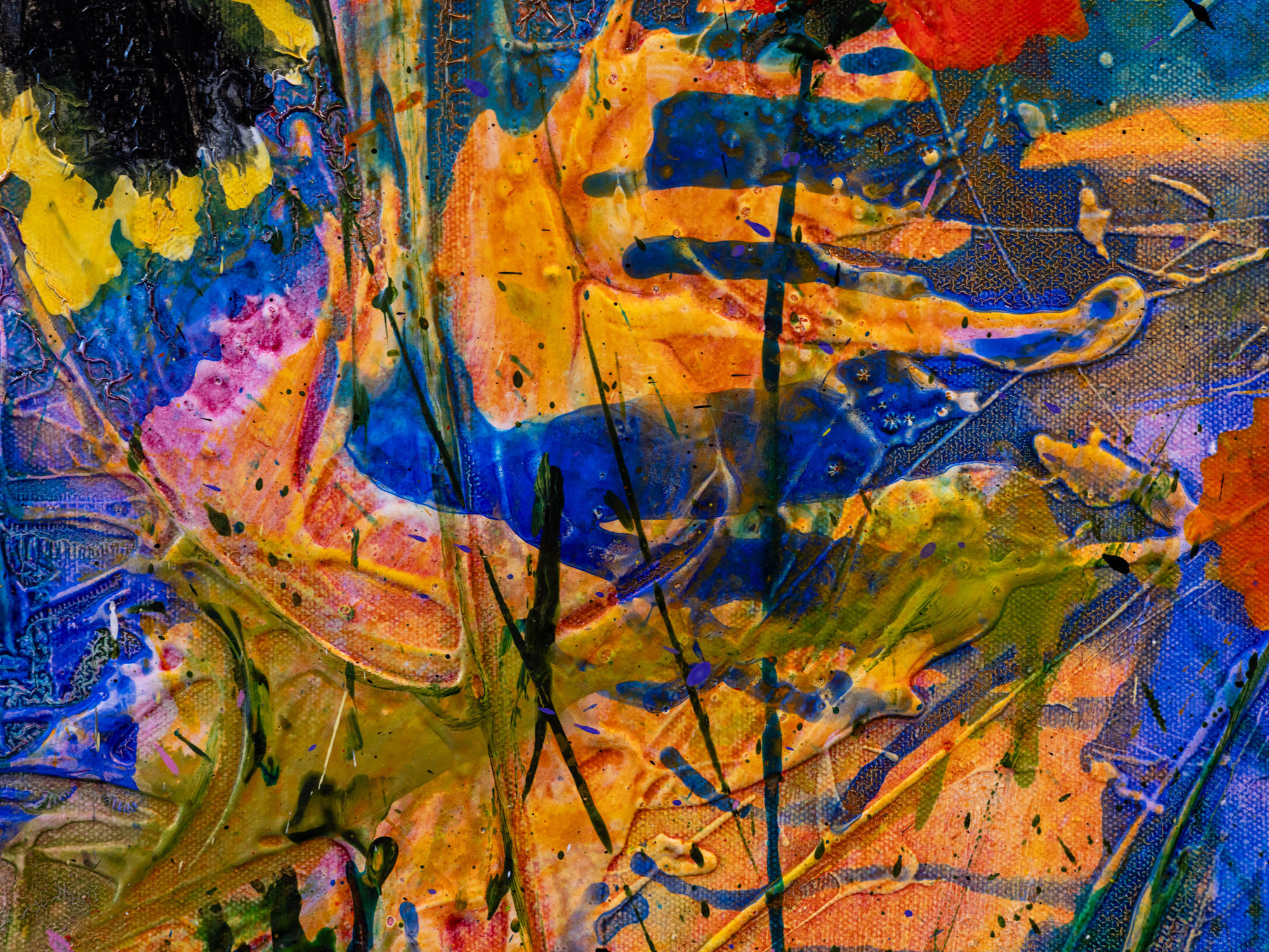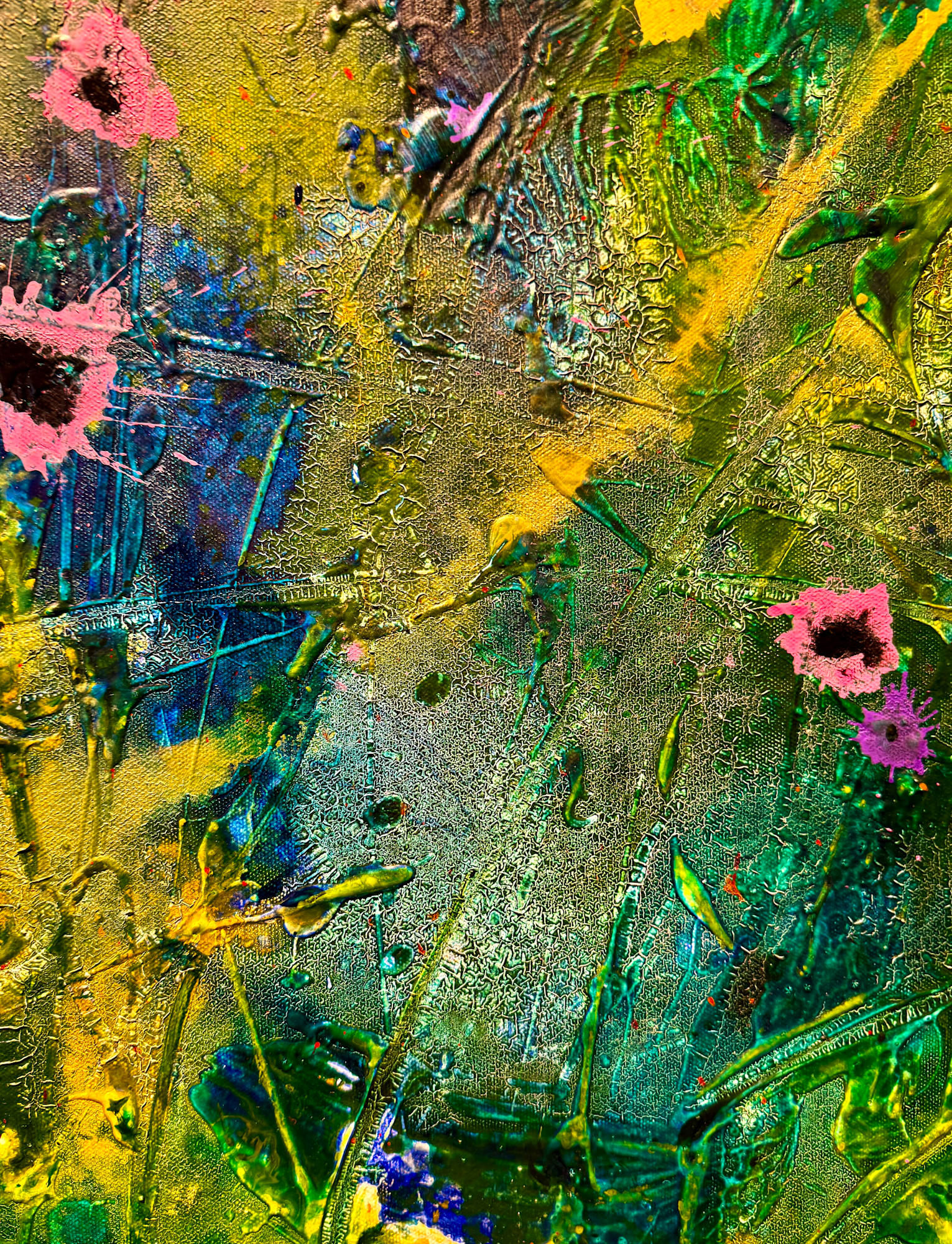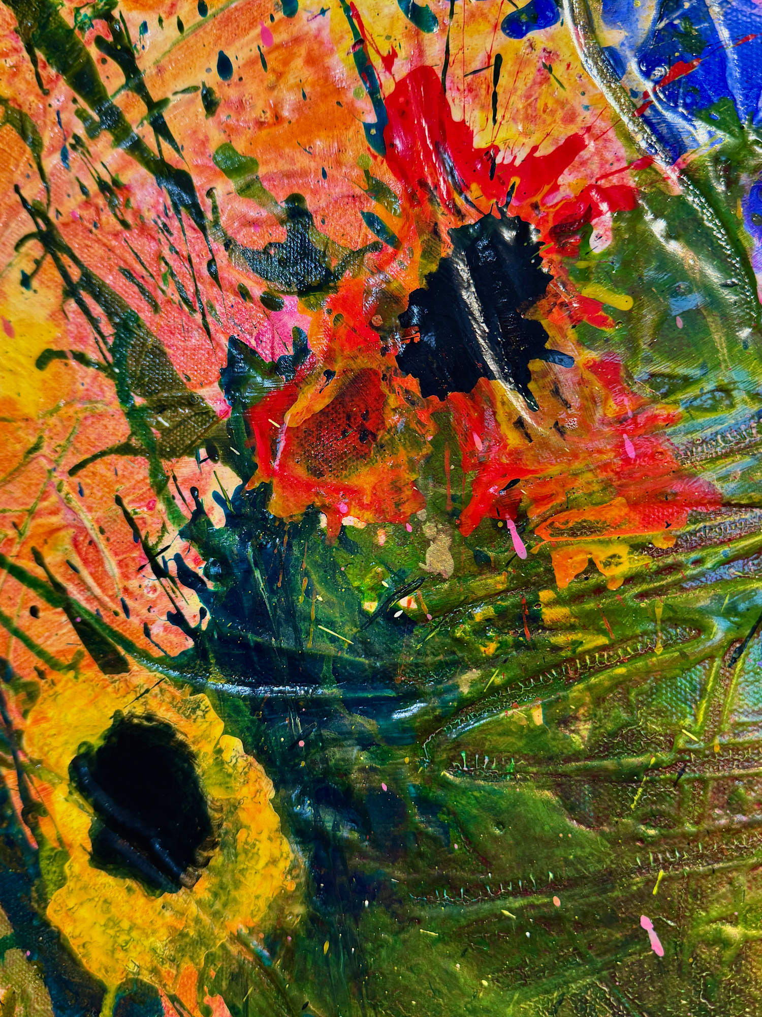 Brushstrokes are bold and textured, with splashes and drips enhancing the overall vivid, almost abstract impression of a rich, blooming garden. The interplay of colors and forms evokes a sense of natural exuberance and spontaneity.
