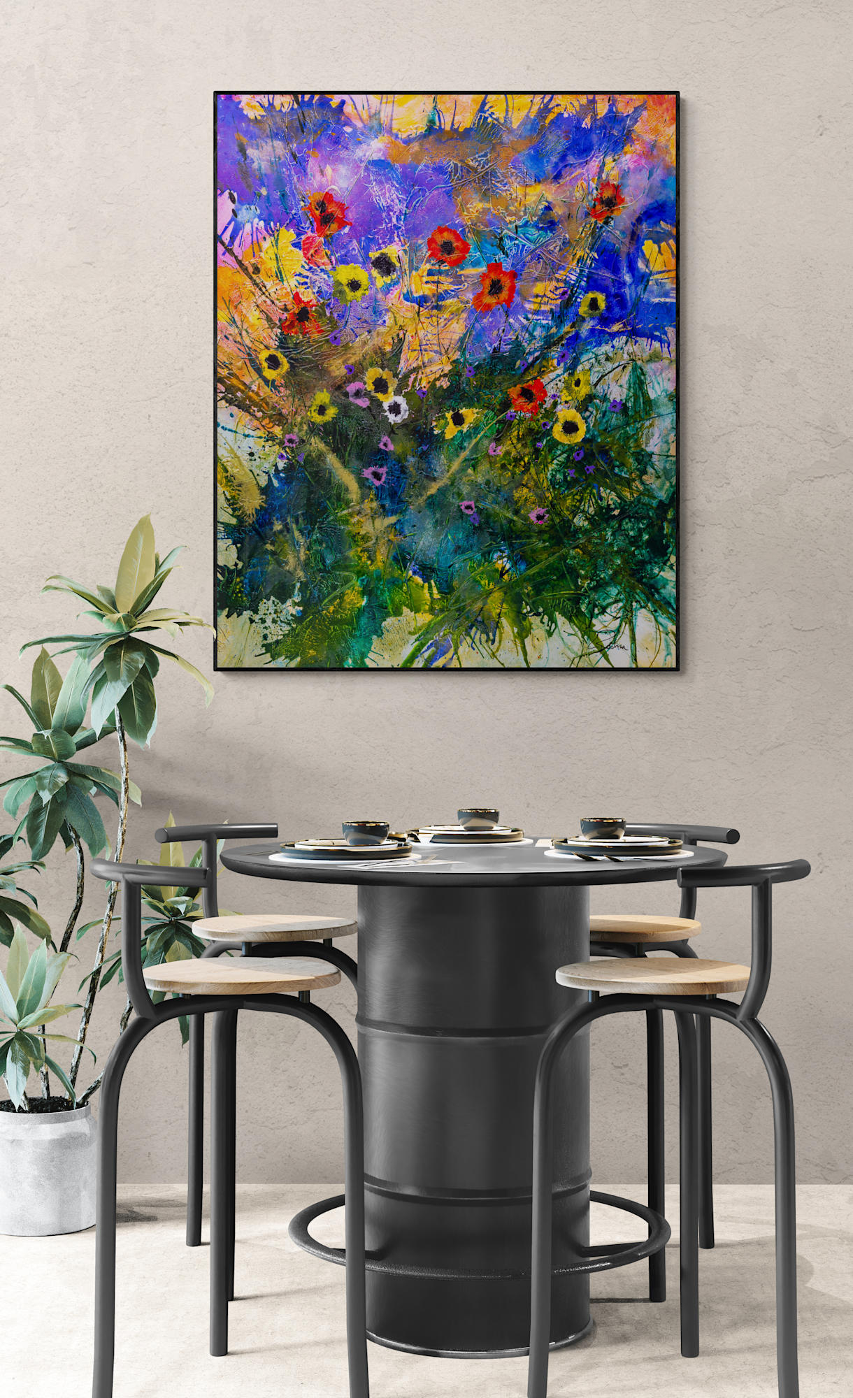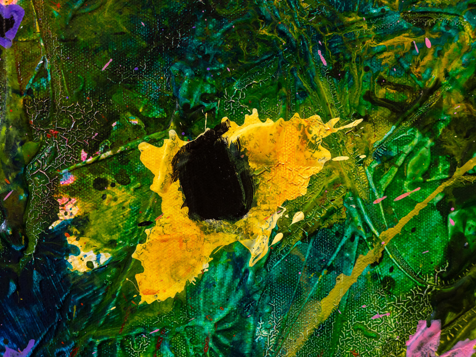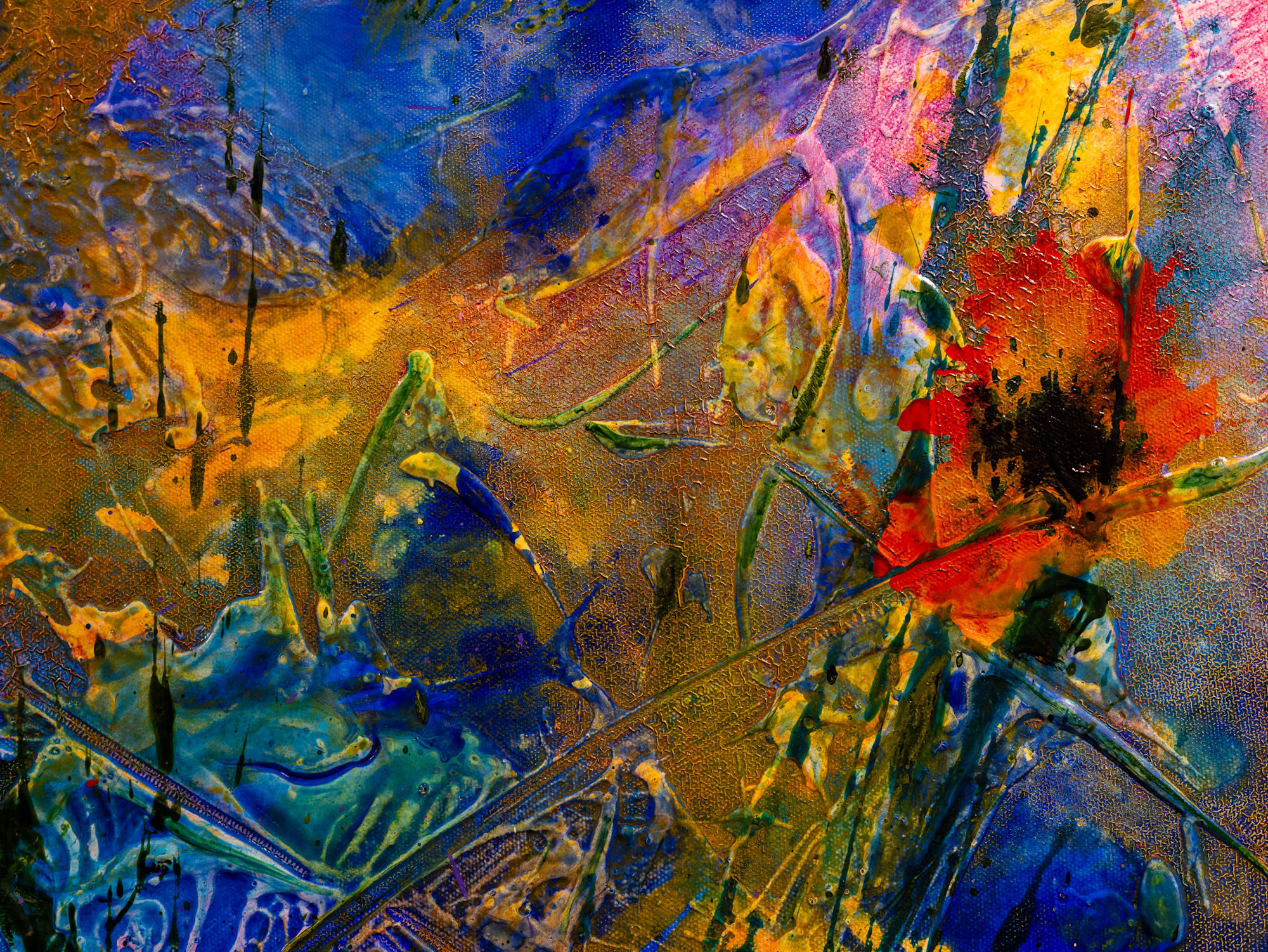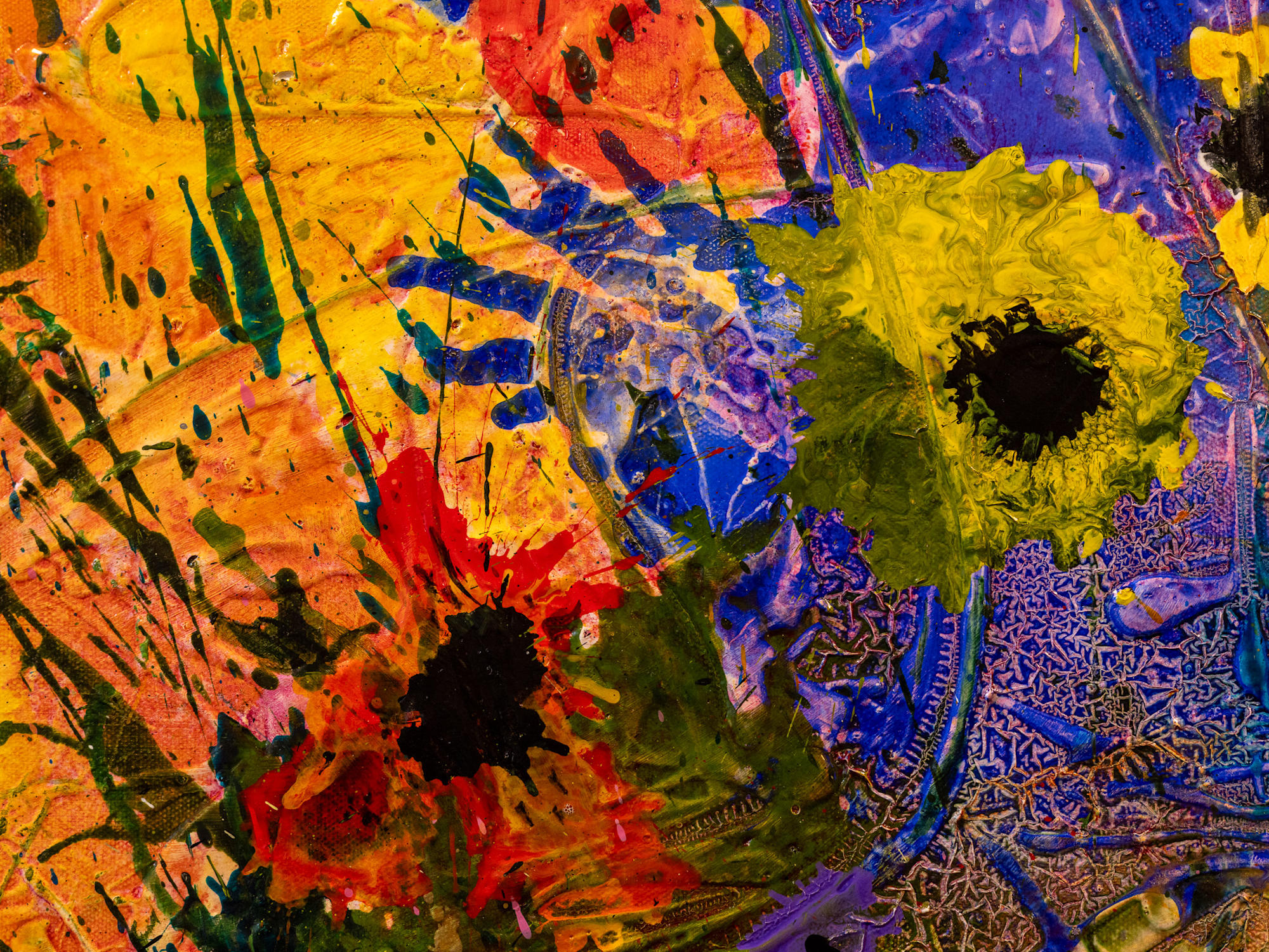 Brushstrokes are bold and textured, with splashes and drips enhancing the overall vivid, almost abstract impression of a rich, blooming garden. The interplay of colors and forms evokes a sense of natural exuberance and spontaneity.