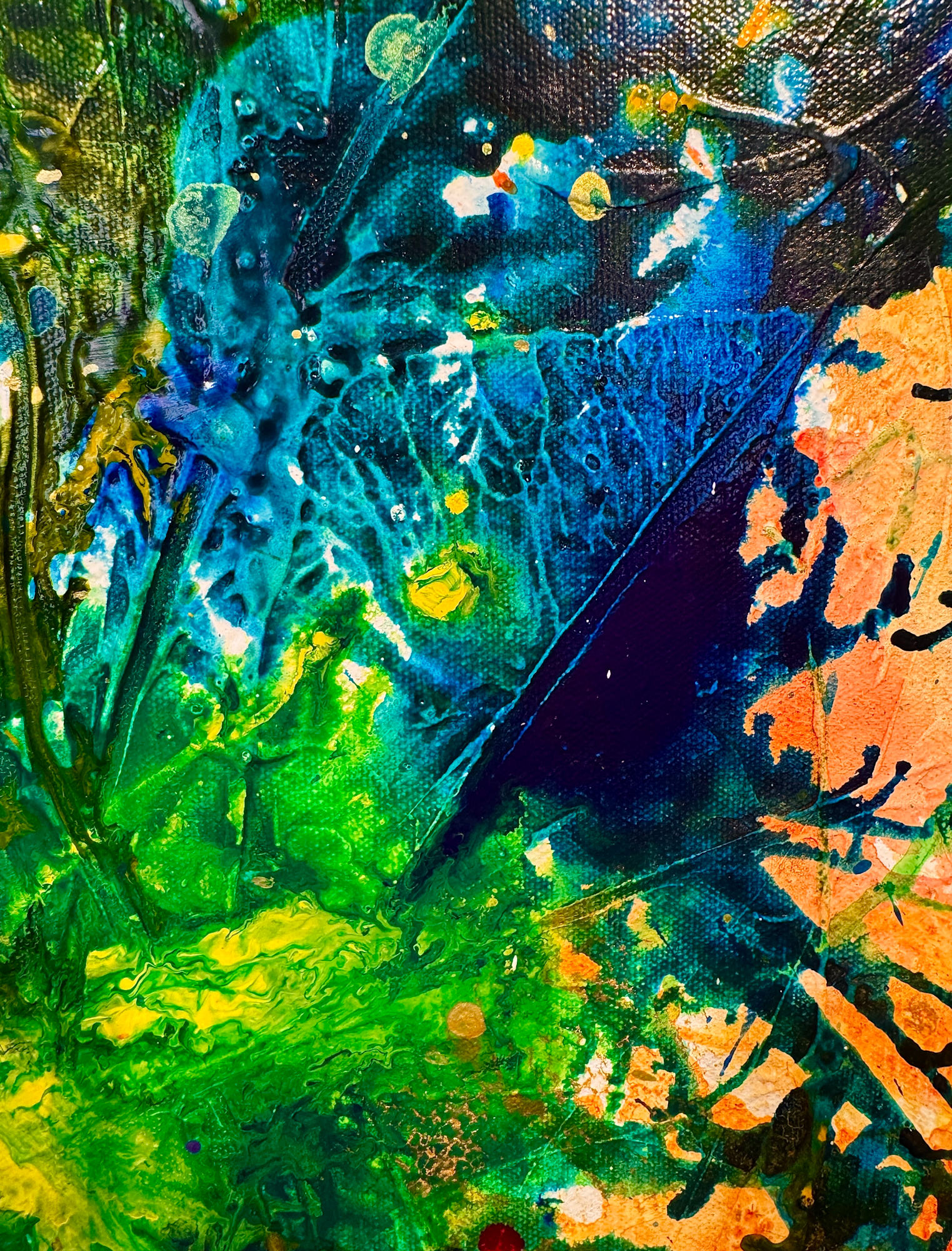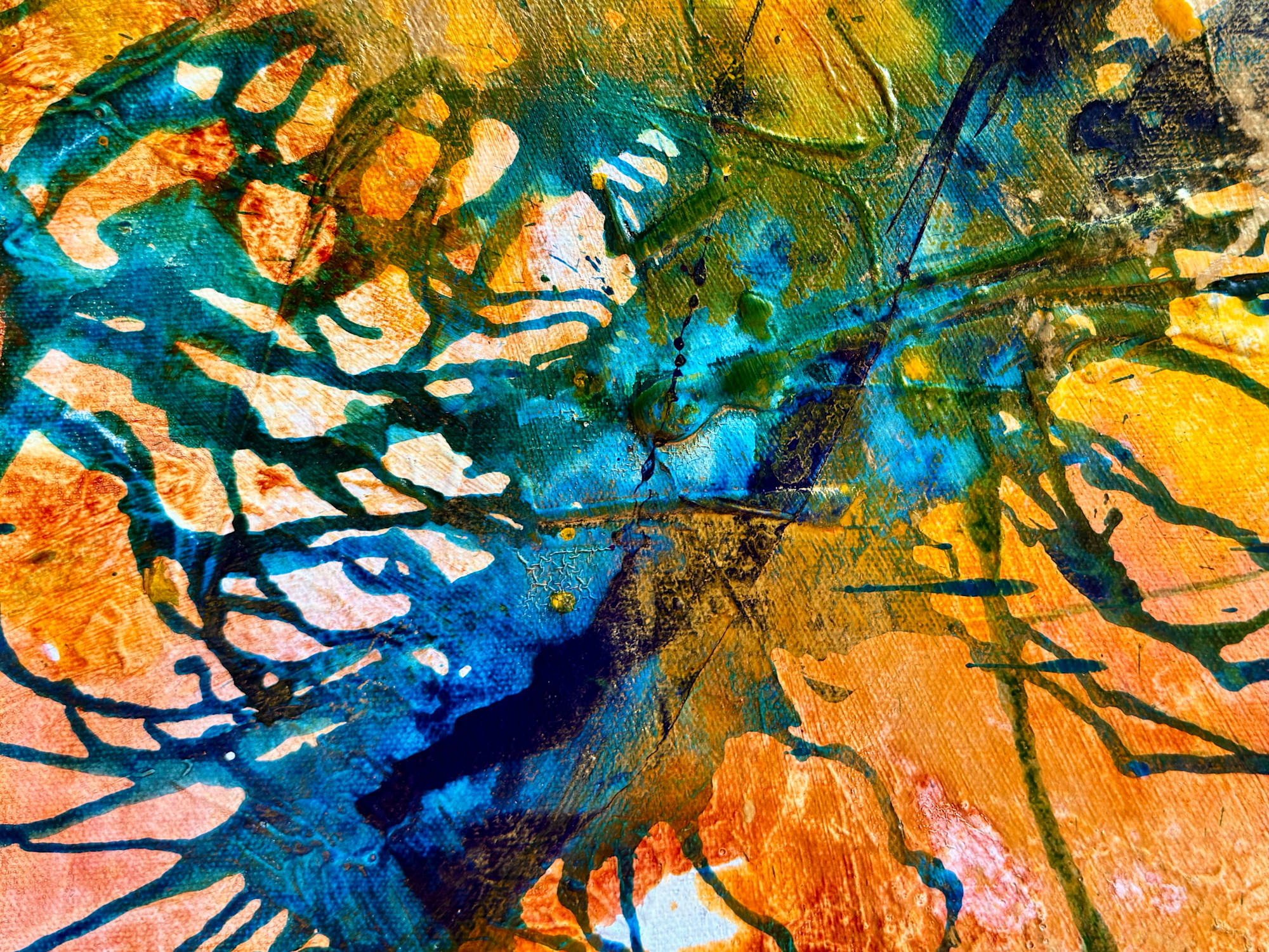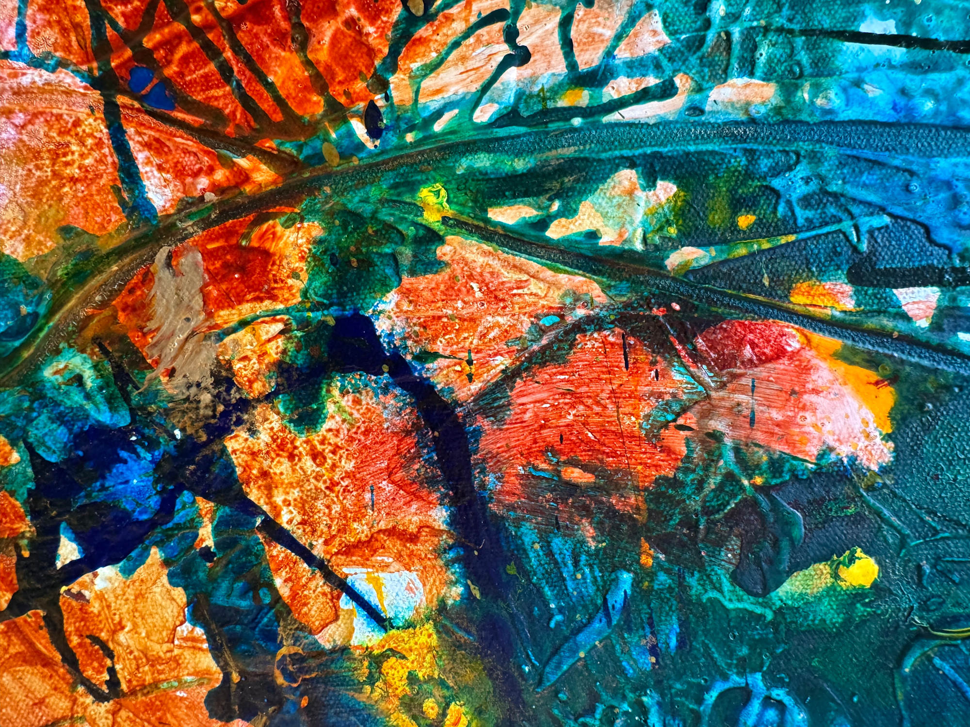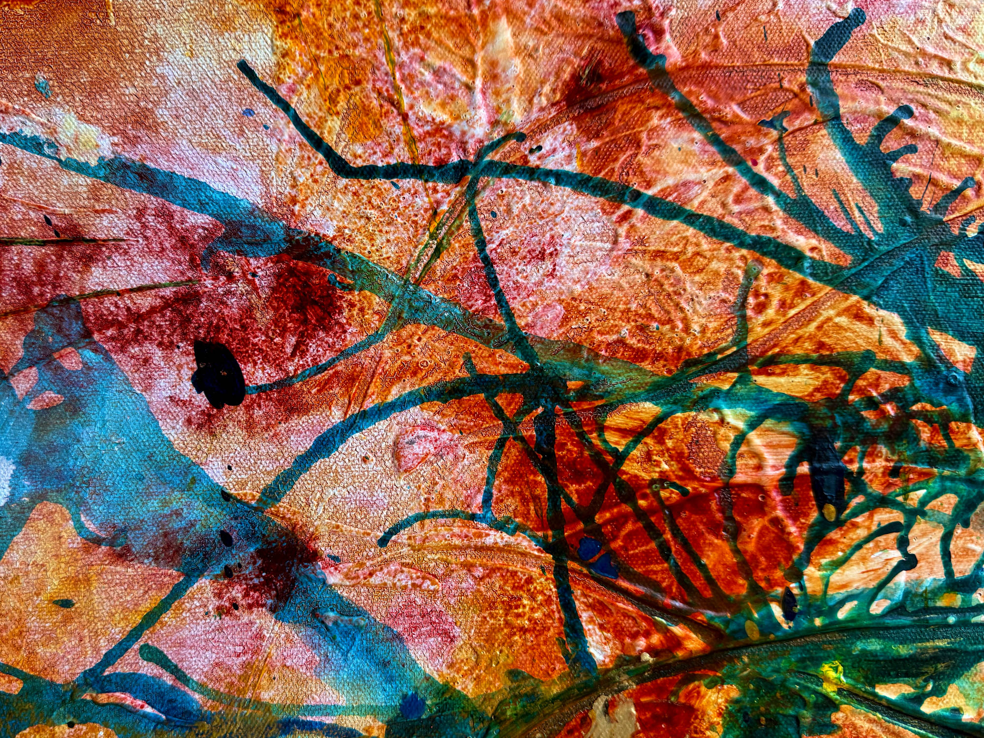 Brushstrokes are bold and textured, with splashes and drips enhancing the overall vivid, almost abstract impression of a rich, blooming garden. The interplay of colors and forms evokes a sense of natural exuberance and spontaneity.