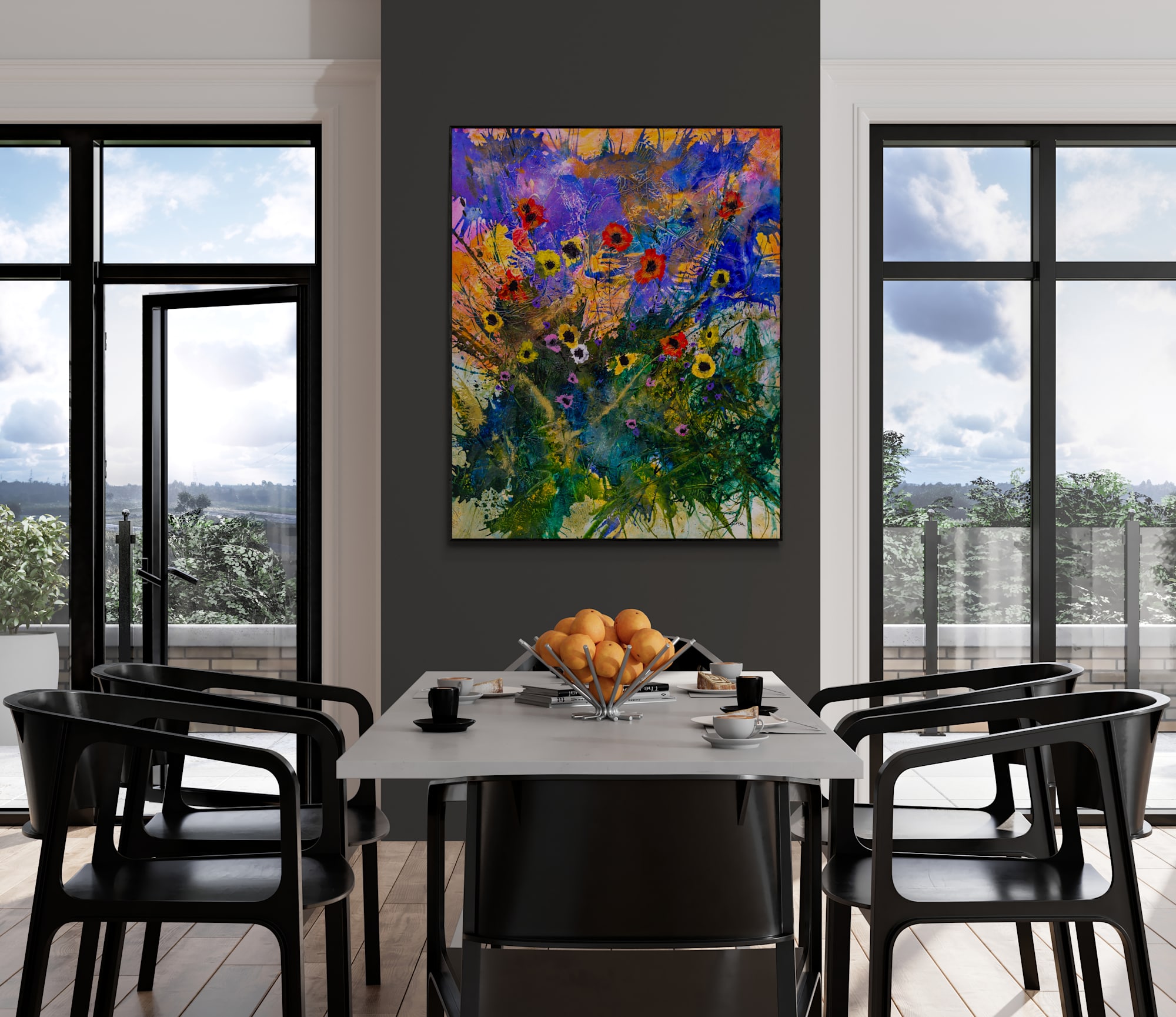 The artwork is an expressive, vibrant floral composition bursting with color and energy. It features a dense cluster of flowers in various shades, prominently red, yellow, white, and purple, set against a dynamic background of swirling blues, purples, and golden yellows. The flowers are accompanied by wildly sweeping stems and foliage painted in lush greens and earth tones, creating a sense of lively movement and depth.
