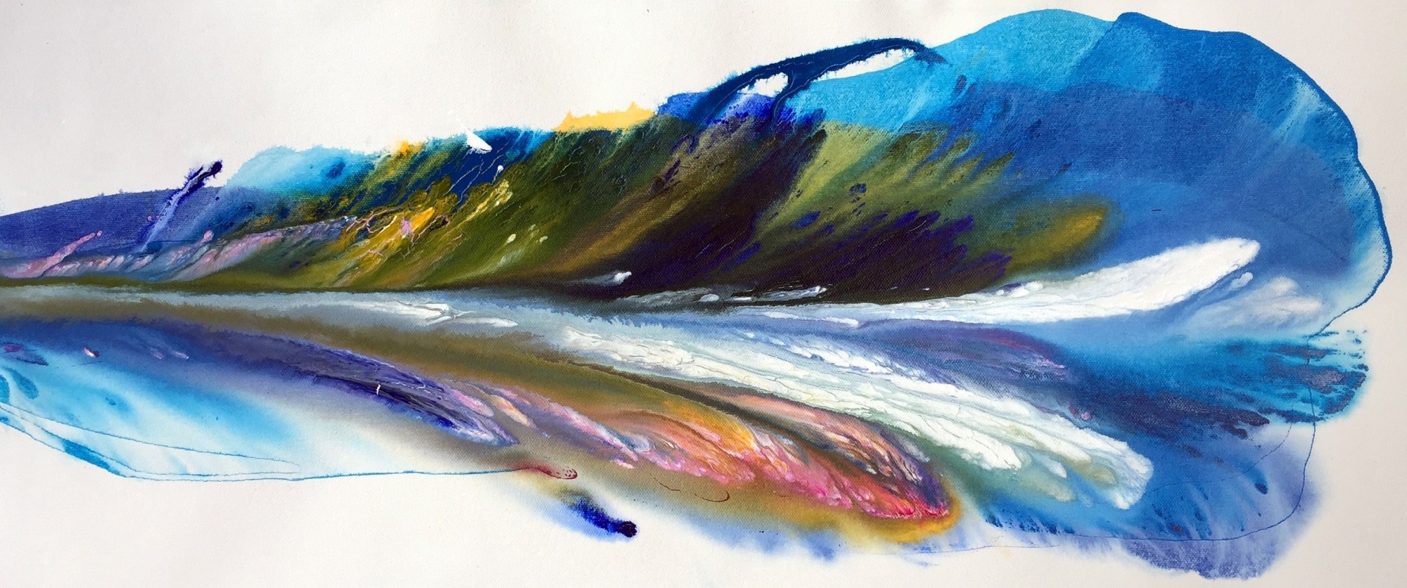 A very special painting. Of course it was one of the six unique pieces using the flow creation and float presentation technique. But … the magic that was revealed beneath the various layers of paint and inks makes this one is a gem.