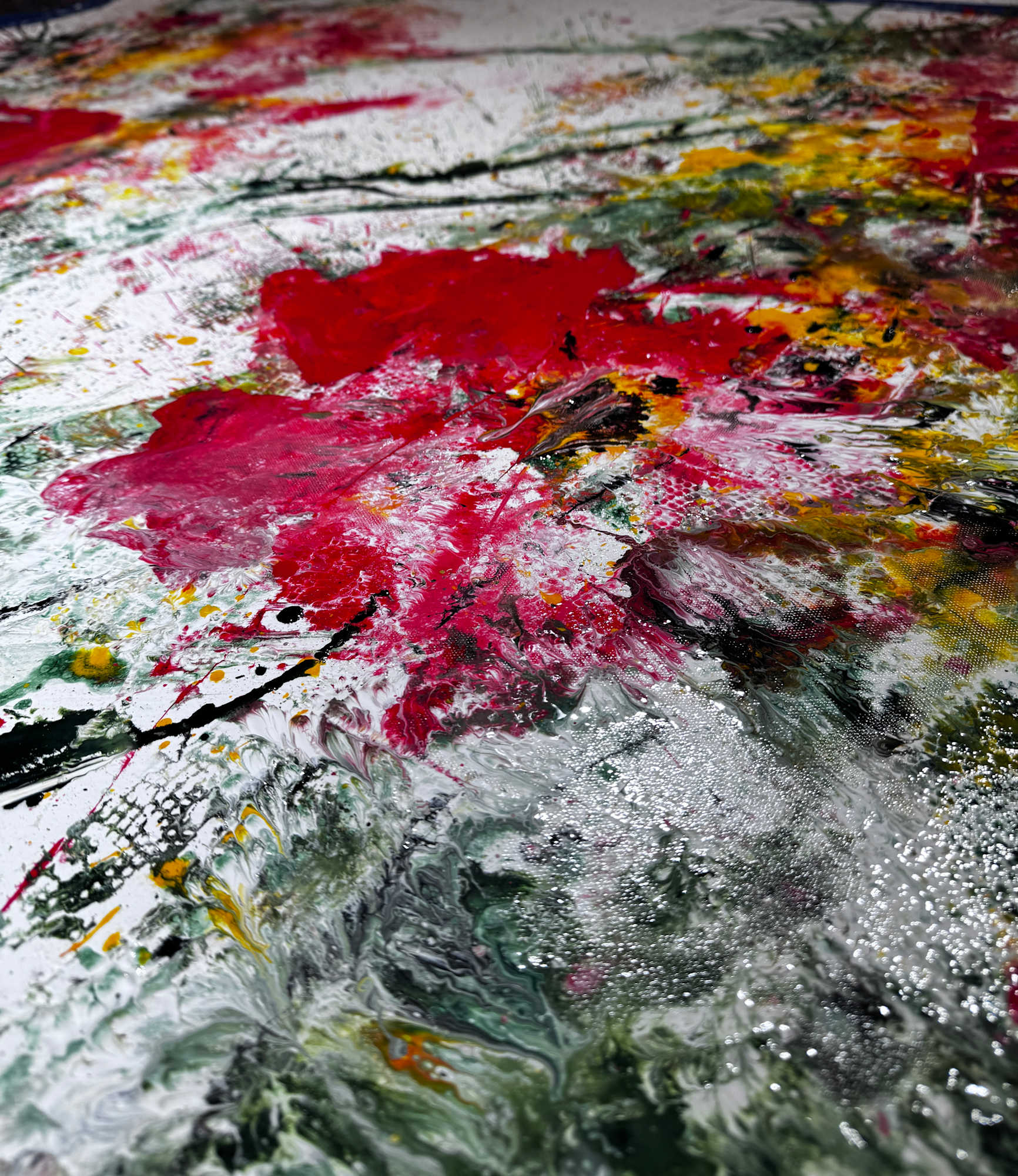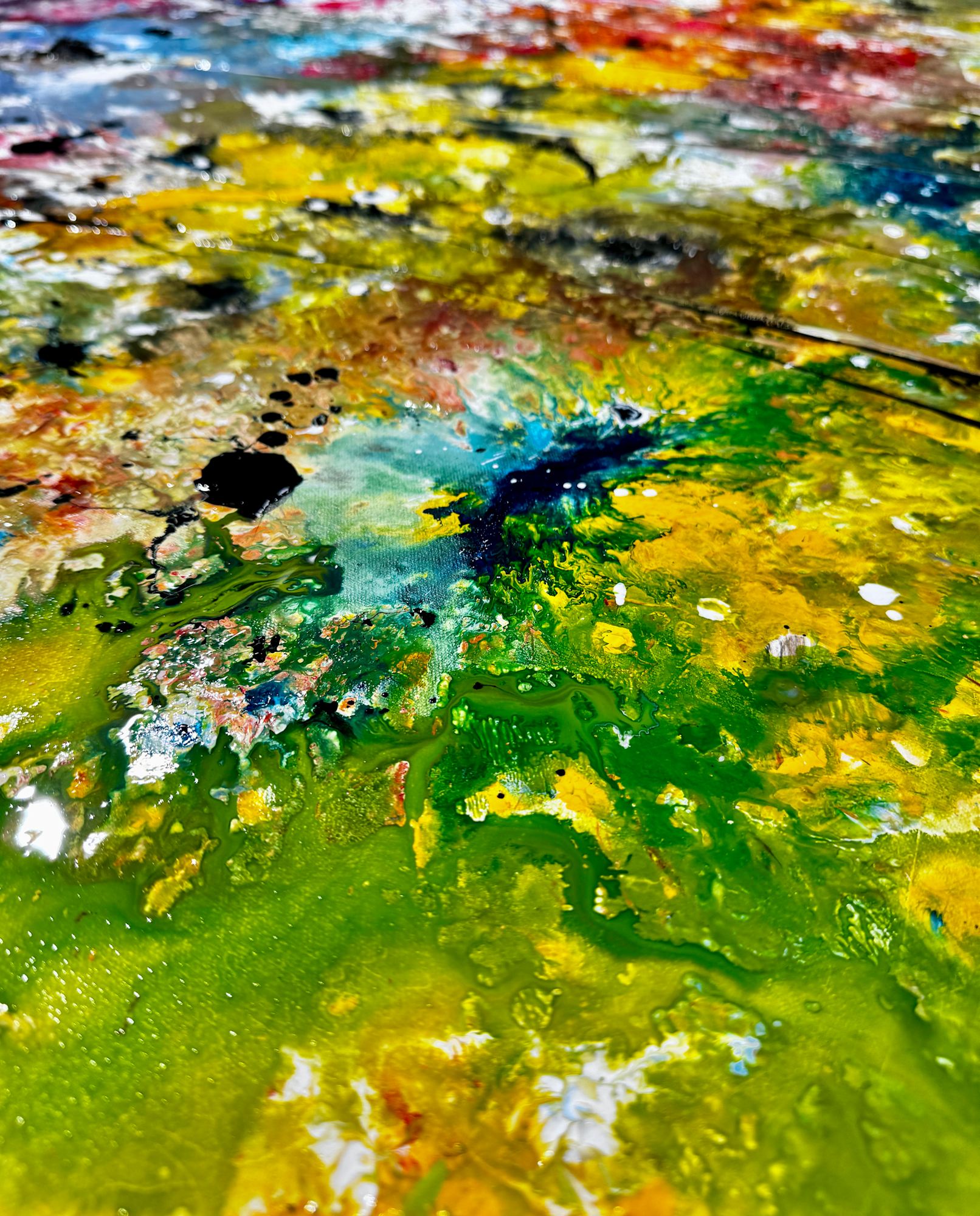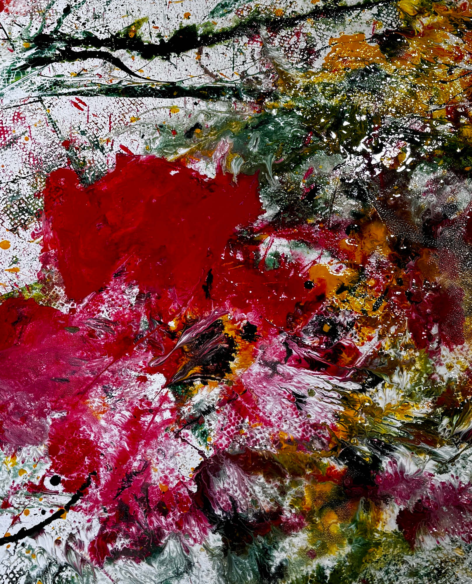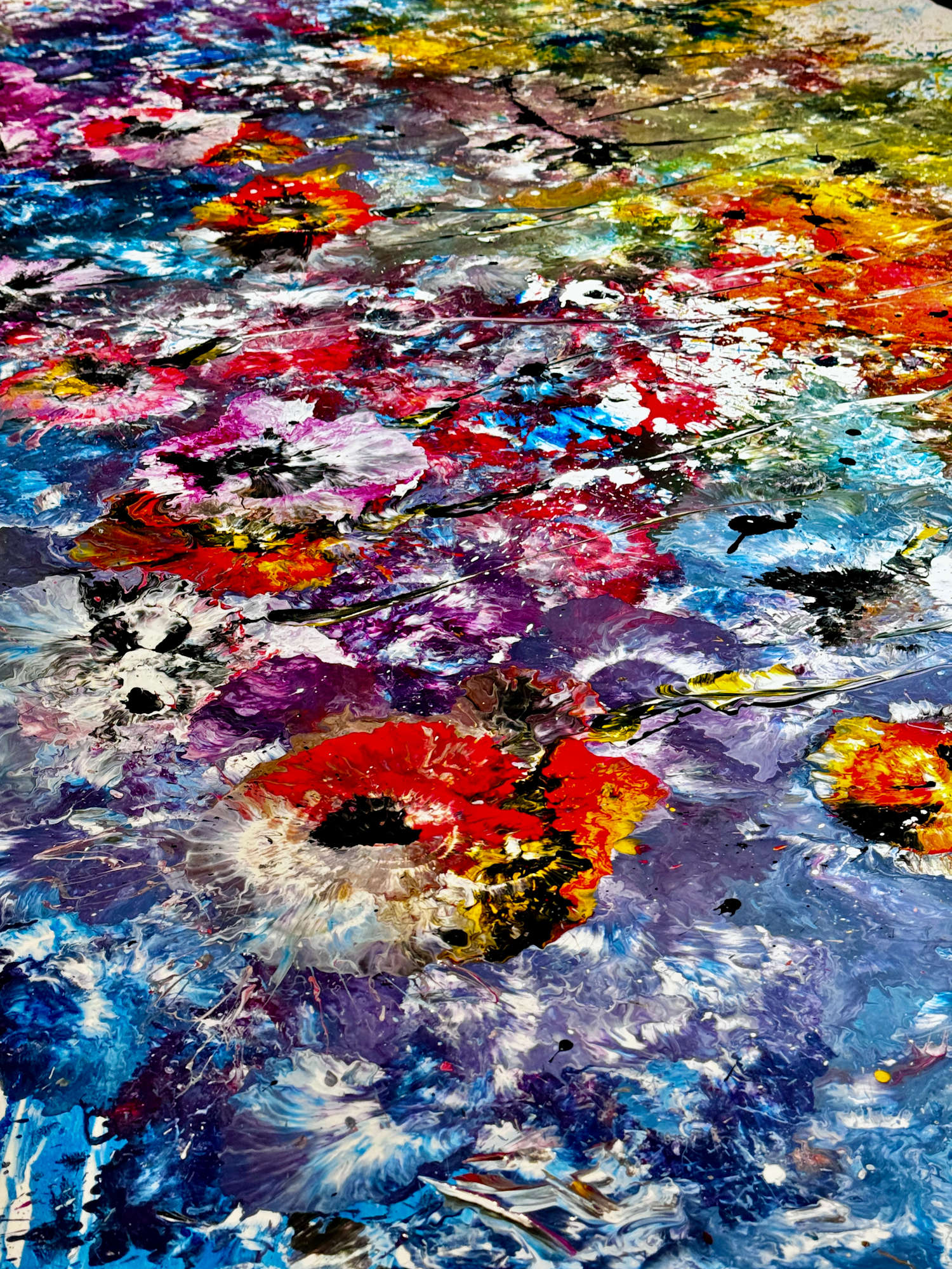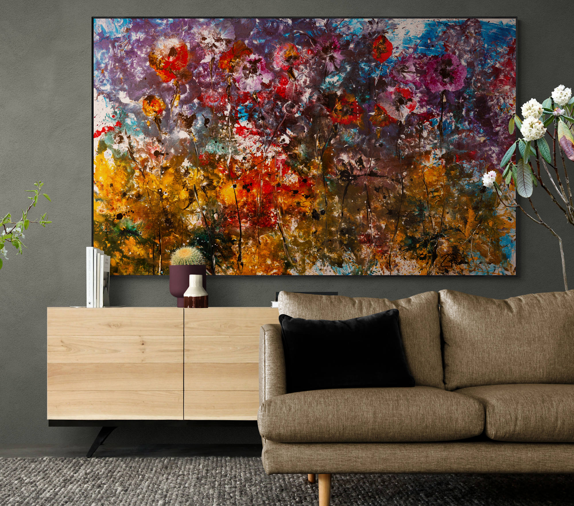 "Indian Summer" is a striking exploration of nature’s vibrant palette, captured on a grand scale with its 50 x 78 dimensions. This acrylic on hand-stretched canvas masterpiece invites viewers to dive into the exuberant dance of colors and textures that embody the essence of an abstract expressionist floral composition. The piece bursts with life and energy, using bold brushstrokes to convey an impression of wildflowers that seem to sway in a gentle breeze.
