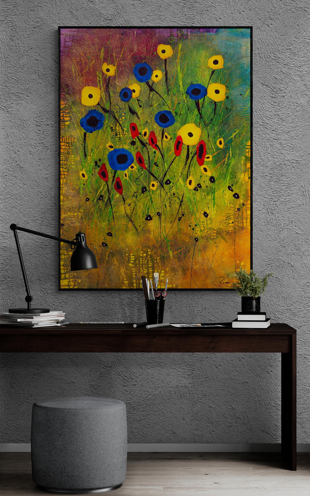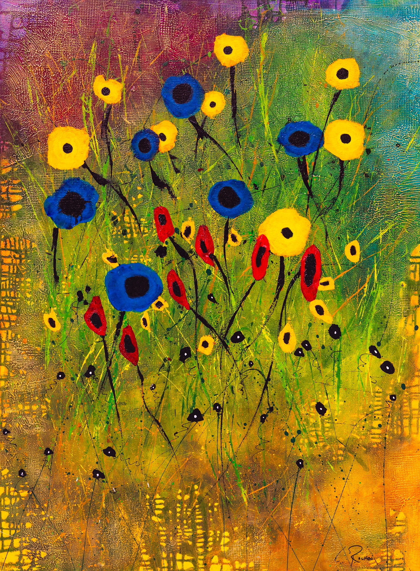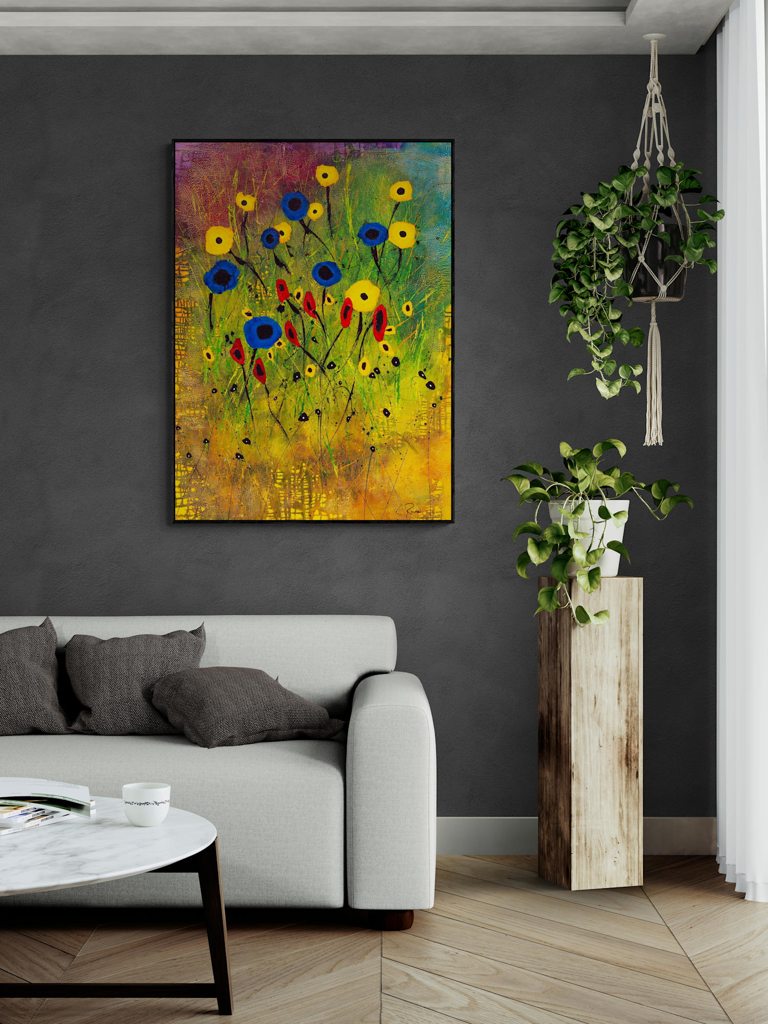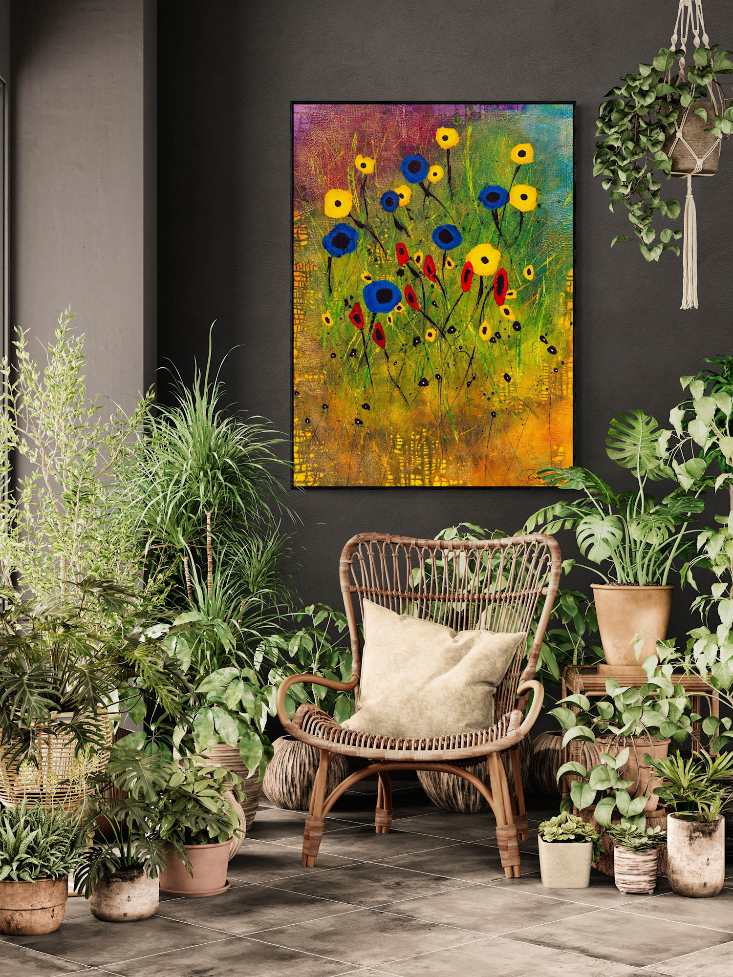 This meadow hums with energy. Bold blue, red, and yellow wildflowers rise from a tangled green backdrop, each one reaching like it has something to say. It’s vibrant, untamed, and full of quiet drama.