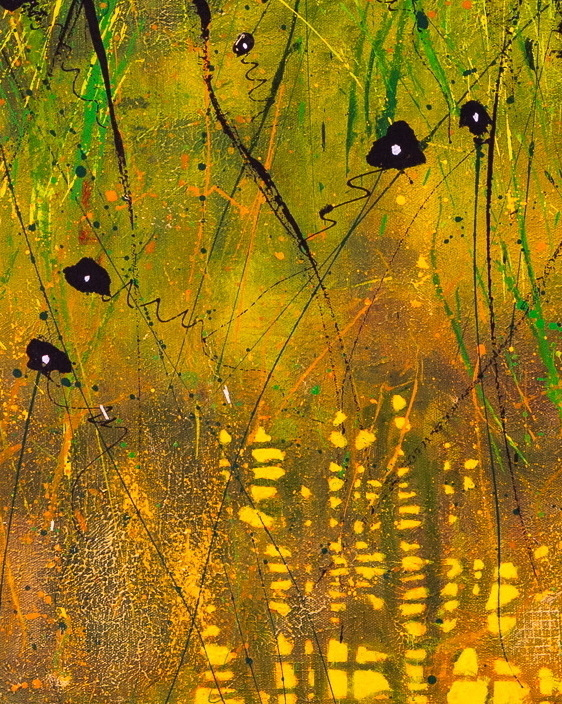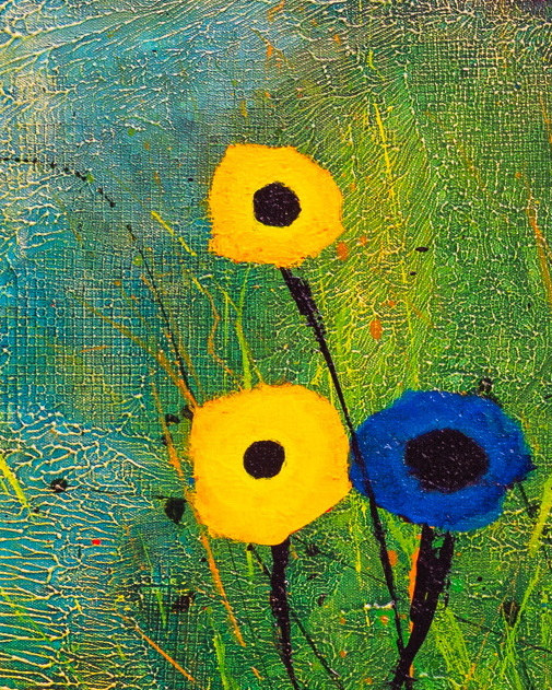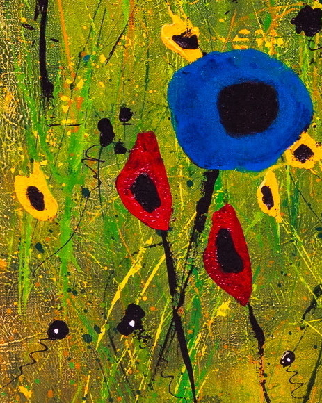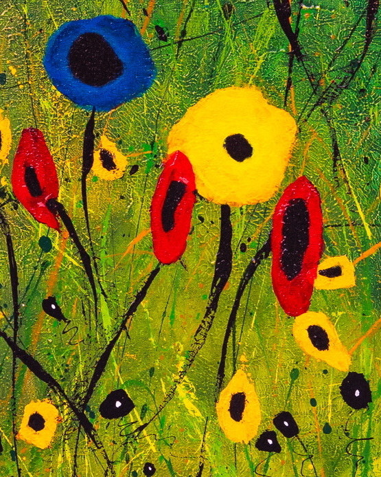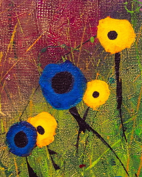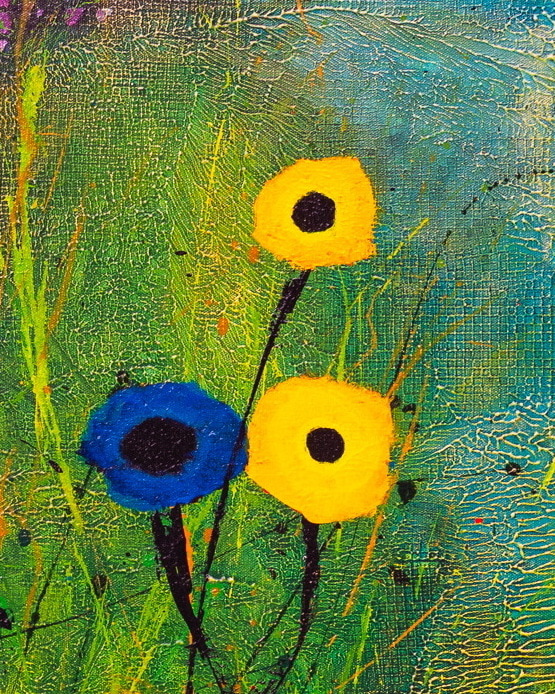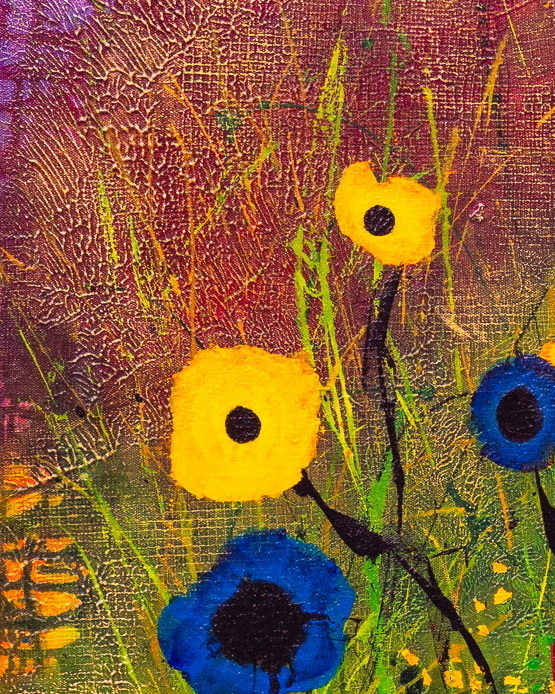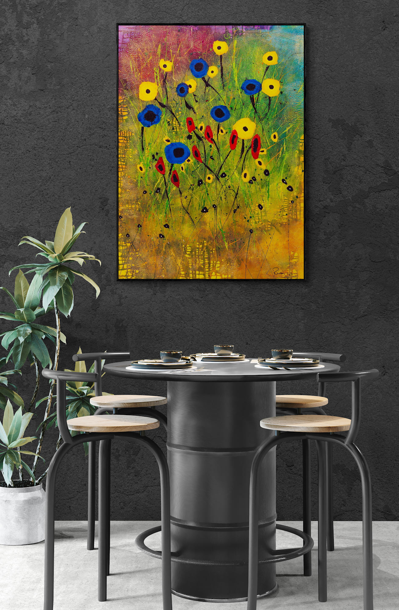 This meadow hums with energy. Bold blue, red, and yellow wildflowers rise from a tangled green backdrop, each one reaching like it has something to say. It’s vibrant, untamed, and full of quiet drama.