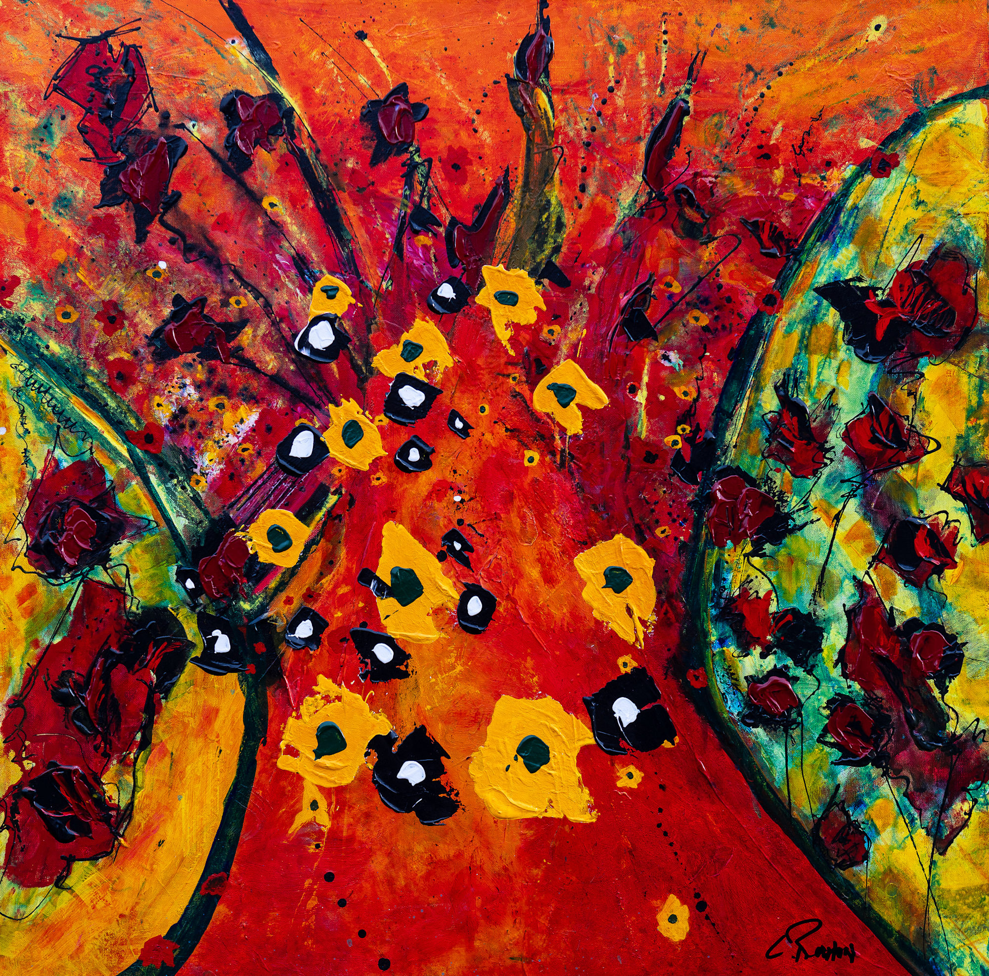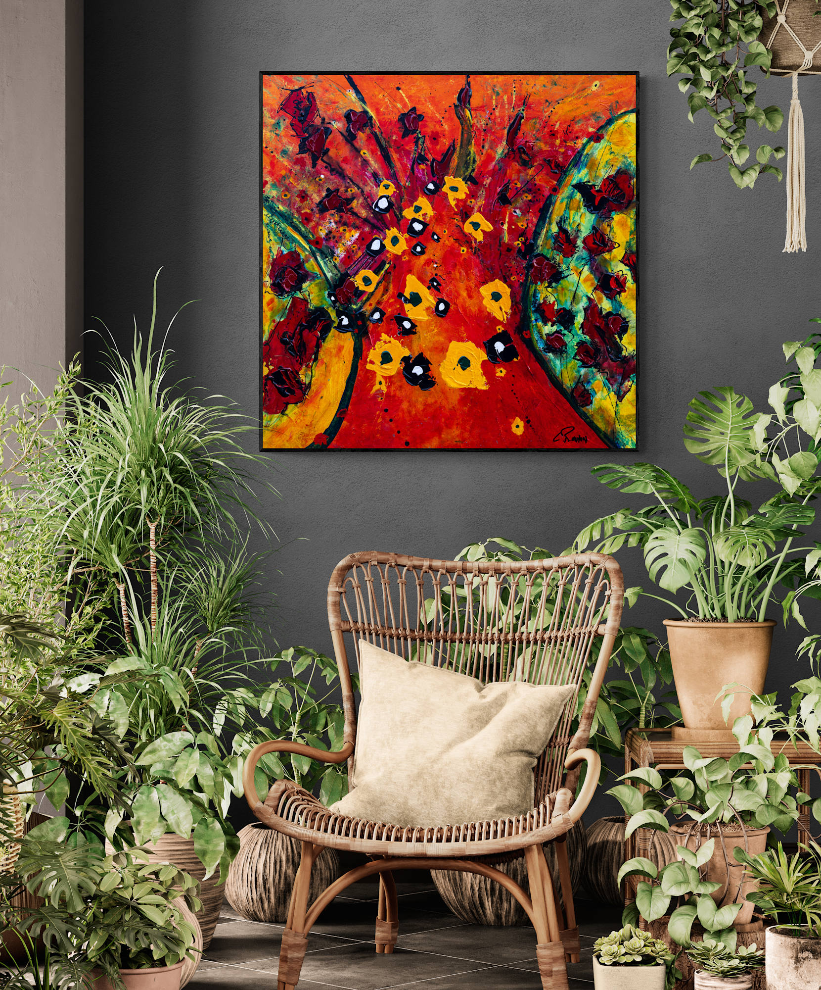 Discover the vibrant energy of "Kona," a captivating 36" x 36" acrylic on canvas artwork inspired by the breathtaking landscapes of Hawaii. This piece bursts with dynamic reds and oranges, reflecting the island's natural warmth and vitality. Fluid swirls and patterns dance gracefully across the canvas, with bold hints of yellow and green adding a lively contrast to the color scheme. These elements merge to capture the fiery essence of the tropical setting.