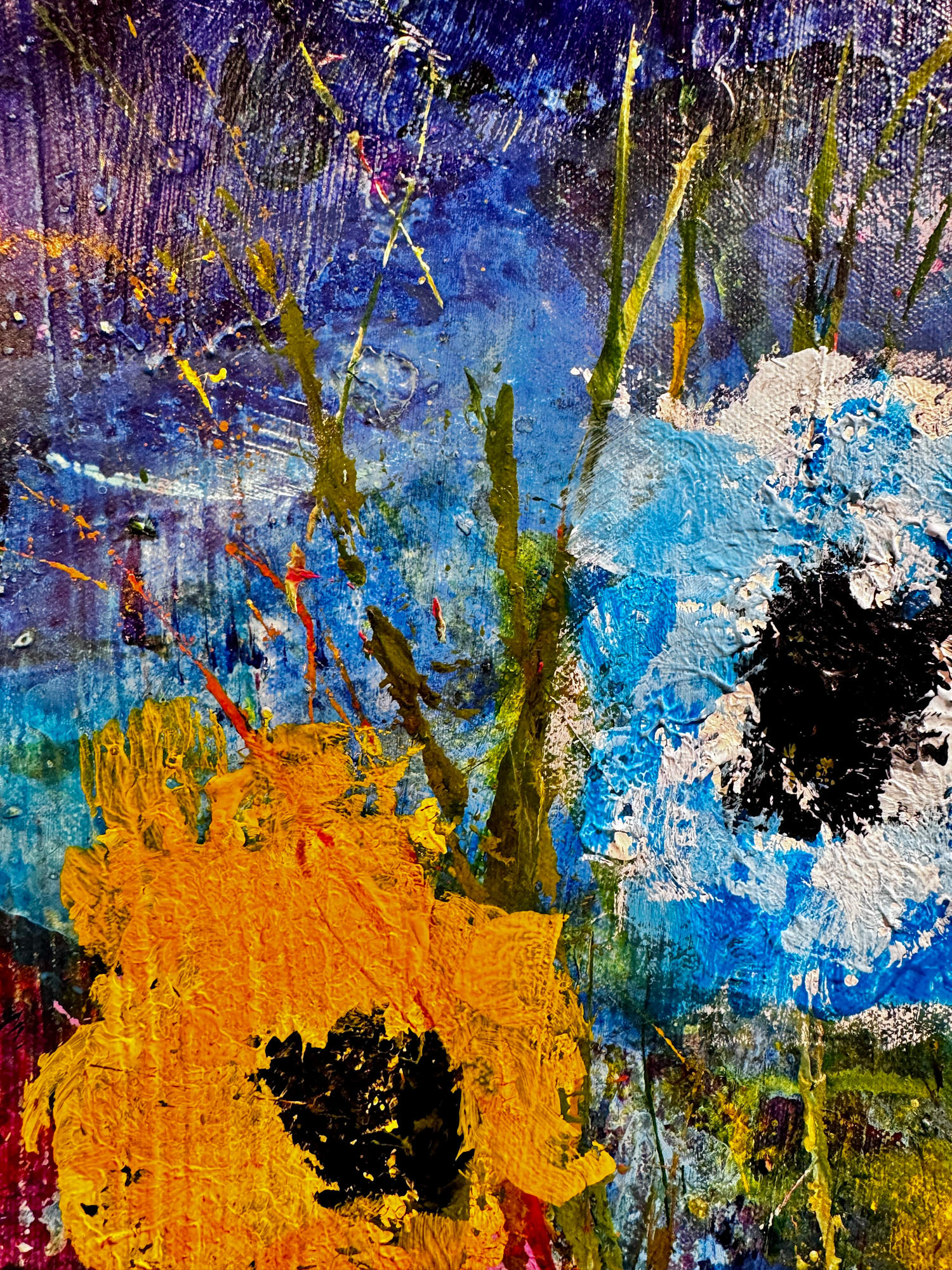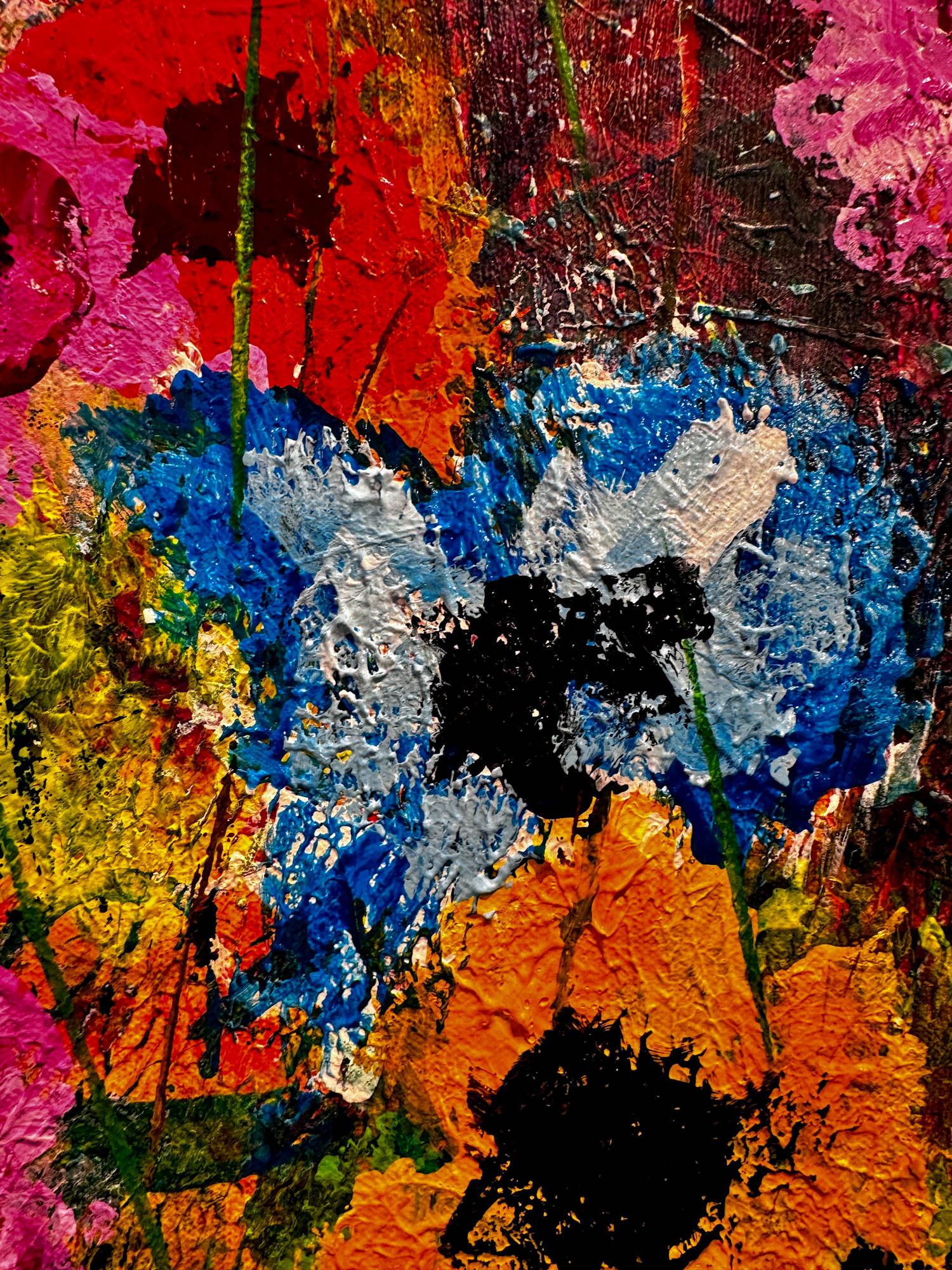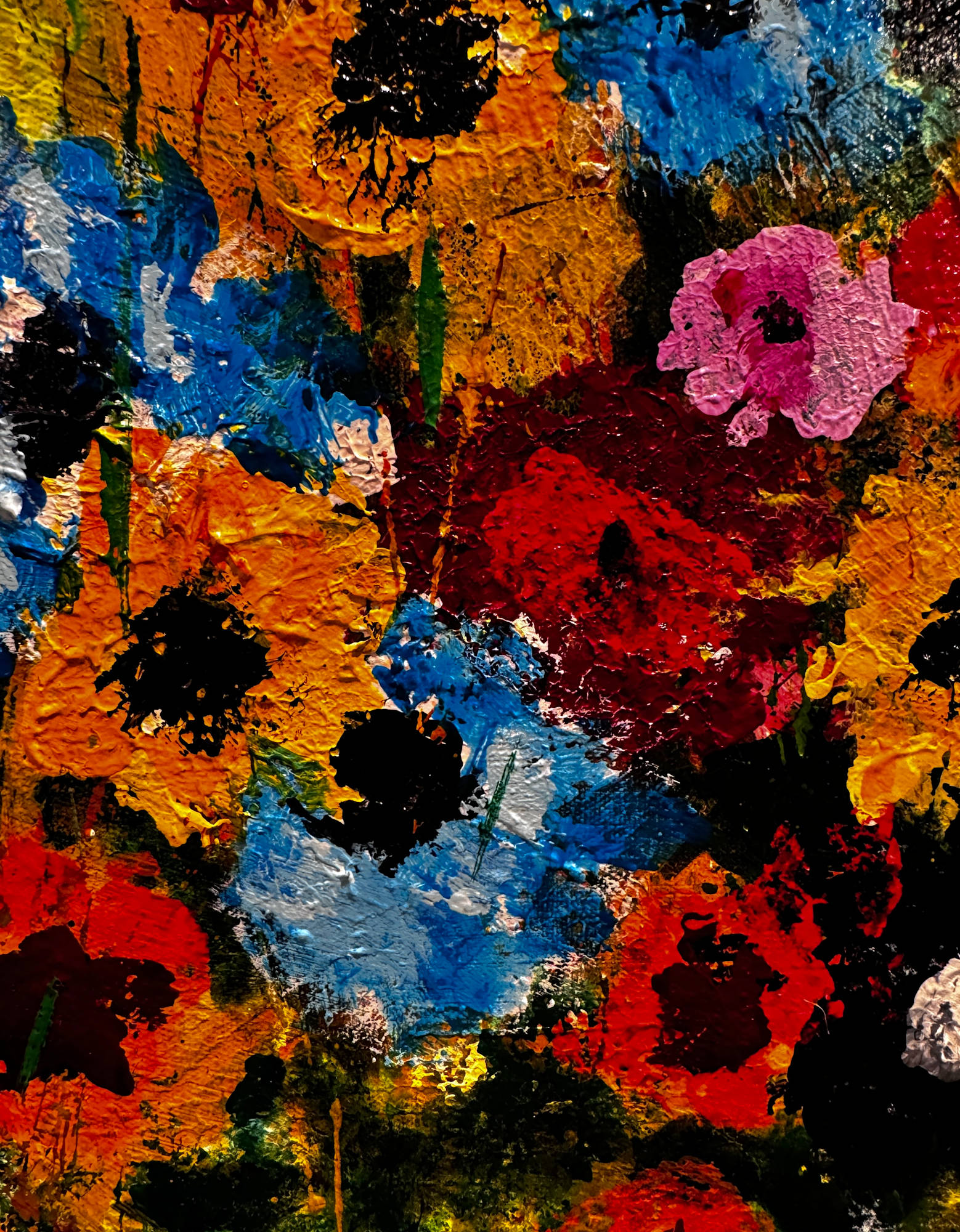 Crafted with bold, expressive brushstrokes, the painting captures the vivid spirit and diversity of its floral subjects, imbuing the canvas with a lively and dynamic energy. The use of heavy palette work and layers of acrylic glazes adds depth and texture, enhancing the piece's immersive quality. Inspired by a profound love for wildflowers—their unfettered beauty and natural spontaneity—this creation is a heartfelt tribute to the boundless splendor and freedom of nature, stirring a deep emotional connection to the uncontainable joy it represents.