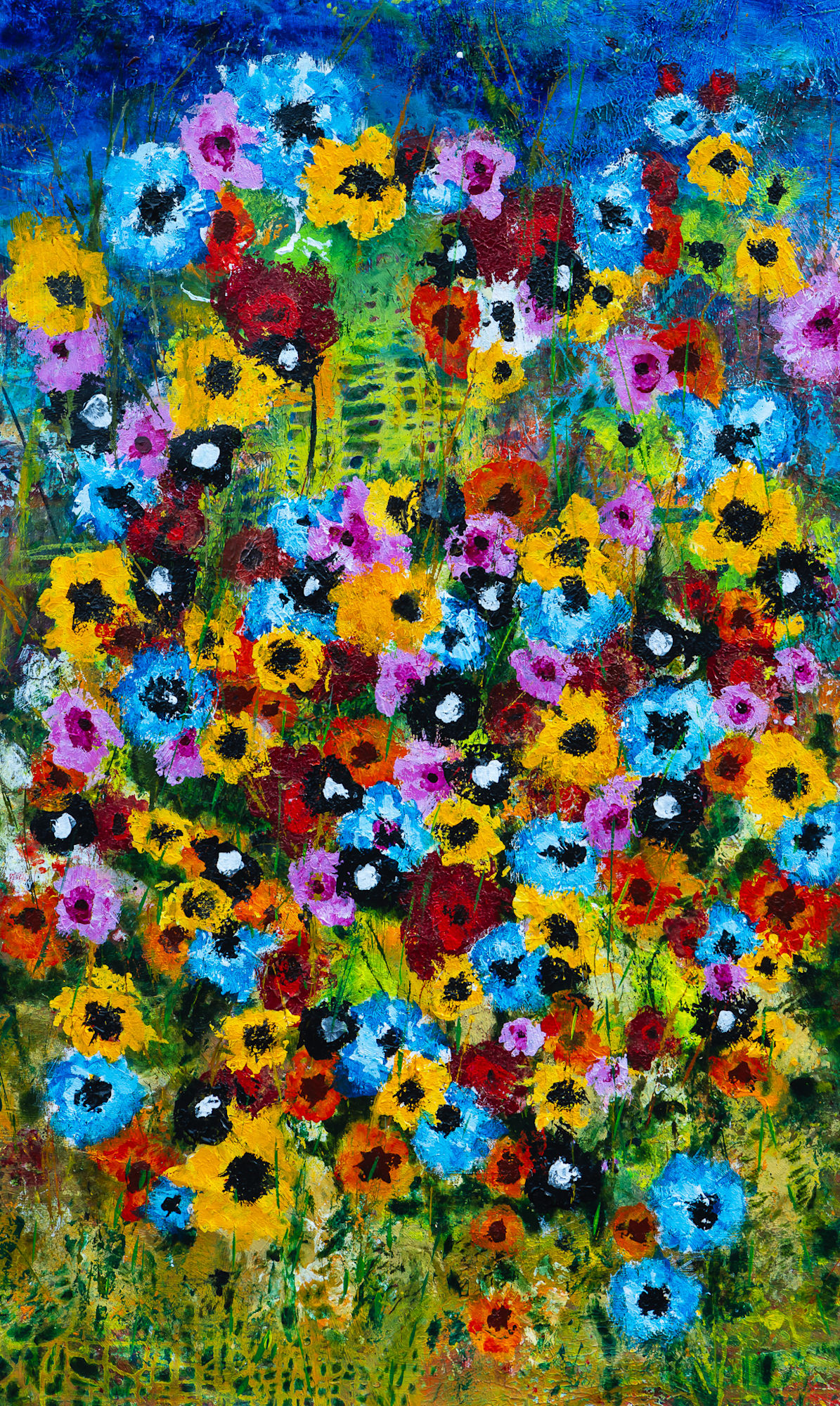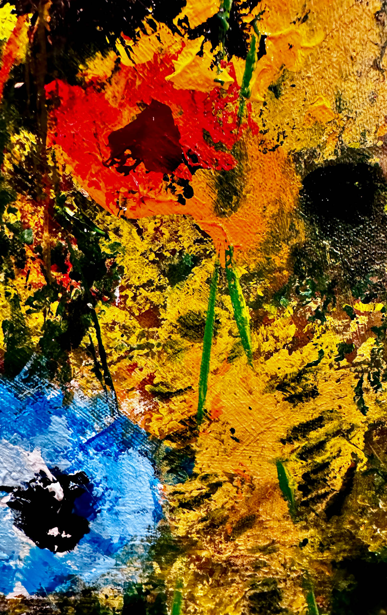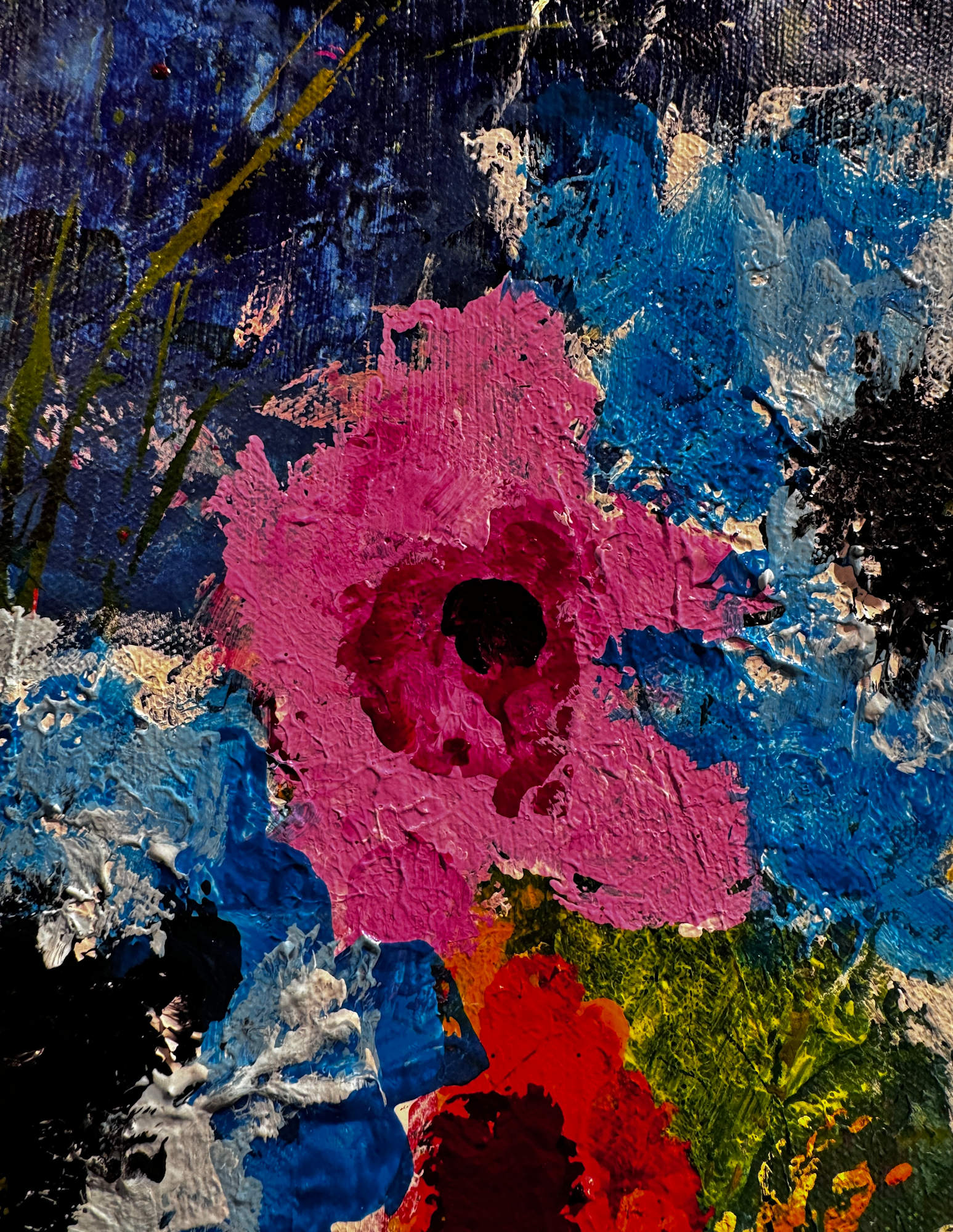 Crafted with bold, expressive brushstrokes, the painting captures the vivid spirit and diversity of its floral subjects, imbuing the canvas with a lively and dynamic energy. The use of heavy palette work and layers of acrylic glazes adds depth and texture, enhancing the piece's immersive quality. Inspired by a profound love for wildflowers—their unfettered beauty and natural spontaneity—this creation is a heartfelt tribute to the boundless splendor and freedom of nature, stirring a deep emotional connection to the uncontainable joy it represents.