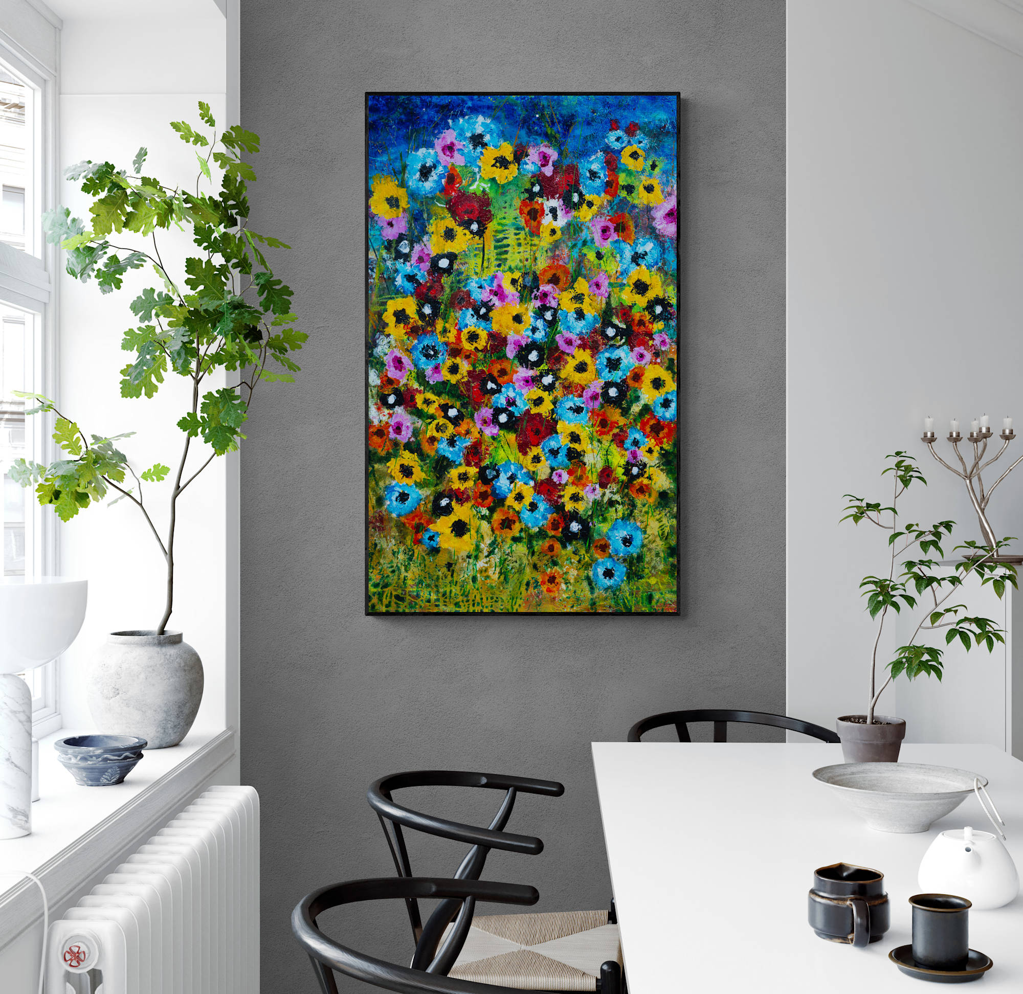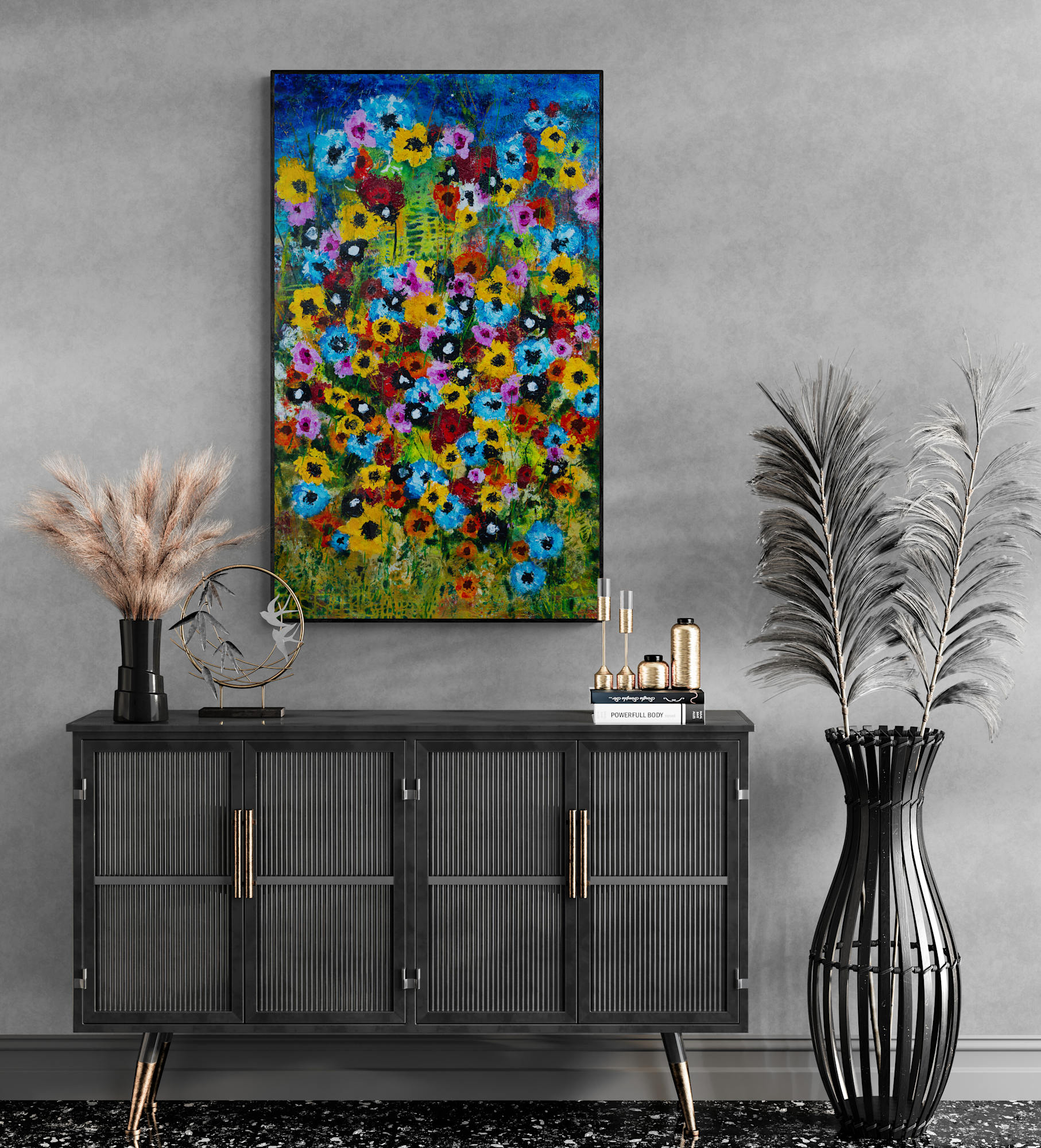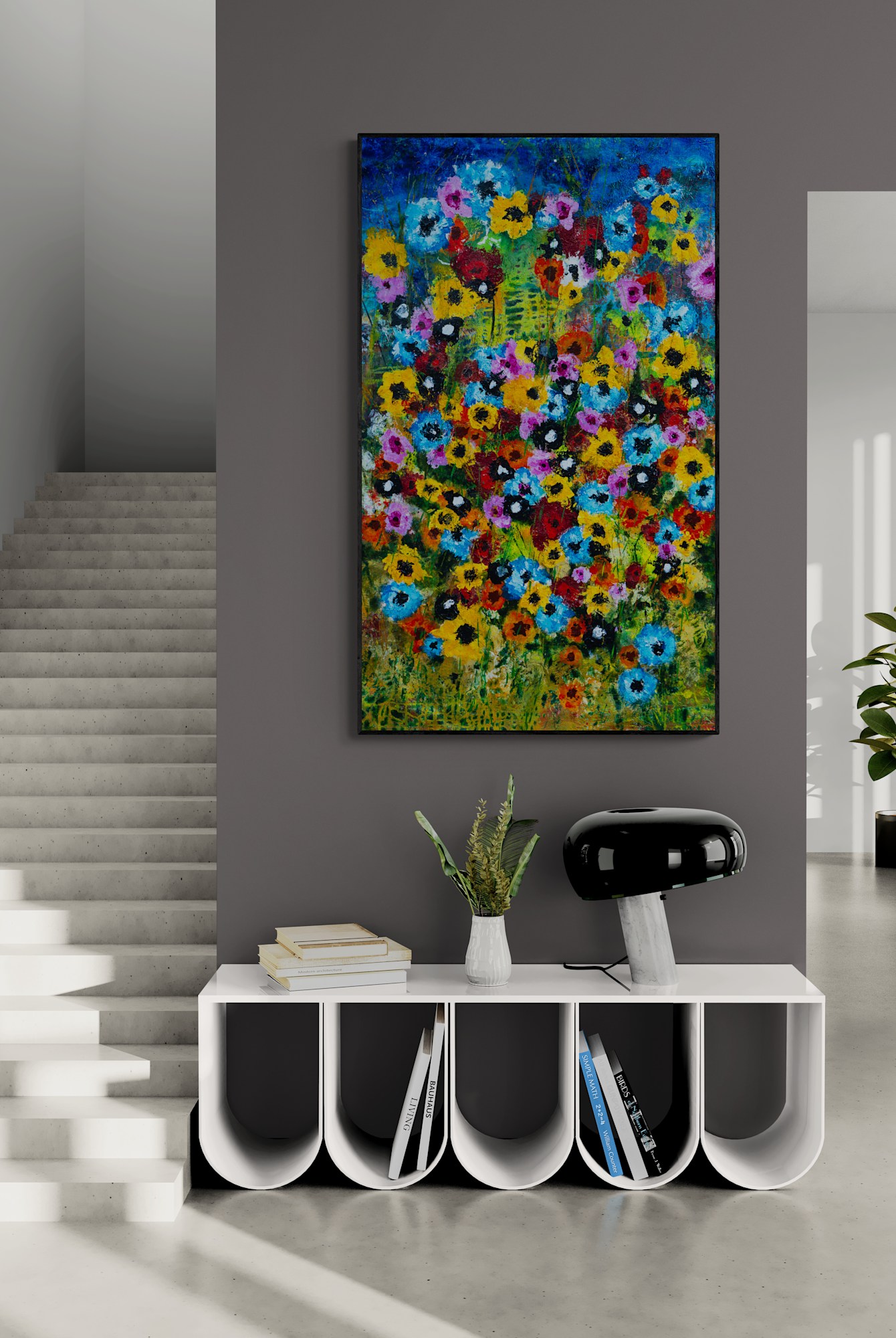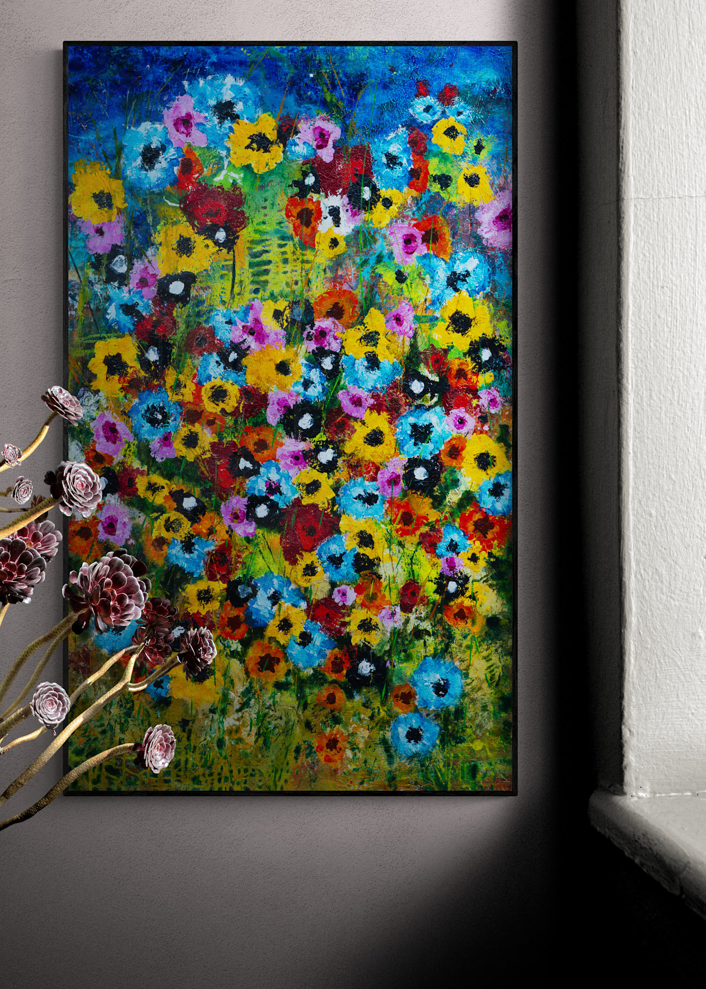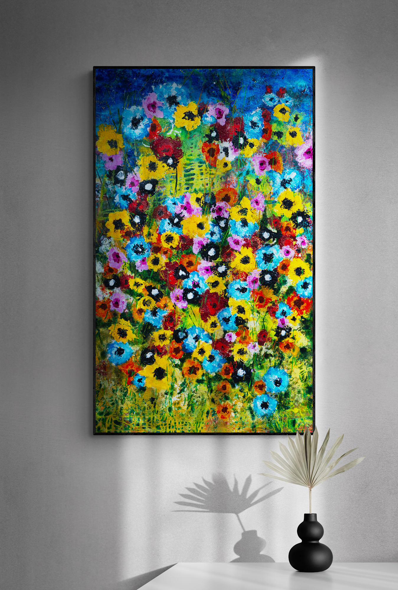 The artwork titled "Les Jardins" is an exuberant expression of nature's vibrant soul, vividly alive on a large 50" x 30" canvas. This breathtaking painting unfolds a mesmerizing field of flowers, each bloom exploding with a symphony of colors—radiant yellows, deep blues, fiery reds, soft pinks, and majestic purples. The tightly packed blooms form a visual harmony that captivates the heart, inviting an emotional journey through its intricate details.
